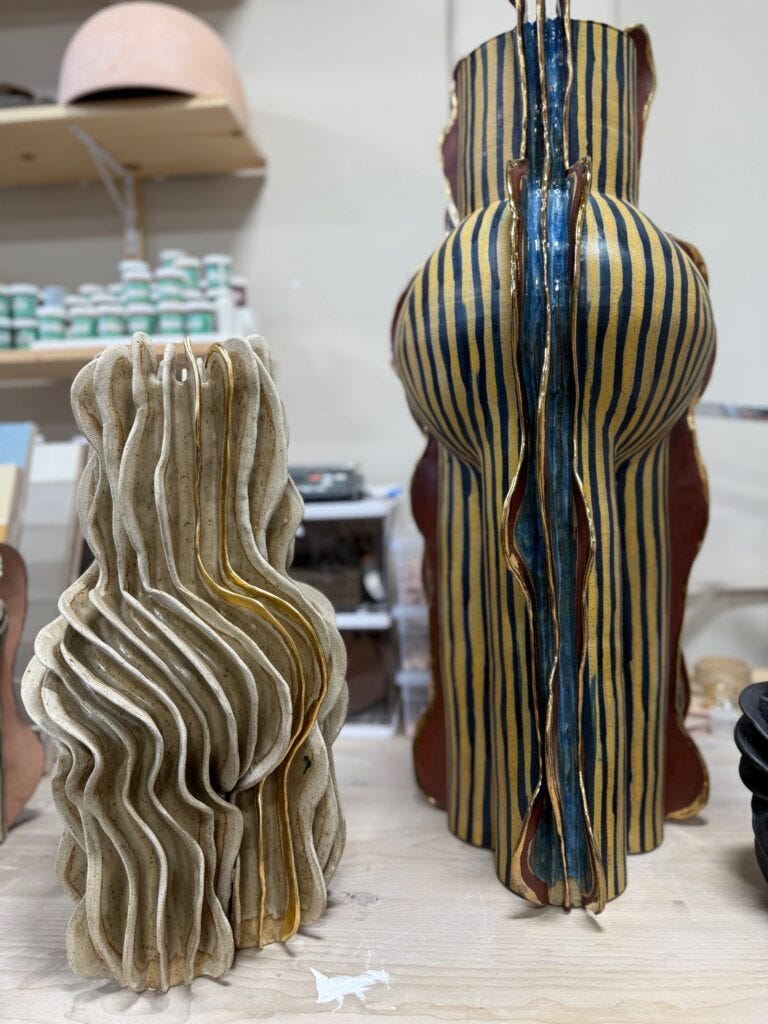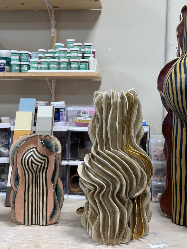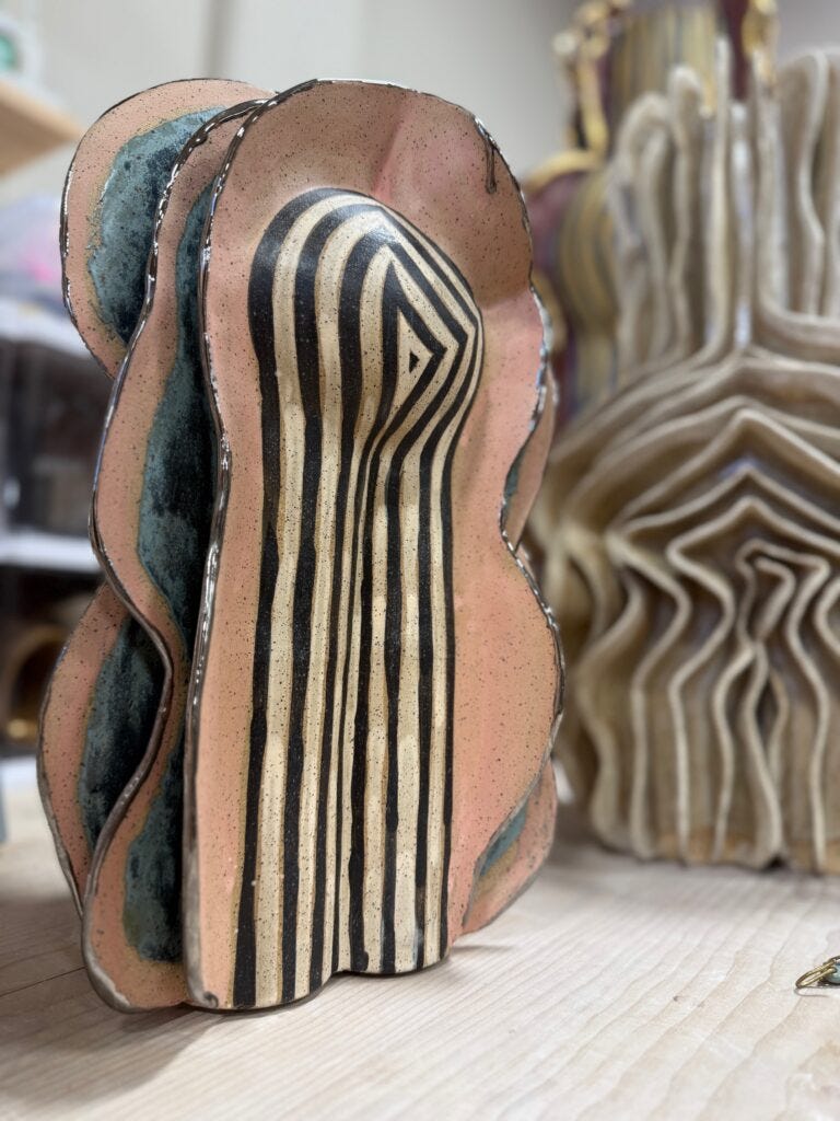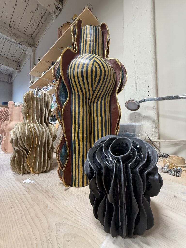 In the world of contemporary pottery, Jeremy Anderson has been doing things his own way. His sculptural vessels and lamps look like living creatures, often dressed in stripes, at times appear cartoonish, abstract, or primitive. These have recently gained admirers within the collecting design market. They are packed in chubby bodies, often wearing a hat or a dress and, or have their own expressive face. When you see them as a group, you think that they are performers in the circus or creature in a fantasy world of a science fiction film. Visting Anderson’s studio in Red Hook, Brooklyn last week, was a spectacular opportunity to dive into his unique world.
