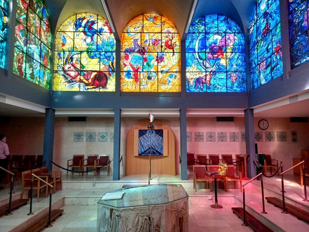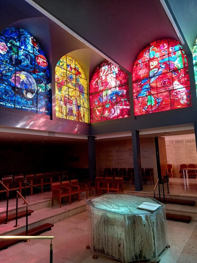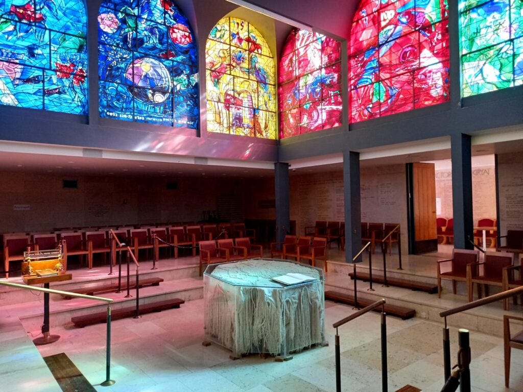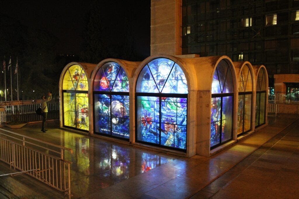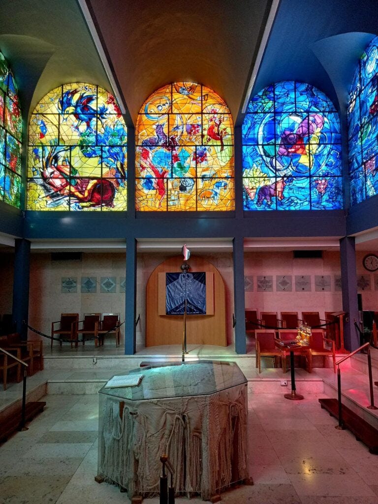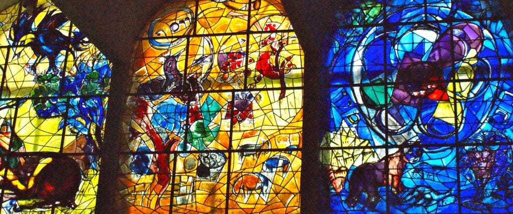 Wow! Anyone who visits this art installation, situated in the most unexpected spot in Ein Kerem—the picturesque village on the way to Jerusalem—simply ‘wows.’ It is one of Israel’s most magnificent art installations, with a magical history, and a narrative that touches the hearts of those experiencing it. Getting to the 12 stained-glass panels—created by Belarusian-French artist Marc Chagall (1887-1985)—requires walking through the long corridors of the Hadassah Medical Center, the famed research hospital, founded by the Women’s Zionist Organization of America. Walk through the main entrance, and when you arrive at the Oncology department, there, tucked away in a small synagogue, you will find these biblically-inspired windows, installed by the artist, surrounding the sanctuary. It was, in his words, a “modest gift to the Jewish people.” Before they were installed in their permanent home, in 1961, they were exhibited in both the Louvre in Paris and at the Museum of Modern Art in Manhattan.