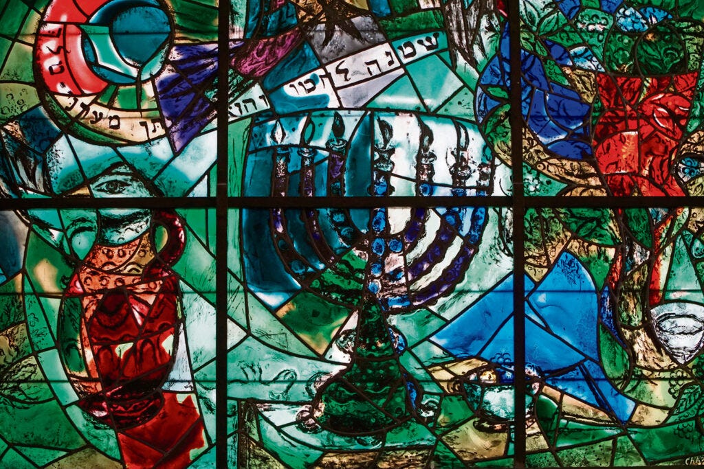 12 arched stained-glass windows in brilliant colors, depict the Biblical Tribes of Israel, the 12 sons of Jacob – Reuben, Simeon, Levi, Judah, Zebulon, Issachar, Dan, Gad, Asher—filled with their narratives and symbolism as described in Genesis. Reds, blues, oranges, yellows, and greens are shining in the beautiful visual vocabulary describing the biblical text in Chagall’s distinctive language, capturing his own memory of his early life in the Russian shtetl of Vitebsk.