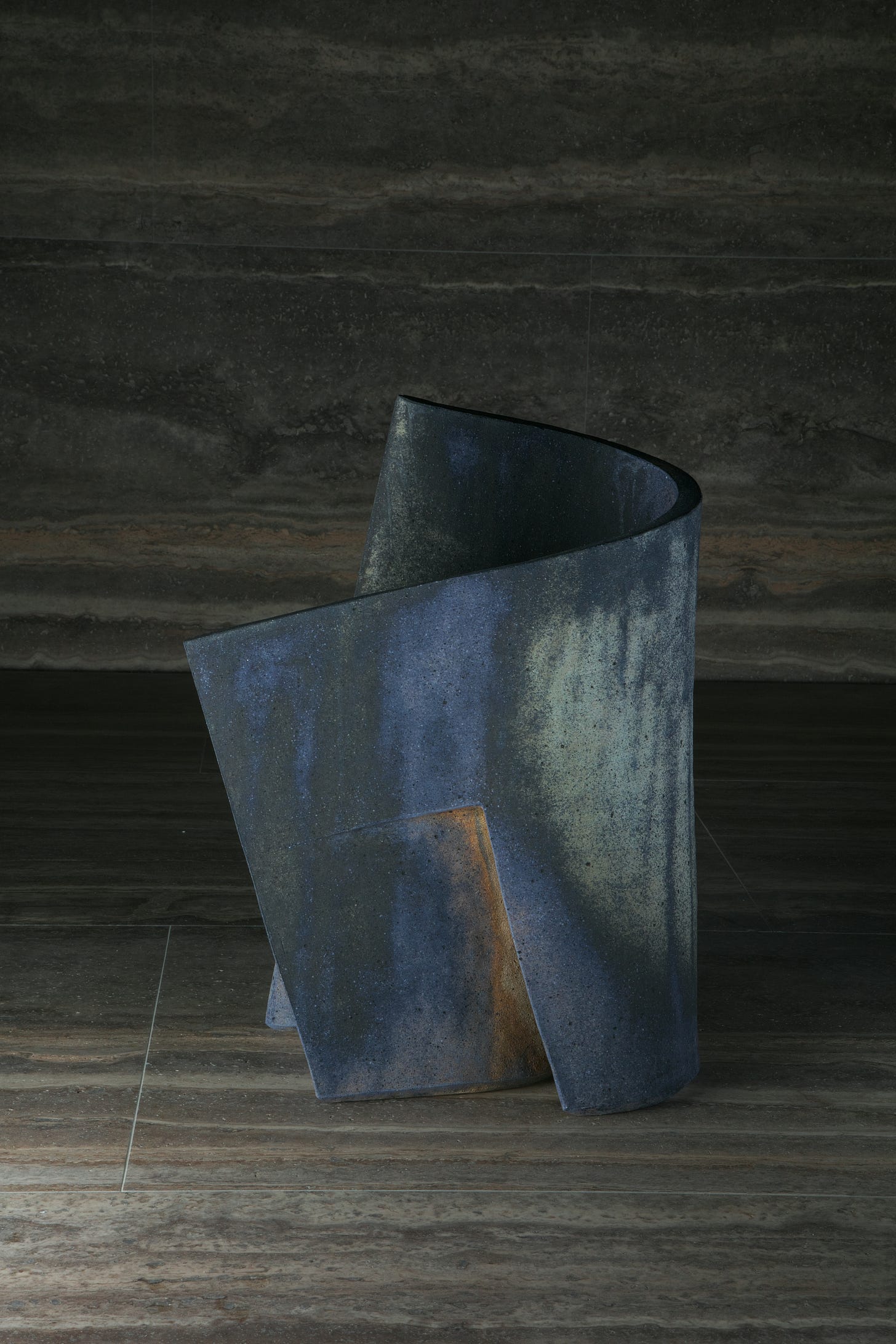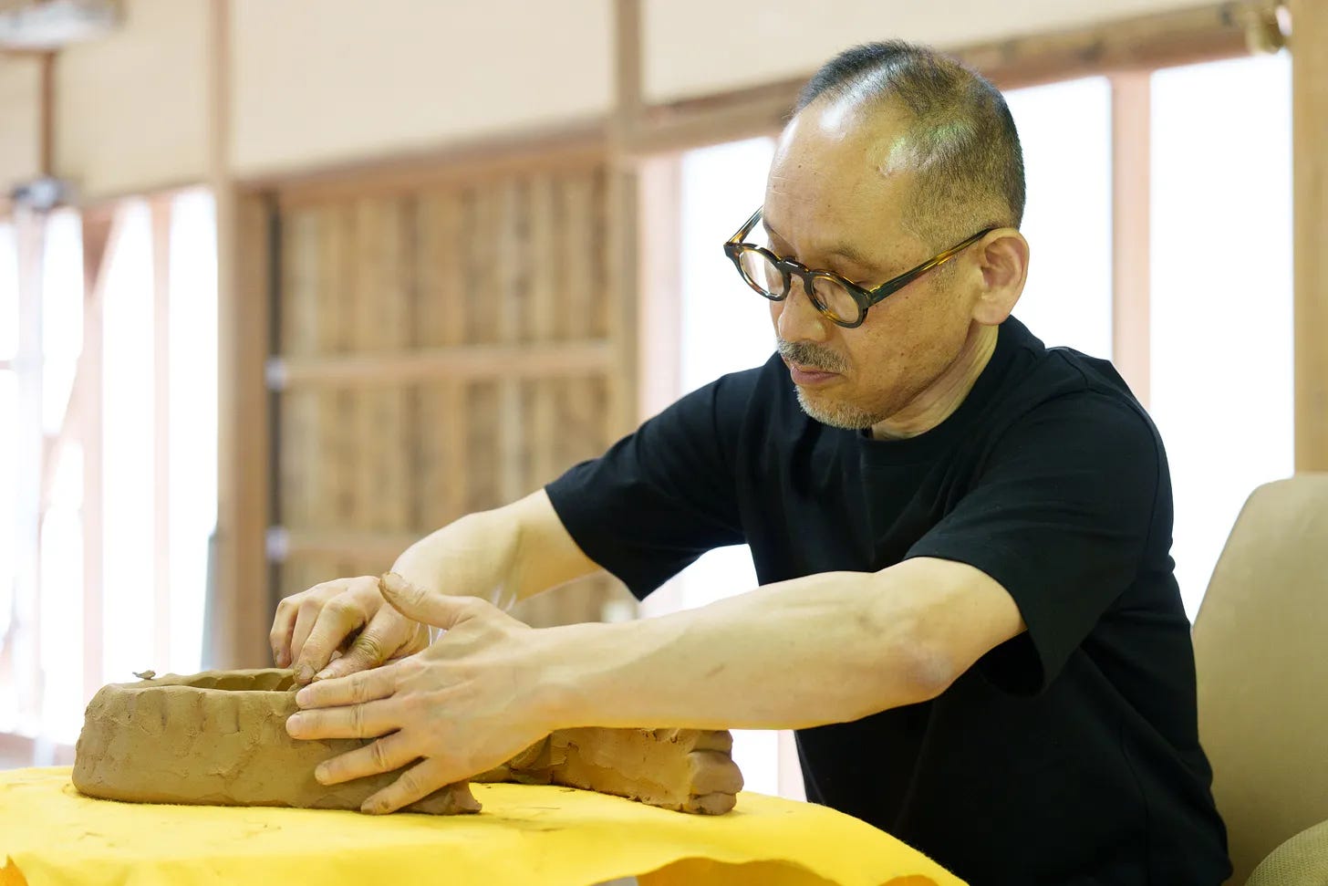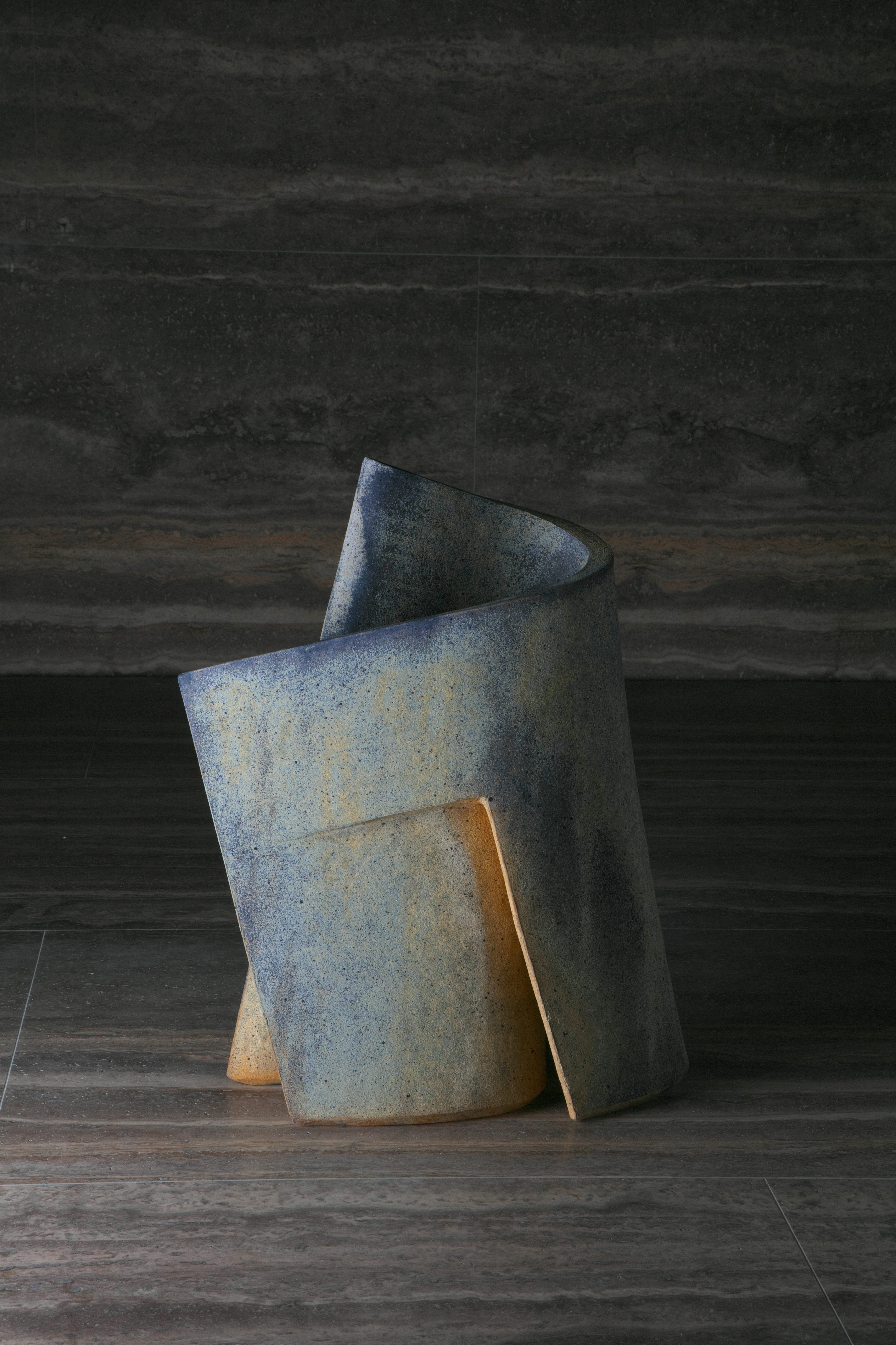 When I was in Izumo on the western coast of Japan during the summer, I visited the studio and home of Japanese ceramicist Ken Mihara. I was fortunate enough to witness him working on his next solo exhibition at the Tokyo-based gallery named A Lighthouse called Kanata. Now that the exhibition is opening, it is possible to see him present his series Kyo (Echoes), which includes the exquisite pieces on which he worked at his studio in the summer. The new forms, which capture the landscape of his hometown, embody his signature while adding new dimensions and layers to his existing oeuvre. Mihara, one of the leading voices in contemporary Japanese ceramics today, has forged his language by hand-building his abstract sculpturesin coils, blending them together into surprising, somewhat architectural forms, and by allowing the clay itself to speak without adding glazes or any other coating.