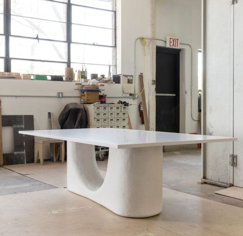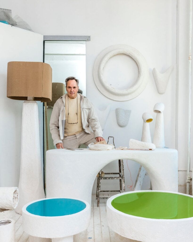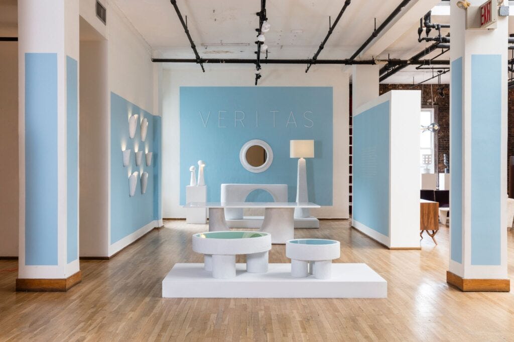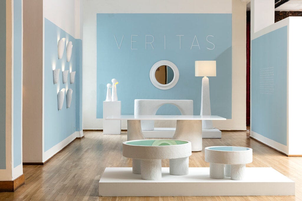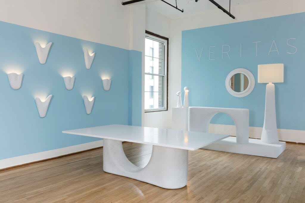 The soft, organic forms emphasize Mindel’s life-long philosophy—that furniture has the power to introduce warmth and affection into any modernist interiors. The pieces, all made in platerglass, were crafted at the studio of Ralph Pucci as a part of the artist-in-residence program, working alongside artisans and master sculptor. The series is currently housed in the stunning showroom of Ralph Pucci at West 18th Street, in an exhibition entitled “Veritas,” Latin for “truth.” Honesty has a key place in Mindel’s taste and process of thinking, in accordance with the legacy of the Modern Movement, as taught and adopted at his alma mater, Harvard Graduate School of Design, where Mindel completed his master’s degree in architecture in the 70s.