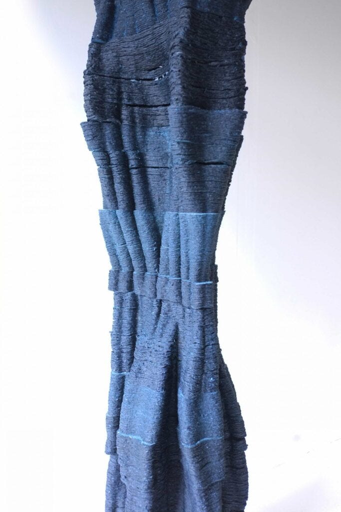 This exhibition is beautifully situated in the West Wing of MoMA, which hosted some great designt show in recent seasons. Some of the objects have been seen before, such as Nendo’s Cabage Chair of 2007, and my beloved Sweeper’s Clock by Maarten Baas, but the new examples are more surprising, fascinating, and to current time. What interests me mostly is how designers today respond to issues such as the climate crisis and the shift in resources. I therefore was delighted to see Fernando Laposse’s Totomoxtle; Adhi Nugraha’s Cow Dung lamp built from manure collected from the streets of Indonesia; bricks made from waste, an enormous and beautiful panel made of coconut shells and mushrooms, Christien Maindertsman’s Acoustic Fur made in felt and textile remnants; Neri Oxman’s 3D glass vessels; and Studio Swine’s stool in sand-cast aluminum. I wish some other examples that are current and contemporary would have been included, such as the furniture by London-based blast studio, made from waste & living organisms (below is its ‘Blue Tree,’ a 3d printed column made from used coffee cups dyed with a natural blue pigment shaped into an organic trunk); the vegan sneakers by Saye; or Erez Nevi Pana’s glaze made in cashew nuts and utilized to cover objects made from waste. The materials presented in the show from the early part of the century were seen and some have become outdated.