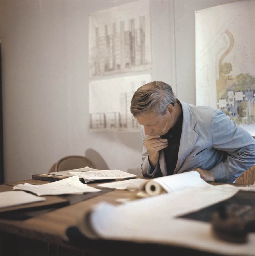 Louis Kahn working on Fisher House design, 1961 © Louis I. Kahn Collection, University of Pennsylvania and the Pennsylvania Historical and Museum Commission