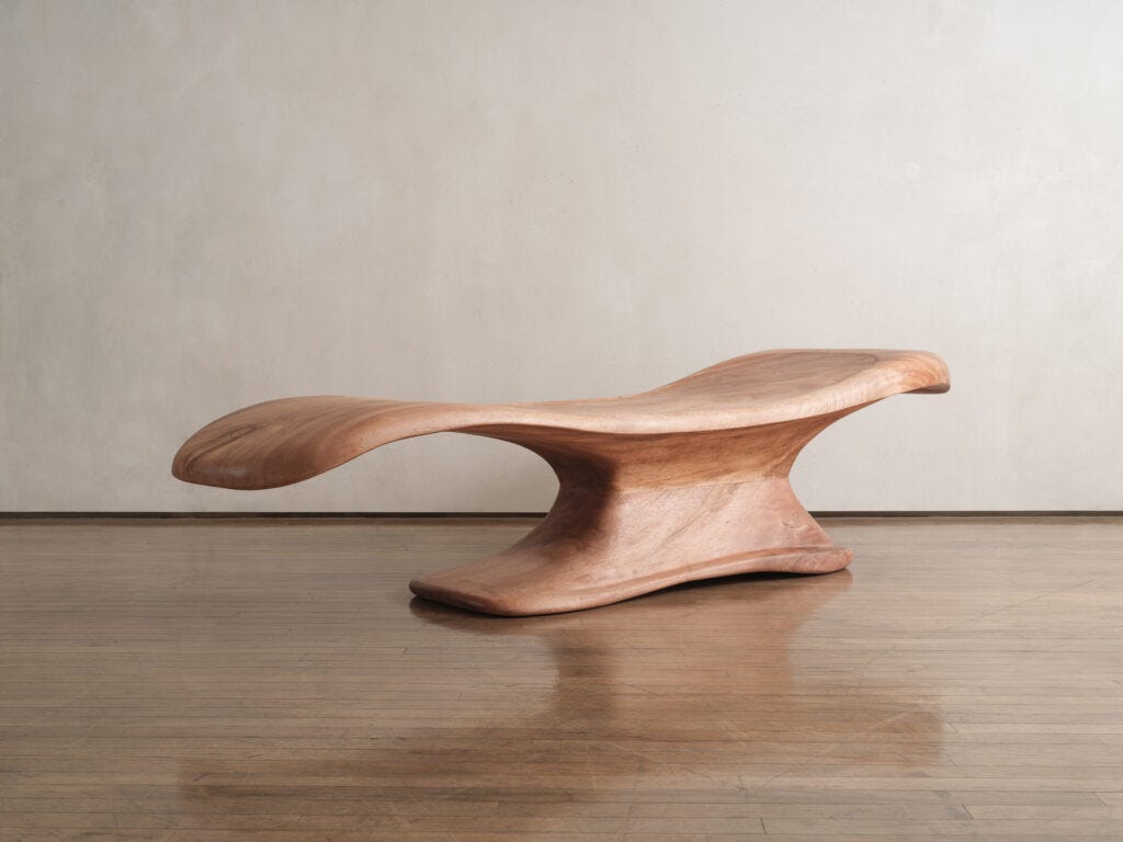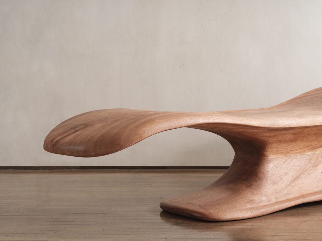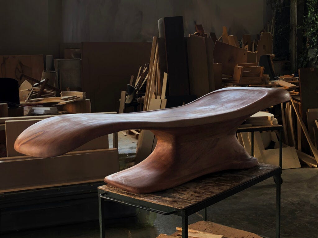 Although Mori worked with the Italian furniture company Capellini in the past, since opening his own atelier in 1998 he has devoted his efforts exclusively to making Art Furniture. He works with the materials in their places of origin while preserving the authentic character and personality of the materials. He chooses each block and takes time—sometimes years—to fully realize a new piece, with each carrying his unique spirit. Mori travels to Seychelles twice a year to select the wood for his piece. Working with Albizia Rosa Wood is the perfect fit, because this subtropical tree was introduced in the Seychelles around 1910 for reforestation and timber production but has since become invasive, thus cutting them down is desirable. After cutting the tree and starting to shape the piece, he sends the wood back to Milan where the remaining work will take place.