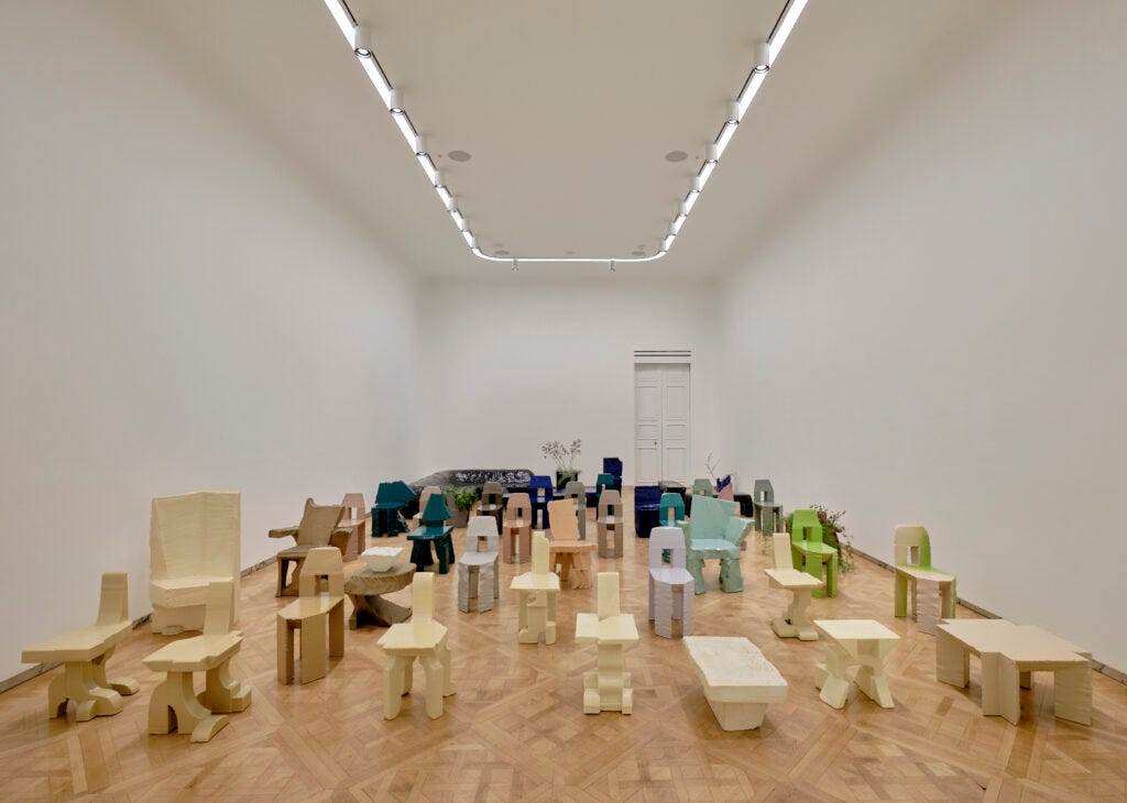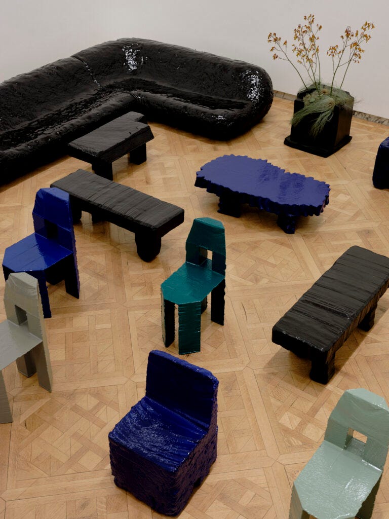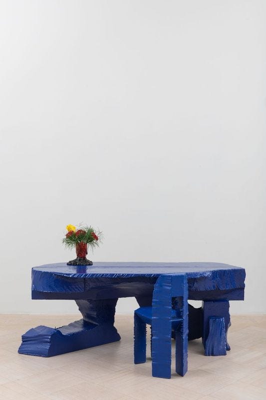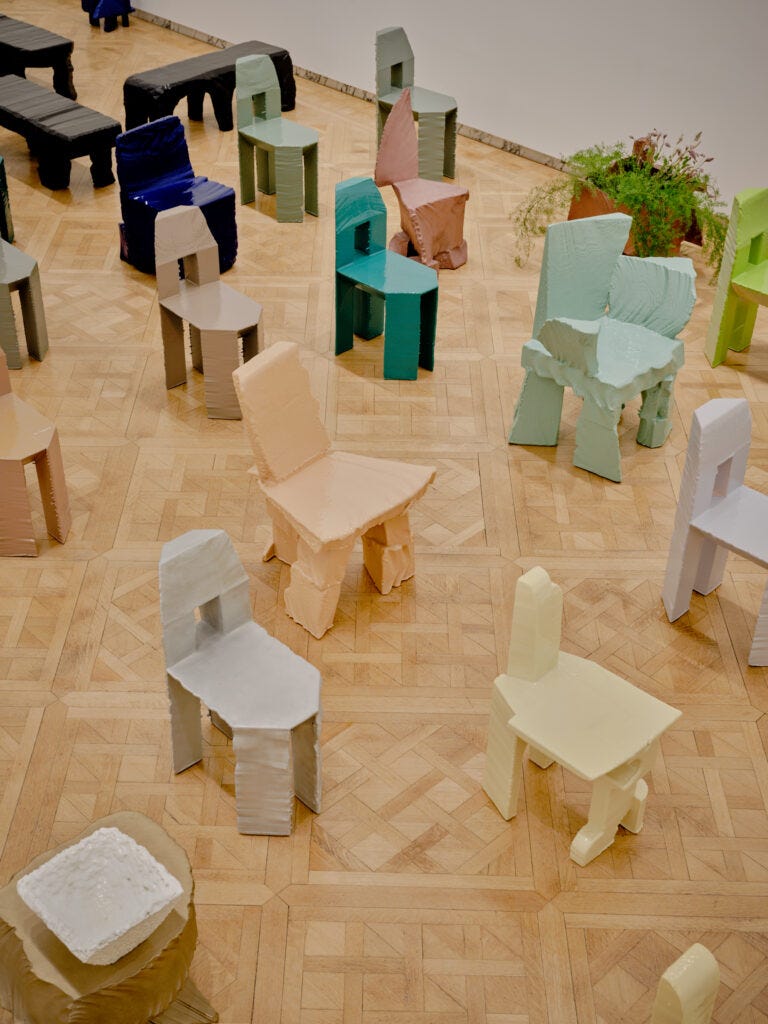 The ground floor of the gallery is devoted to Lamb’s work in stone, where the pieces are arranged in a beautiful composition of marble, bluestone, and granite; colorless and sensual. On the second floor there is an enormous installation of Lamb’s Poly furniture series, colorful pieces carved by hand from blocks of foam and coated with a polyurethane rubber. Lamb told me about the days in which he would load his truck with pieces of furniture and drive from his home-studio in London to Devon early in the morning to work on spraying the pieces, and then drive back late that night. I particularly loved the pieces in clay and wood which I had never seen before; Lamb worked at an artist residency in the Northern California home and studio of JB Blunk, the famed sculptor who is known for his expressive works in wood. Here, Lamb dug up clay from the site and processed it himself, making a vast series of experiments through which he could test out his passion for pottery.