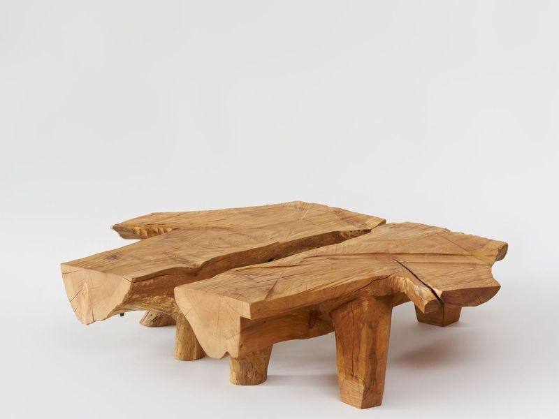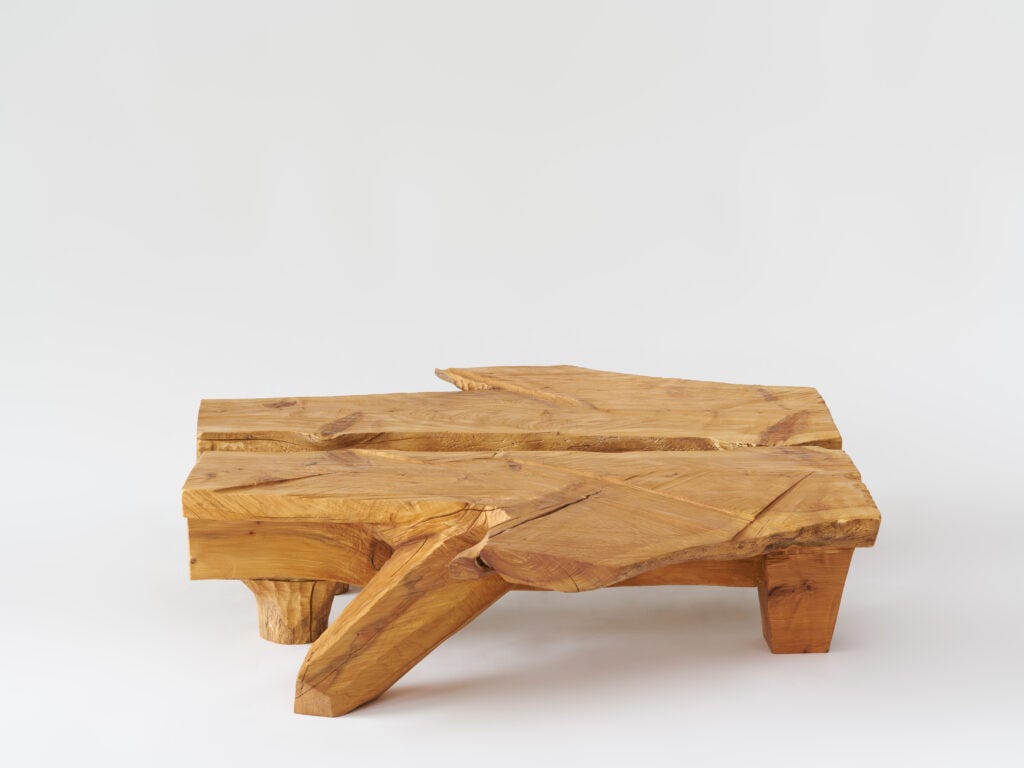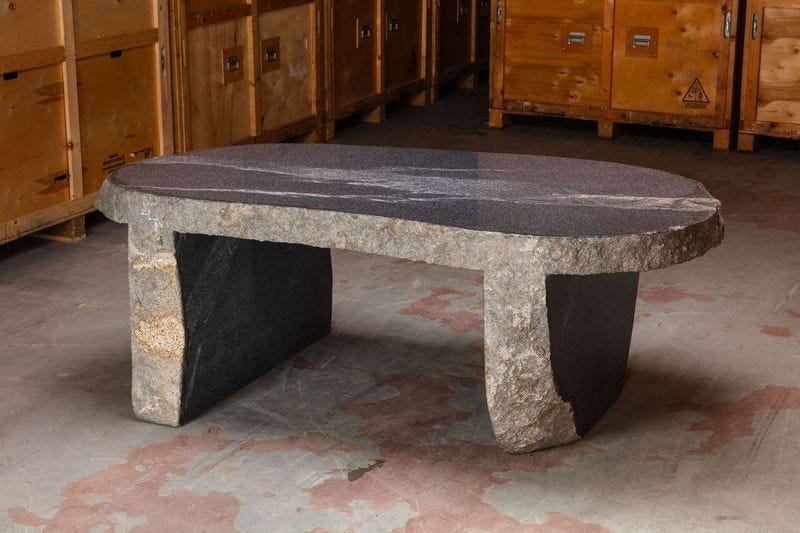 Much of his work is done on site (i.e. quarries, forges, woodlands), assisted by a small crew of craftspeople; but ultimately, it is his mark that is found on every one of his pieces. He went to the beach in Cornwall to cast a stool from molten pewter, to Devon to use the unique rubber spray for coating, to Wajima City, Japan with his clefted wood pieces to coat them with high-gloss—Urushi lacquer—where it was developed back in ancient times, to Northern California to carve wood, and to China to sculp stone. All of these individually crafted pieces when presented together illustrate the whole, revealing the wealth of methods, sculptural forms, and multifaceted materials that came to shape his work.