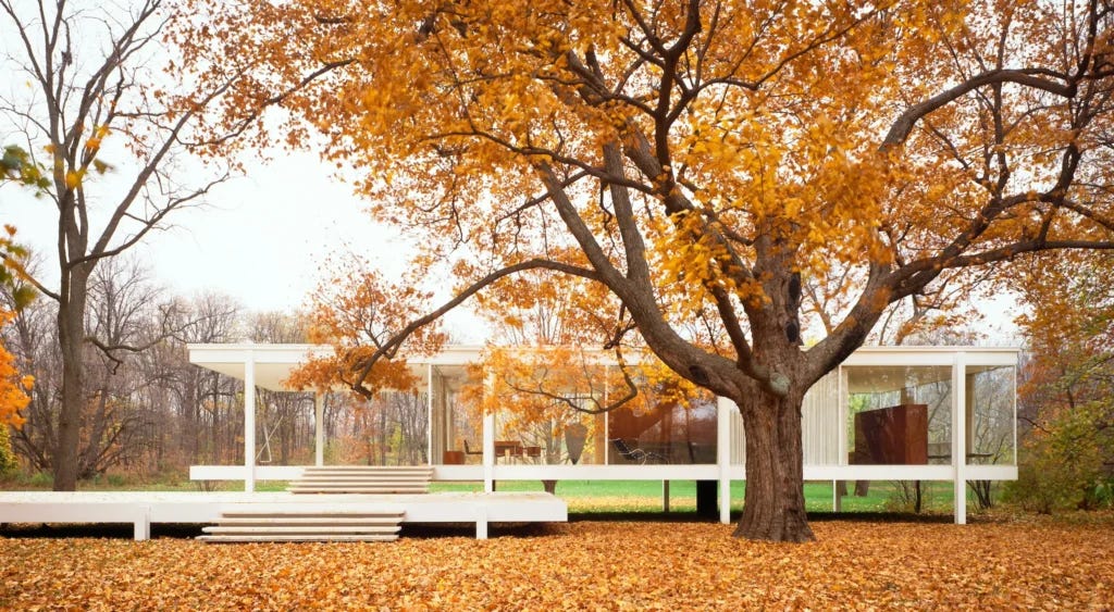 I clearly recall my first visit when it was newly opened to the public. After driving 50 miles southwest of Chicago, I passed the visitor center, parked, and began the walk through an untamed yet inviting cluster of trees. And there it was: levitating over a field alongside the Fox River, white as snow against the autumn foliage, gleaming in the late afternoon sunshine. I did not fall in love, I have to admit, because the aura was more intellectual than emotional. Even so, the impact was undeniable. What a marvel of purity, a temple of modernism.