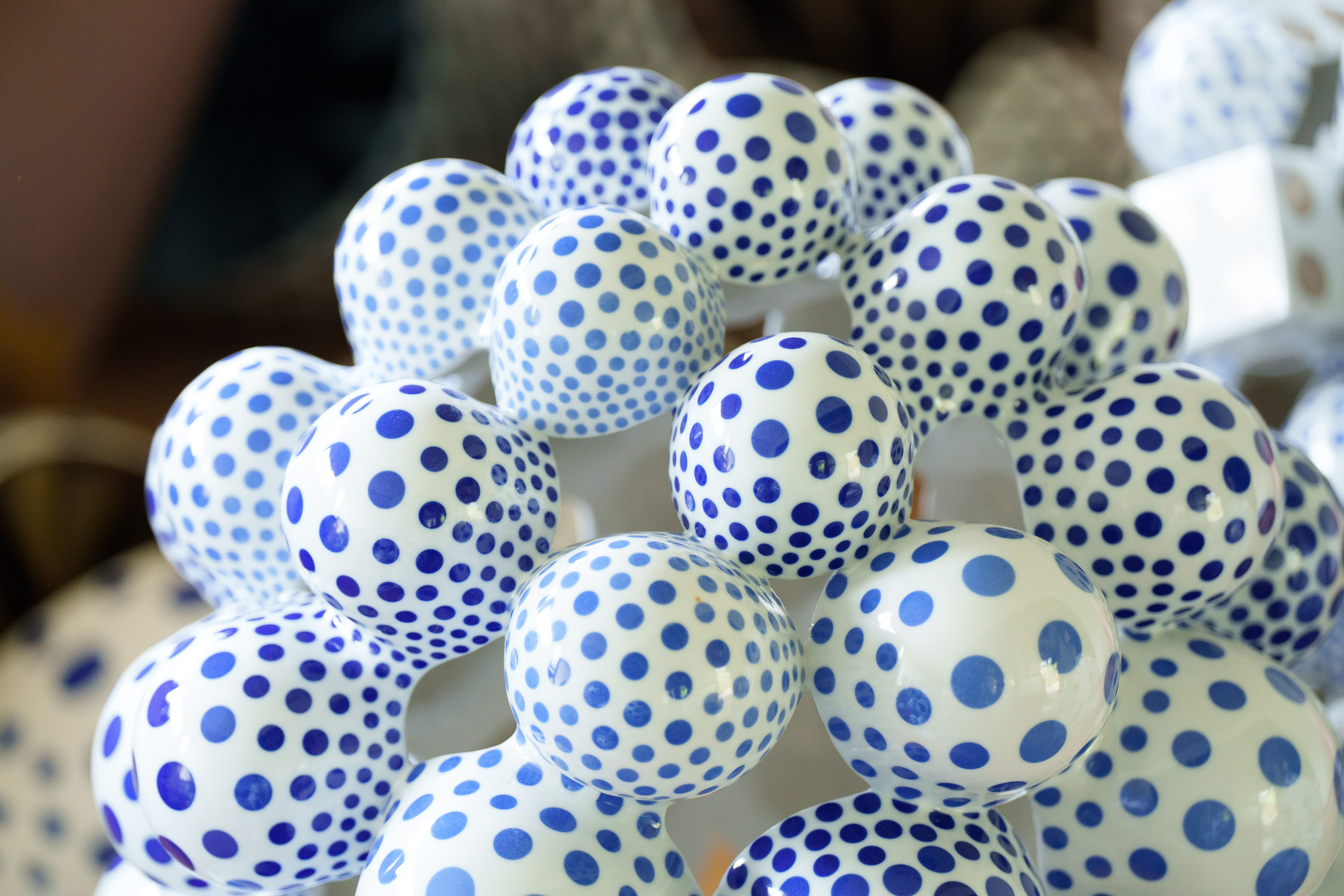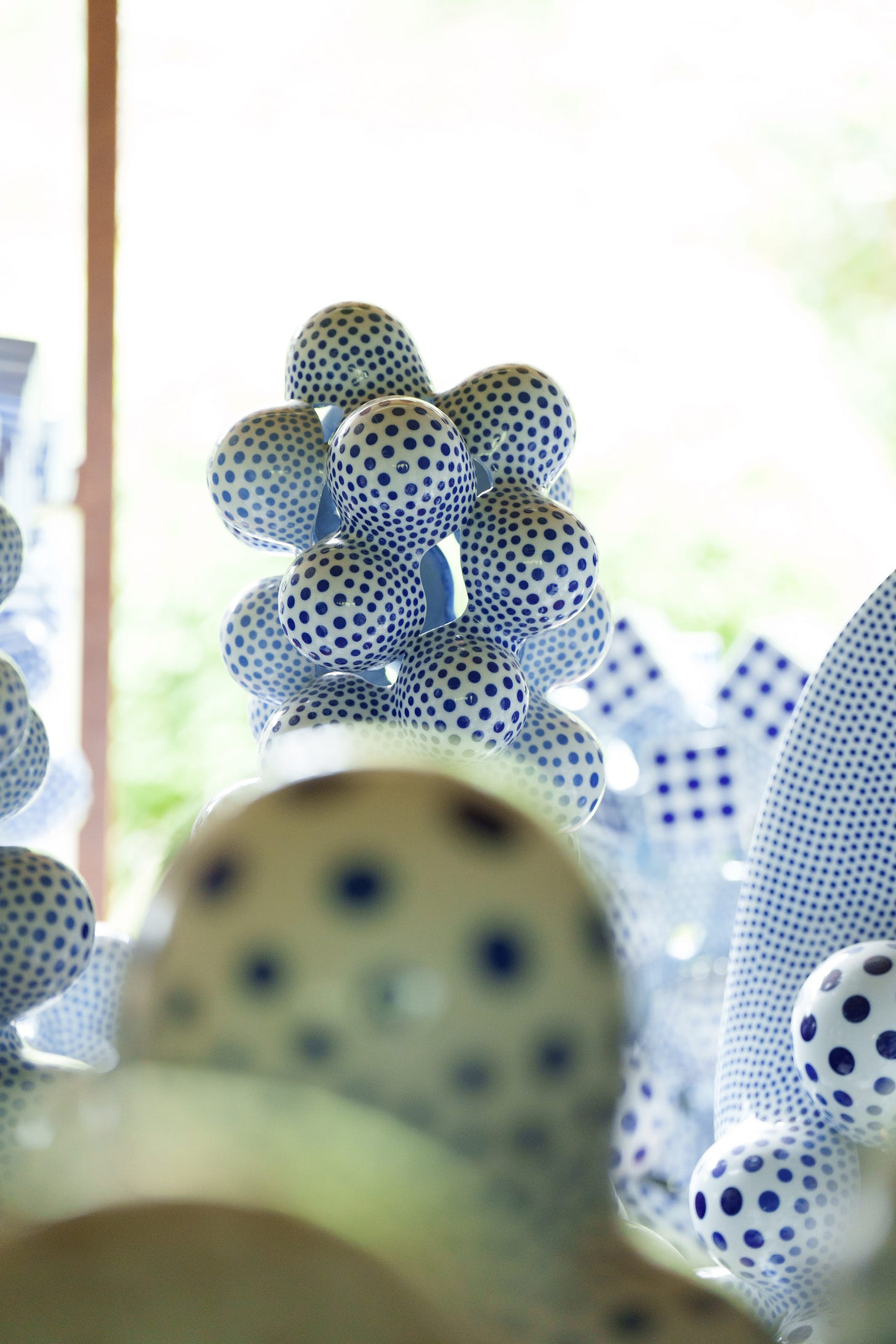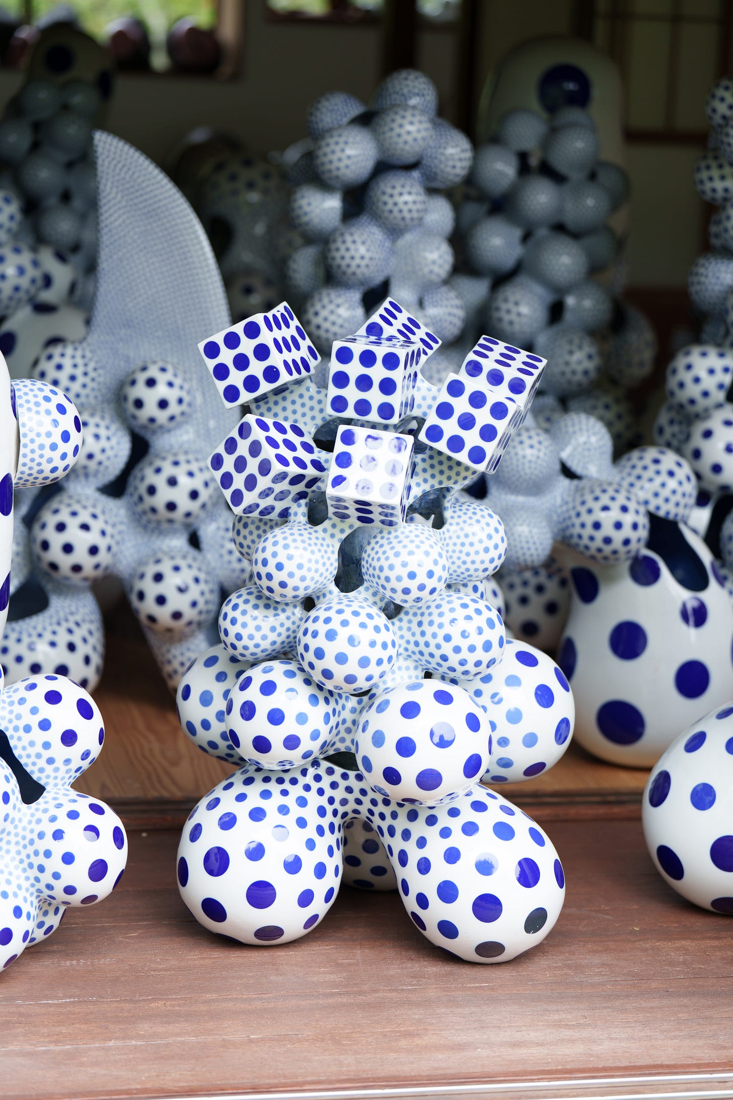 For award-winning ceramicist Harumi Nakashima, clay is a medium for creating non-functional, contemporary art. A stream runs through his sculpture garden at his picturesque home studio in Ena City, which he shares with his wife, Katsuko, and daughter, Mio Takatsu, both ceramicists as well. Nakashima hand-builds sculptures in porcelain, in geometrical forms which he molds, one by one. Inspired by European surrealists, and rooted in the tradition of blue-and-white Japanese porcelain, Nakashima infused the two while forging a distinctive and personal vocabulary, which charged porcelain with contemporary art. The polka dots have become his logo, as his pieces resemble creatures from a science fiction film.