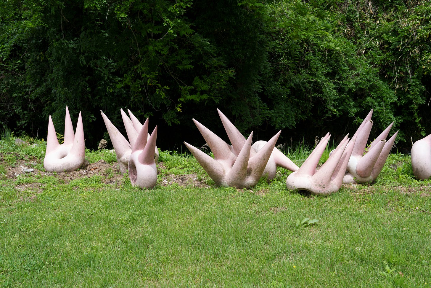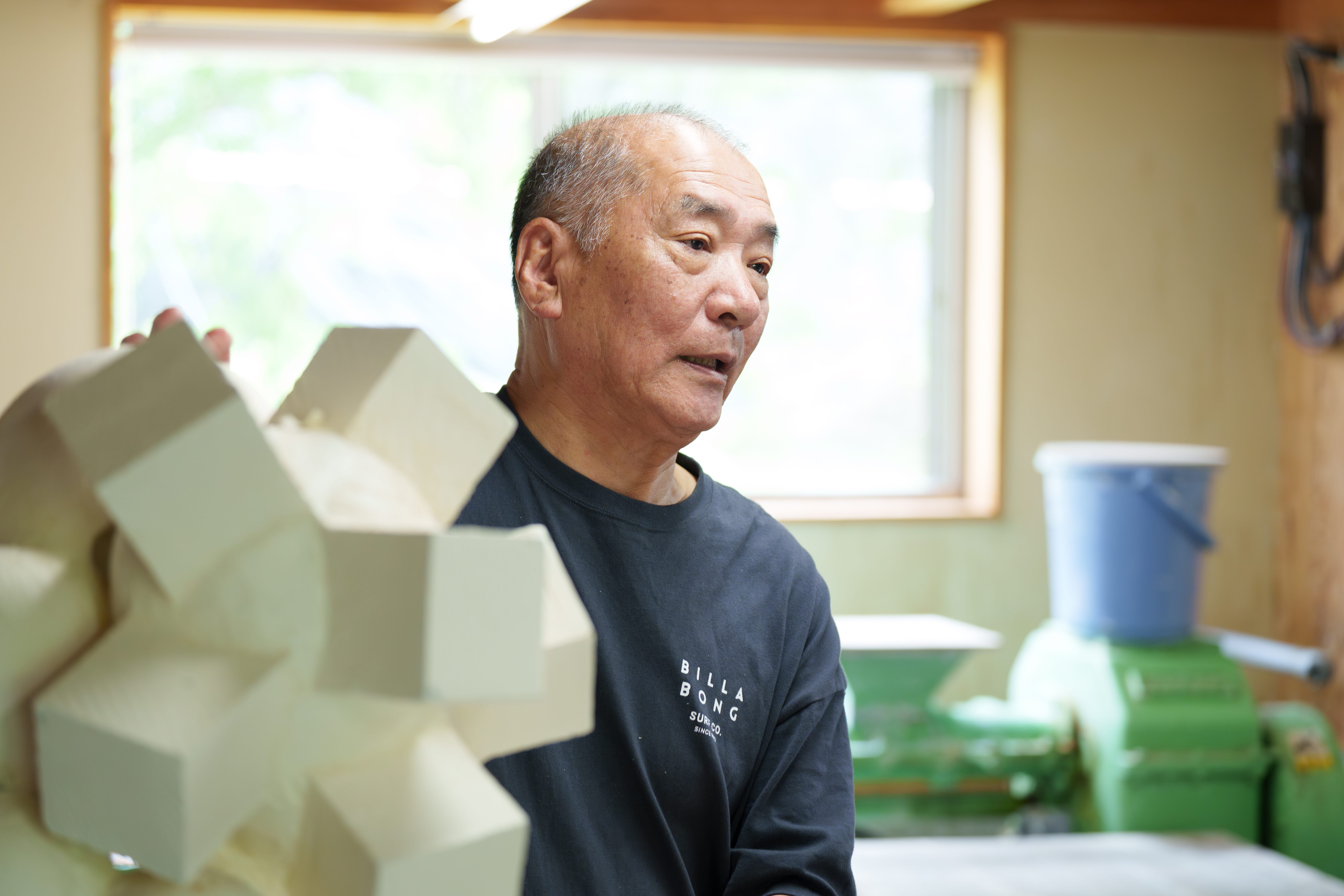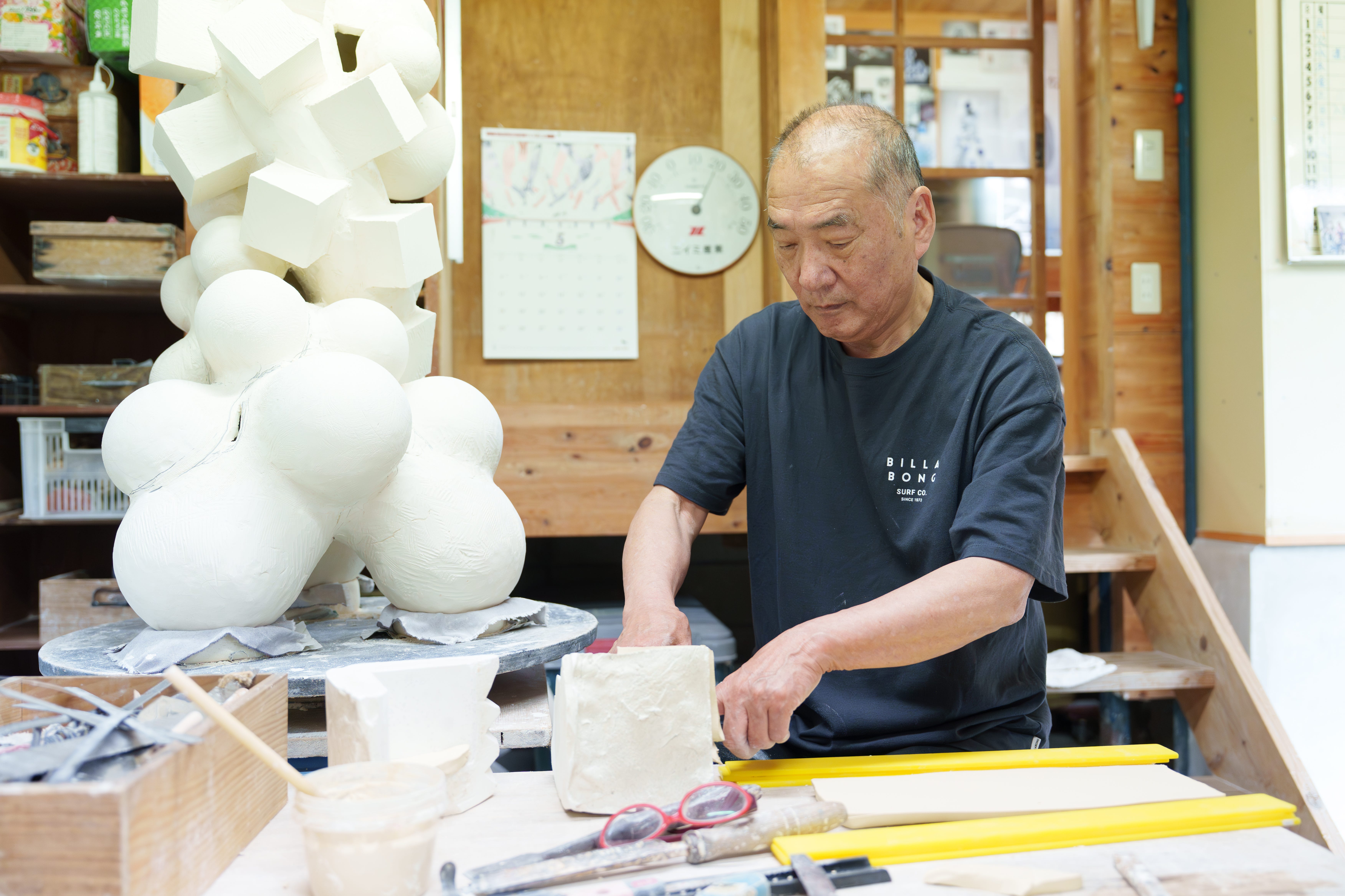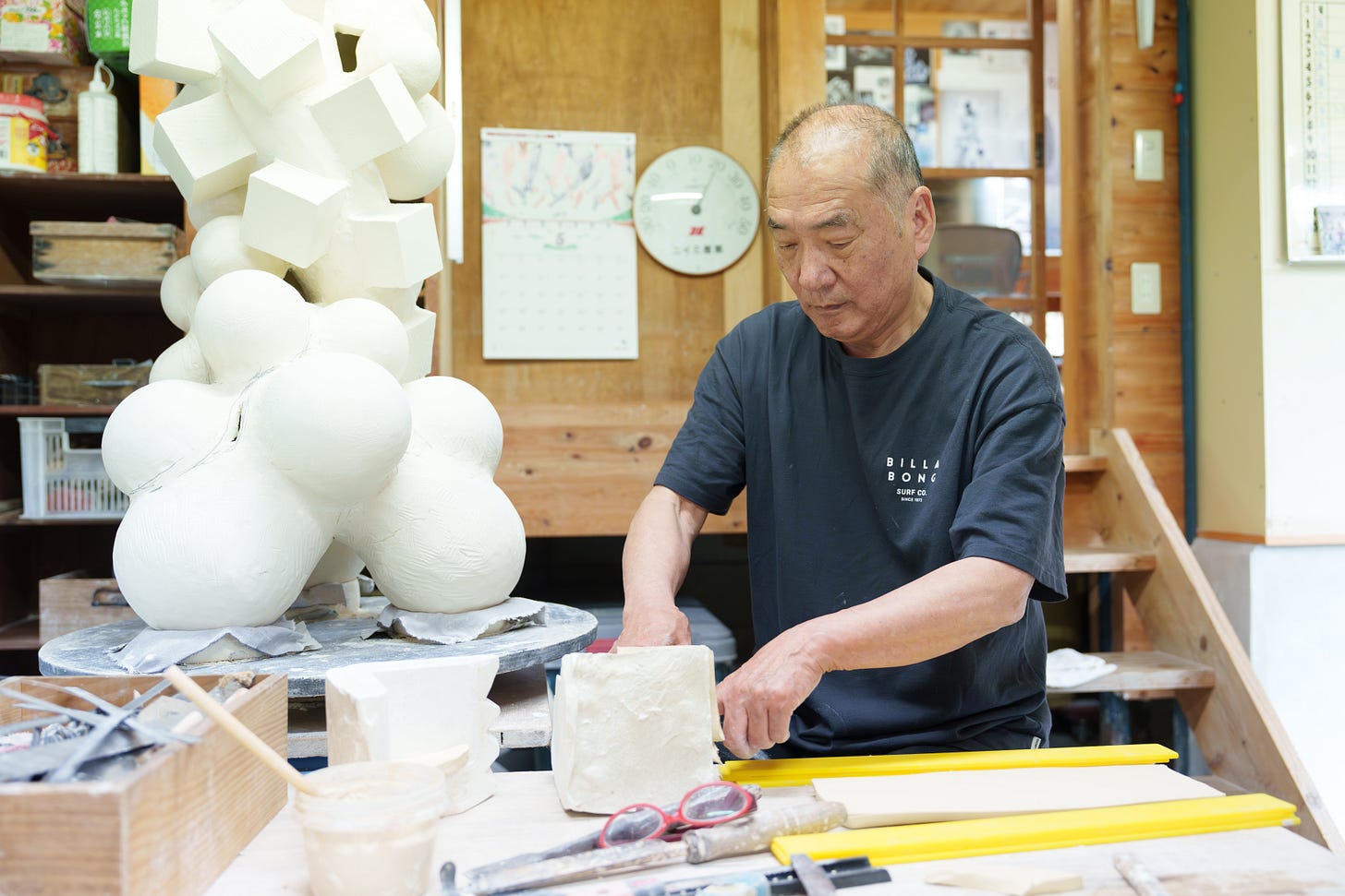 For award-winning ceramicist Harumi Nakashima, clay is a medium for creating non-functional, contemporary art. A stream runs through his sculpture garden at his picturesque home studio in Ena City, which he shares with his wife, Katsuko, and daughter, Mio Takatsu, both ceramicists as well. Nakashima hand-builds sculptures in porcelain, in geometrical forms which he molds, one by one. Inspired by European surrealists, and rooted in the tradition of blue-and-white Japanese porcelain, Nakashima infused the two while forging a distinctive and personal vocabulary, which charged porcelain with contemporary art. The polka dots have become his logo, as his pieces resemble creatures from a science fiction film.