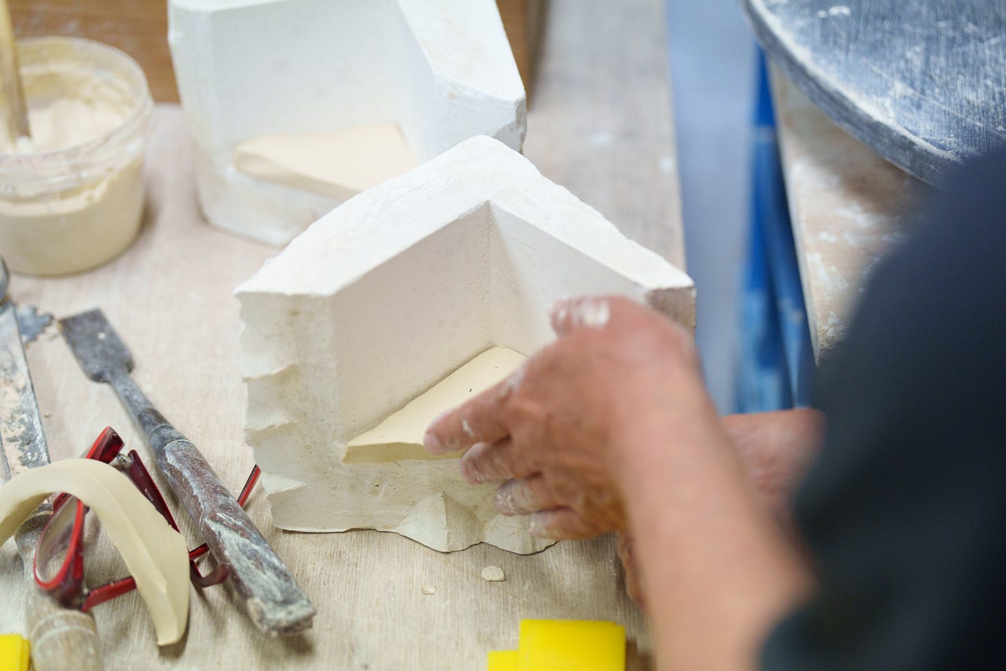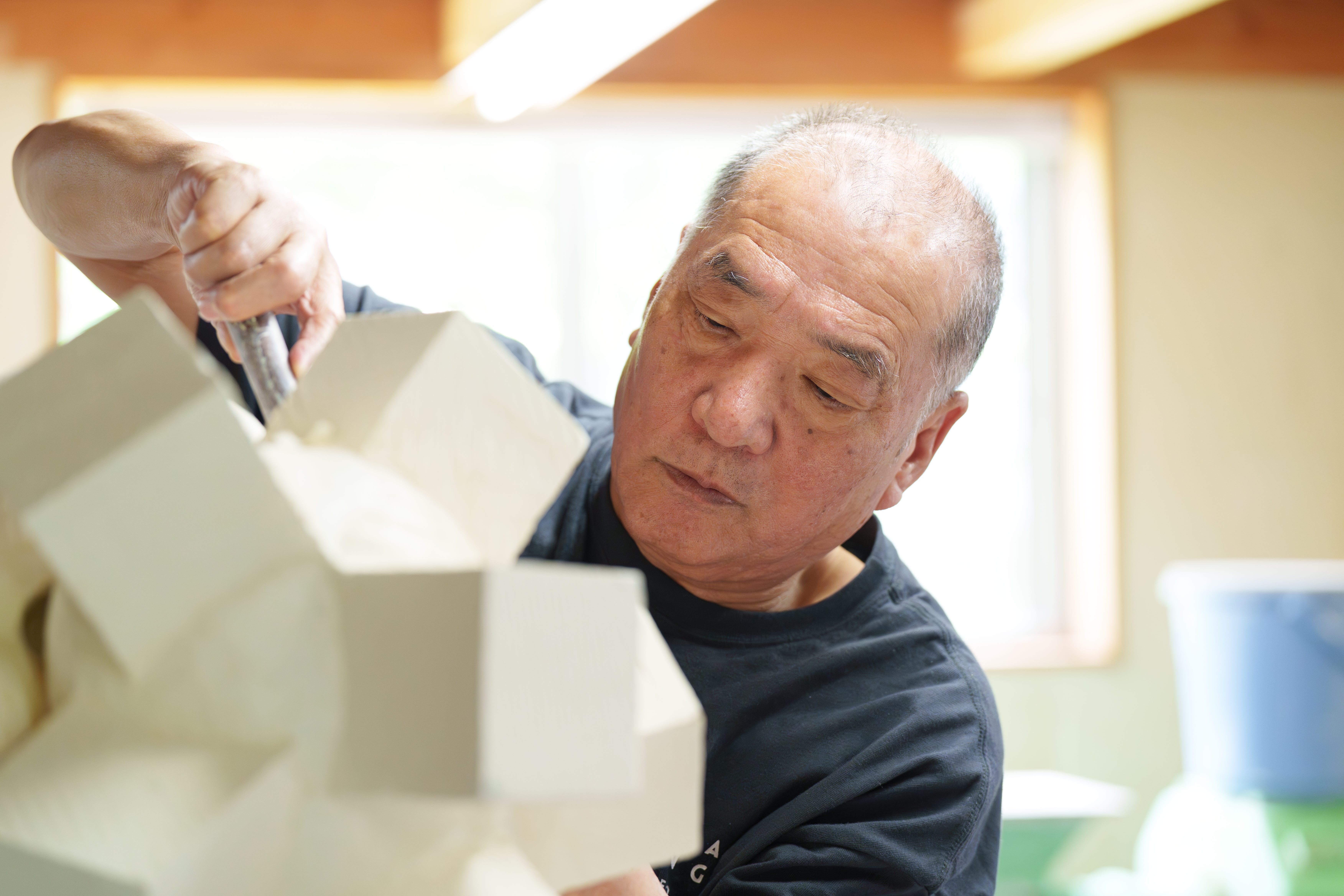 Nakashima’s greatness lies in his language, and how he can allow the plasticity and sensuality of the white porcelain to speak. His pieces are intensive and sensual, affected by the tension between the structured geometry and the flowing, free forms, between traditions and innovations, between the repetitive and the unique. Each sculpture is composed of minor elements, which he hand-builds in molds and merges into abstract, powerful, and complex forms. Sanding the seams is labor-intensive, but it is necessary to achieve the immaculate surfaces. After the second firing, once the piece is covered with glazing, the dots are painted using cobalt blue over the body. With his inventive language bringing the concepts of the Sodeisha Movement into the 21st century, Harumi Nakashima stands at the forefront of contemporary Japanese clay artl.