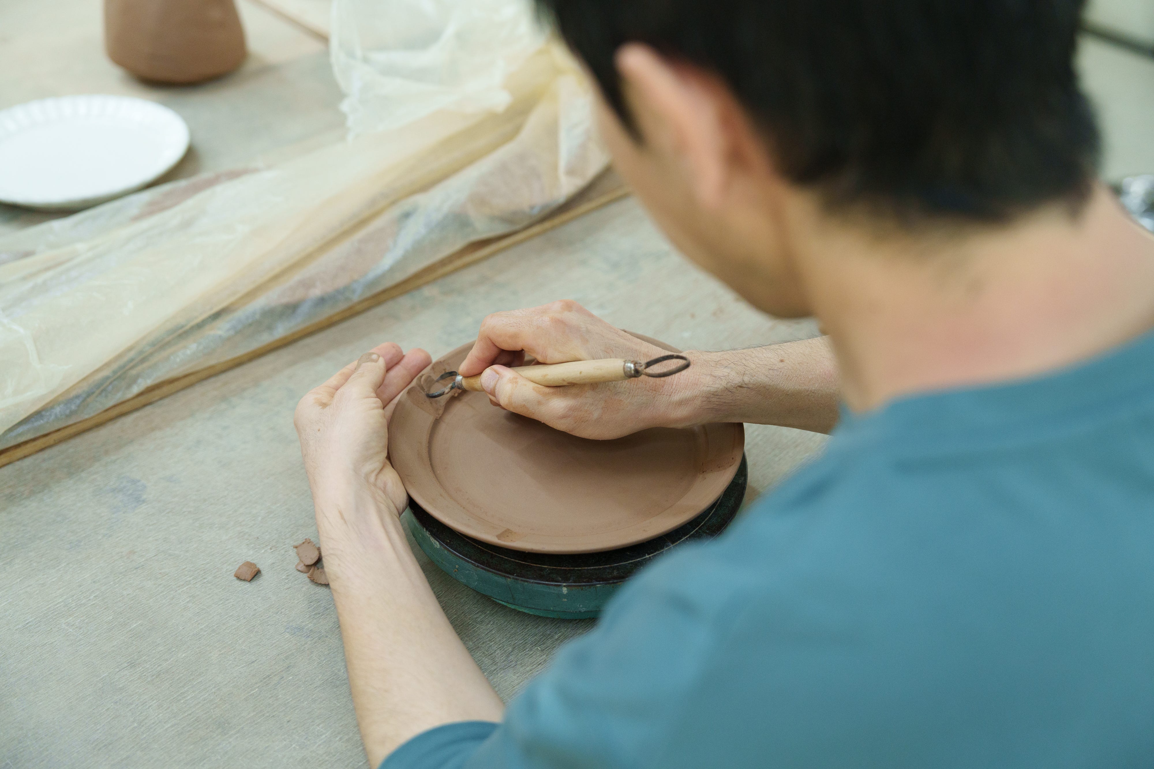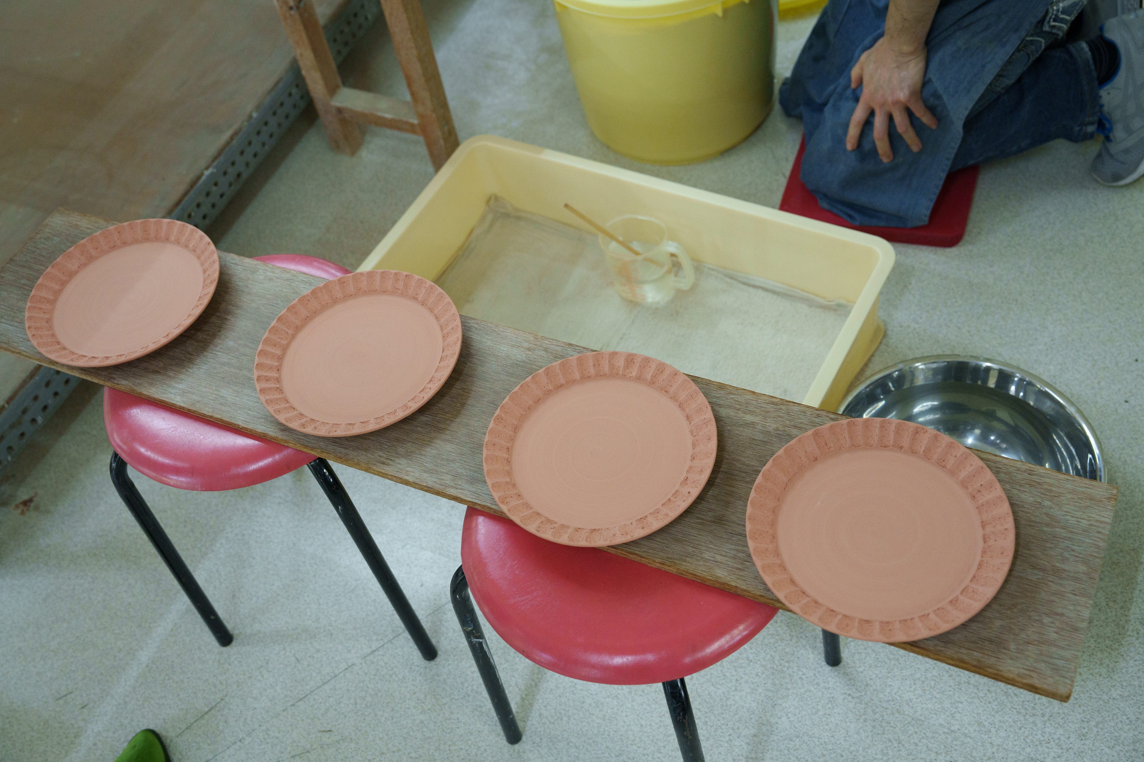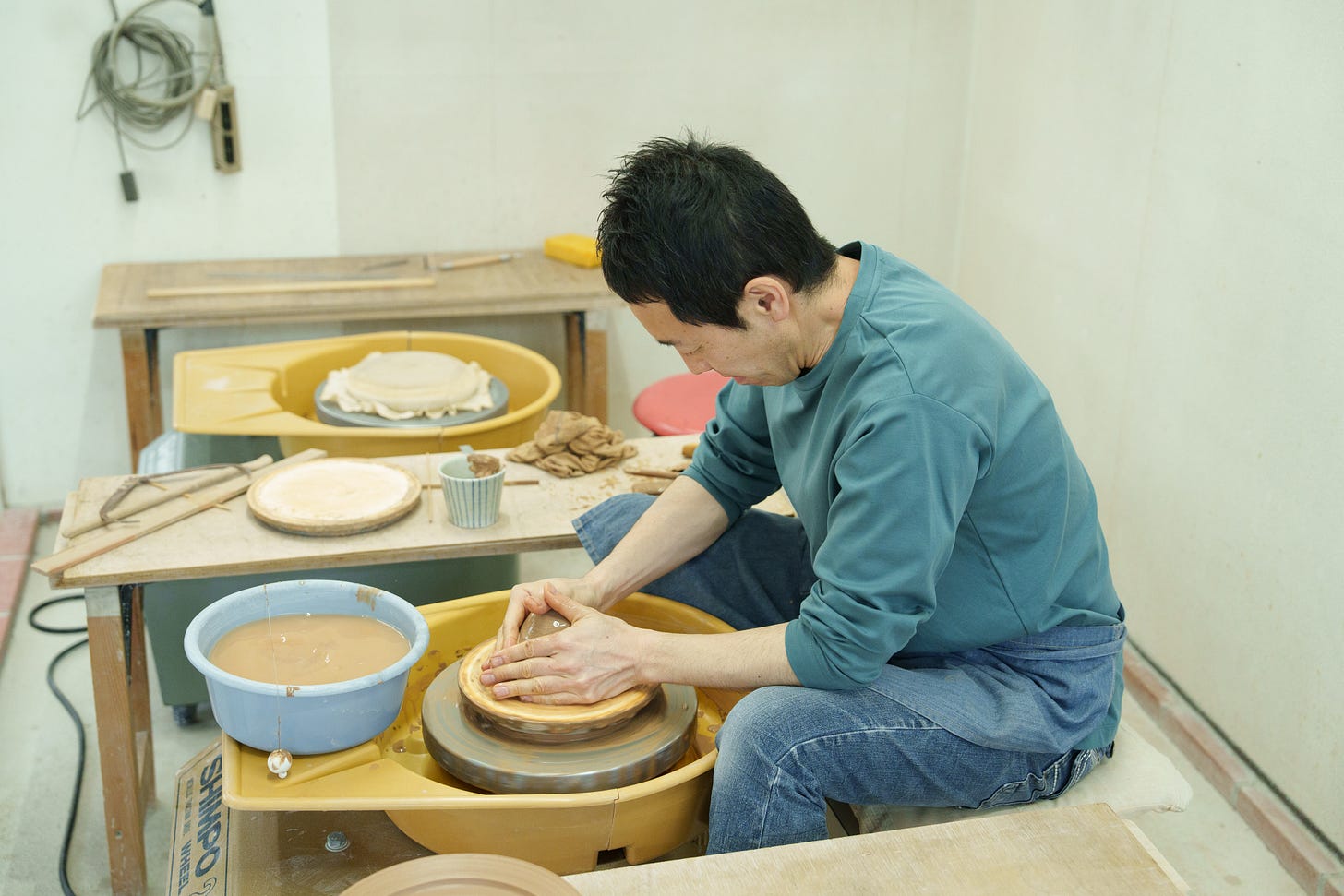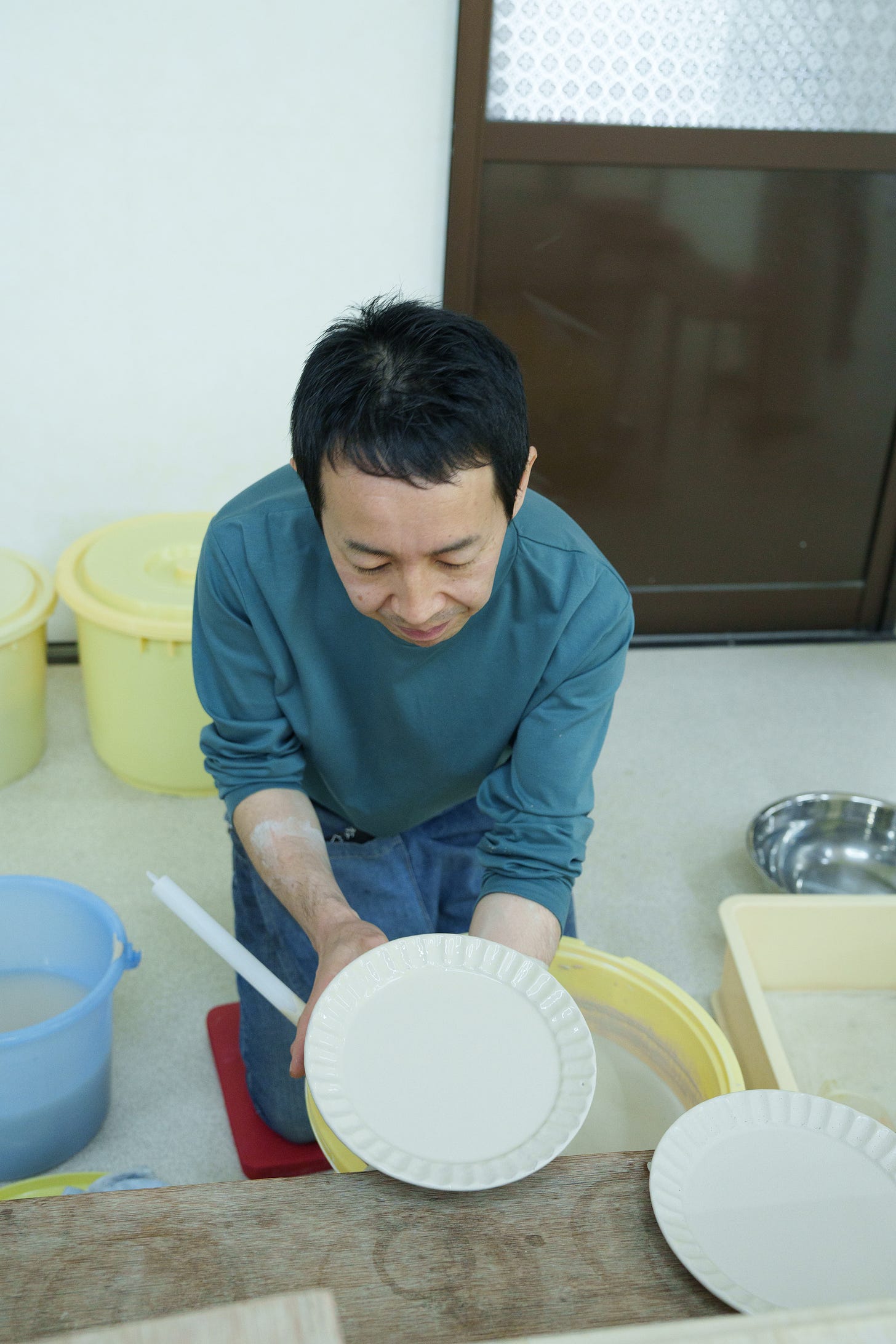 A graduate of Osaka University of Arts, Hitoshi studied ceramics at Toki City Ceramic Testing Center. He is a contemporary artist who works in the most traditional of ways and whose soul and hands are embossed in every piece coming out of his studio. He creates the tableware from dark clay, which he digs himself in a basin next to his home in Mino. After he hammers the hard clay, he powders it to create fine sand, which he then mixes with water. Each plate is thrown on the wheel, each is unique, and each is formed from the artisan’s hand. The plates are then decorated in the Shinogi technique, where a scalloped pattern is created by carving grooves on the rim of the plate. Shinogi is a pattern traditionally used at the highest point on Japanese swords, where the blades are curved on both sides. Each piece is then being deep into a bucket filled with white slip and is fired before a translucent glaze is applied for the second firing.