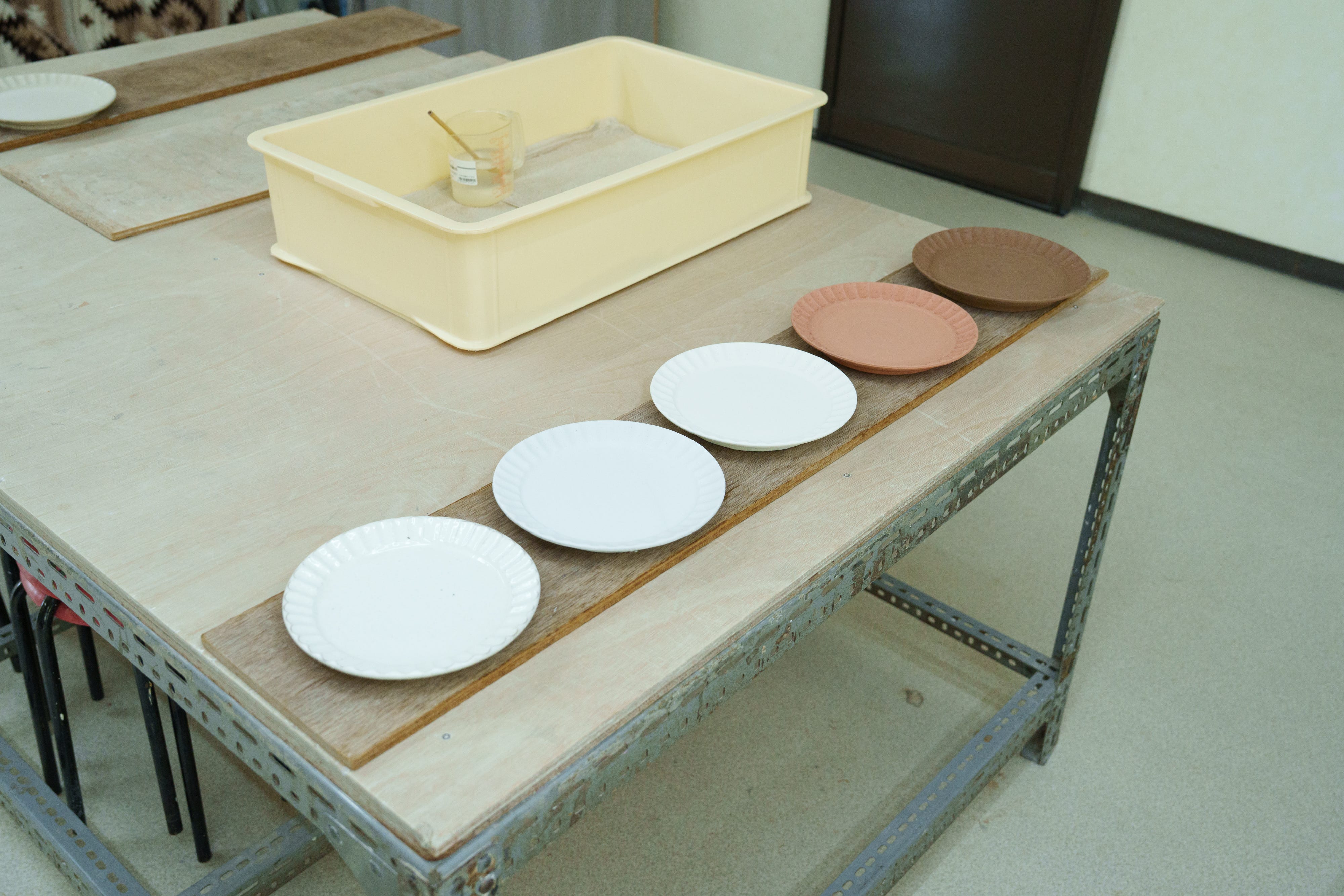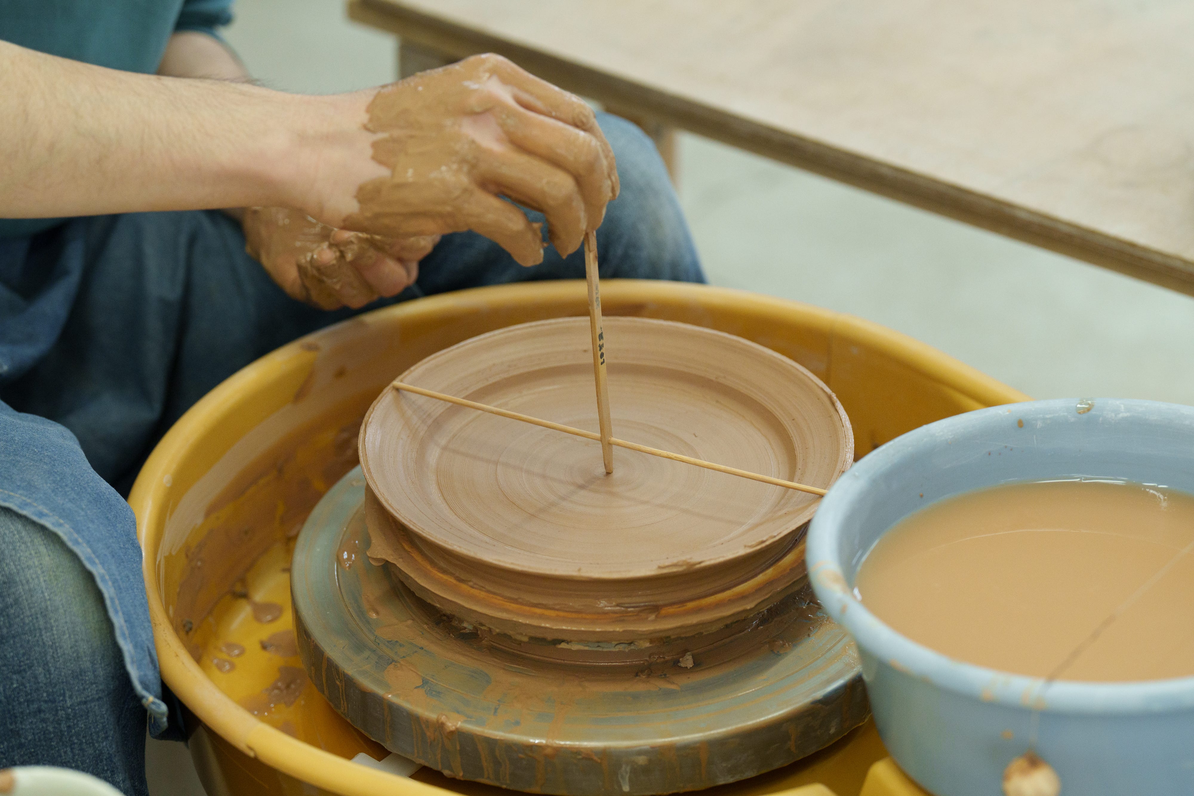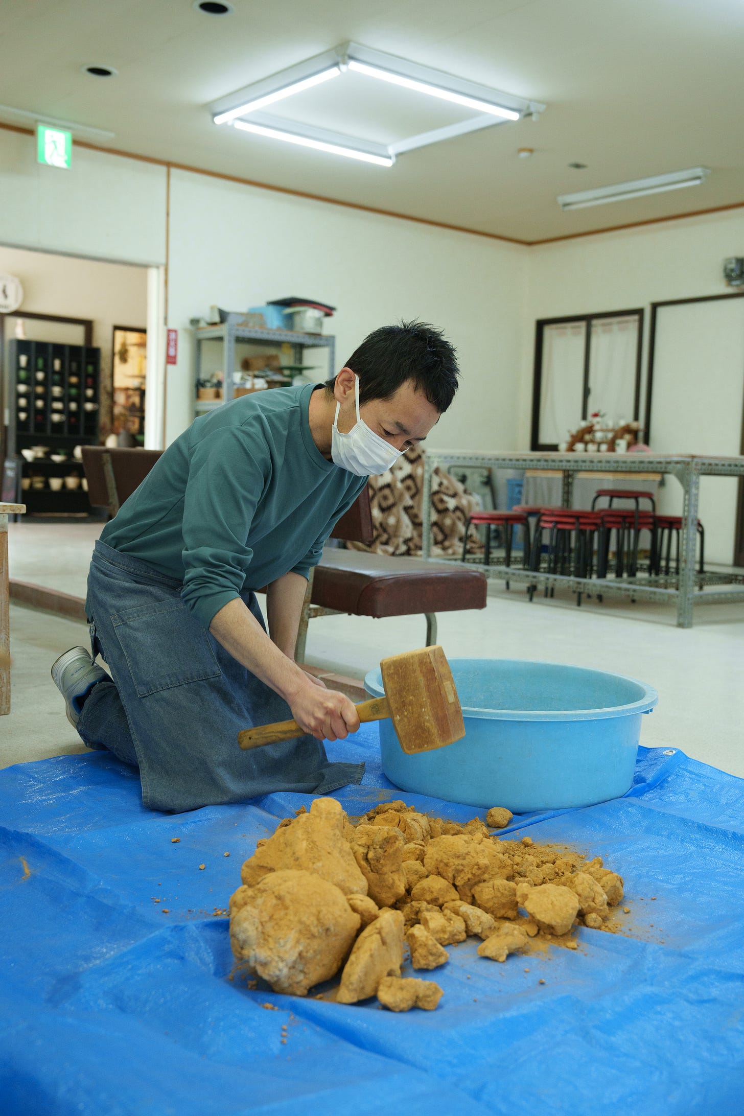 A graduate of Osaka University of Arts, Hitoshi studied ceramics at Toki City Ceramic Testing Center. He is a contemporary artist who works in the most traditional of ways and whose soul and hands are embossed in every piece coming out of his studio. He creates the tableware from dark clay, which he digs himself in a basin next to his home in Mino. After he hammers the hard clay, he powders it to create fine sand, which he then mixes with water. Each plate is thrown on the wheel, each is unique, and each is formed from the artisan’s hand. The plates are then decorated in the Shinogi technique, where a scalloped pattern is created by carving grooves on the rim of the plate. Shinogi is a pattern traditionally used at the highest point on Japanese swords, where the blades are curved on both sides. Each piece is then being deep into a bucket filled with white slip and is fired before a translucent glaze is applied for the second firing.