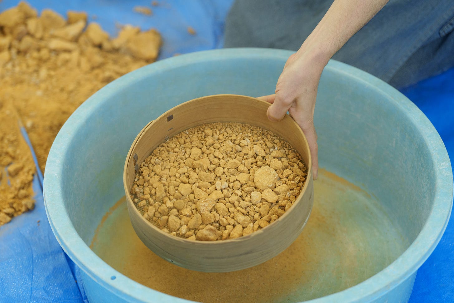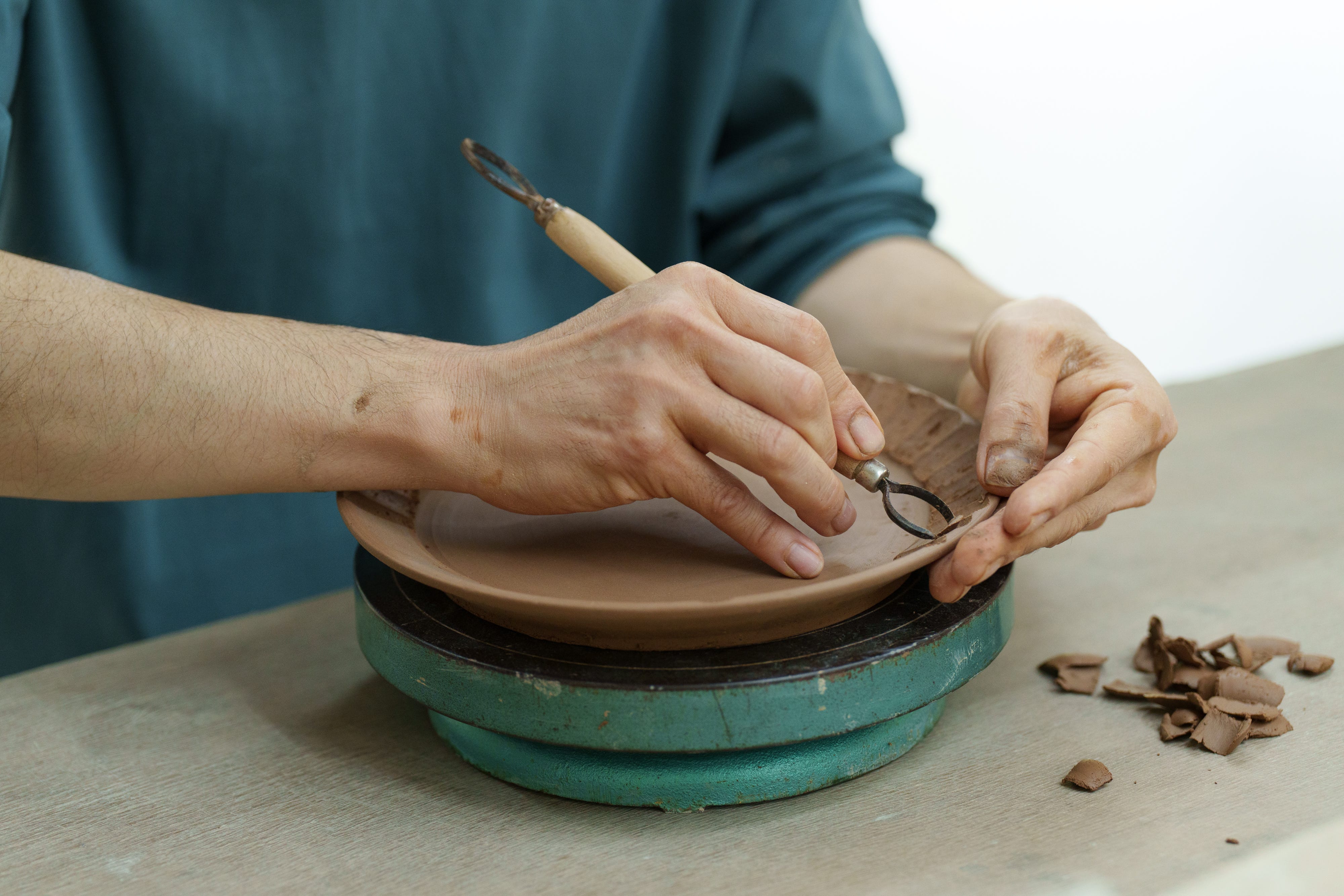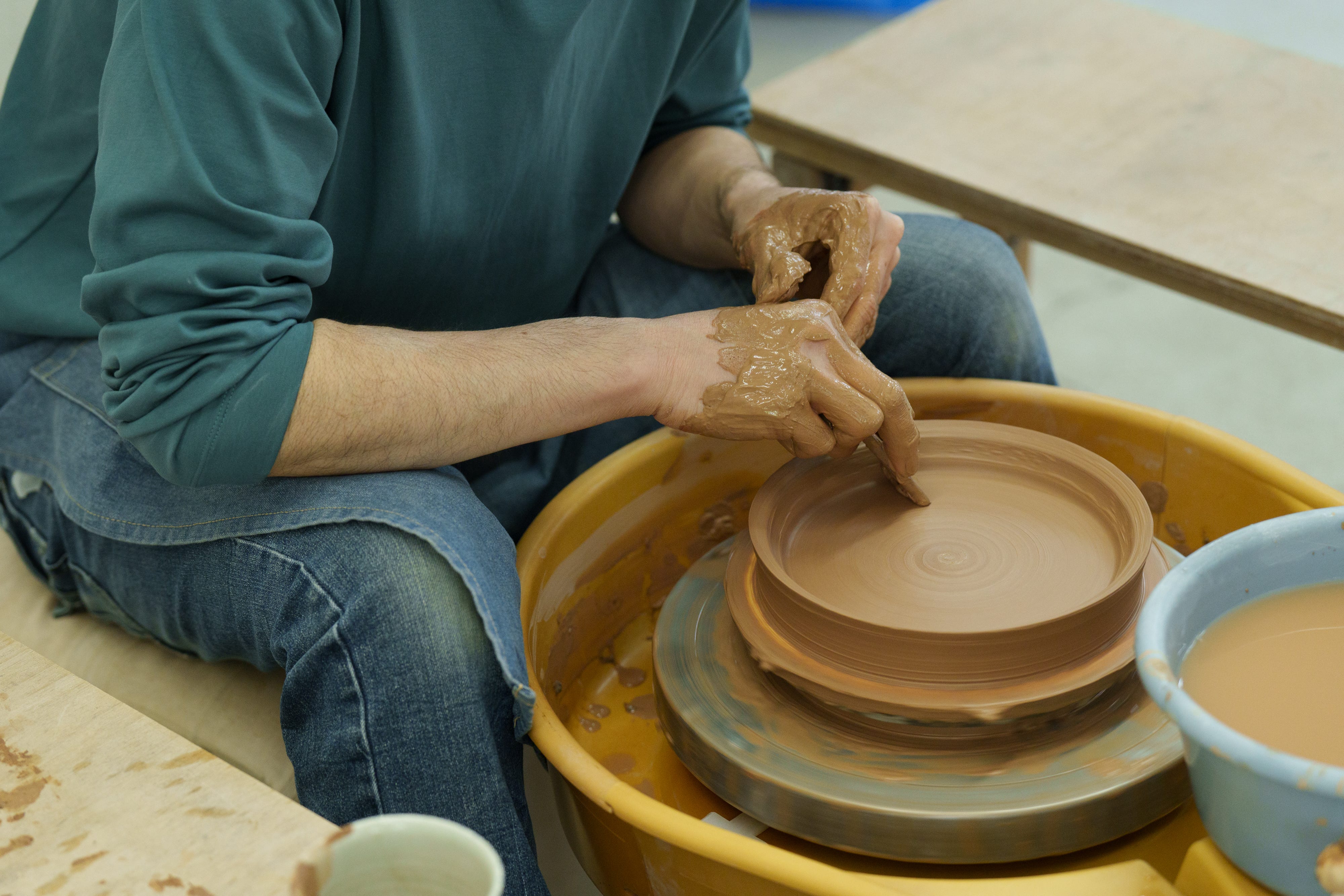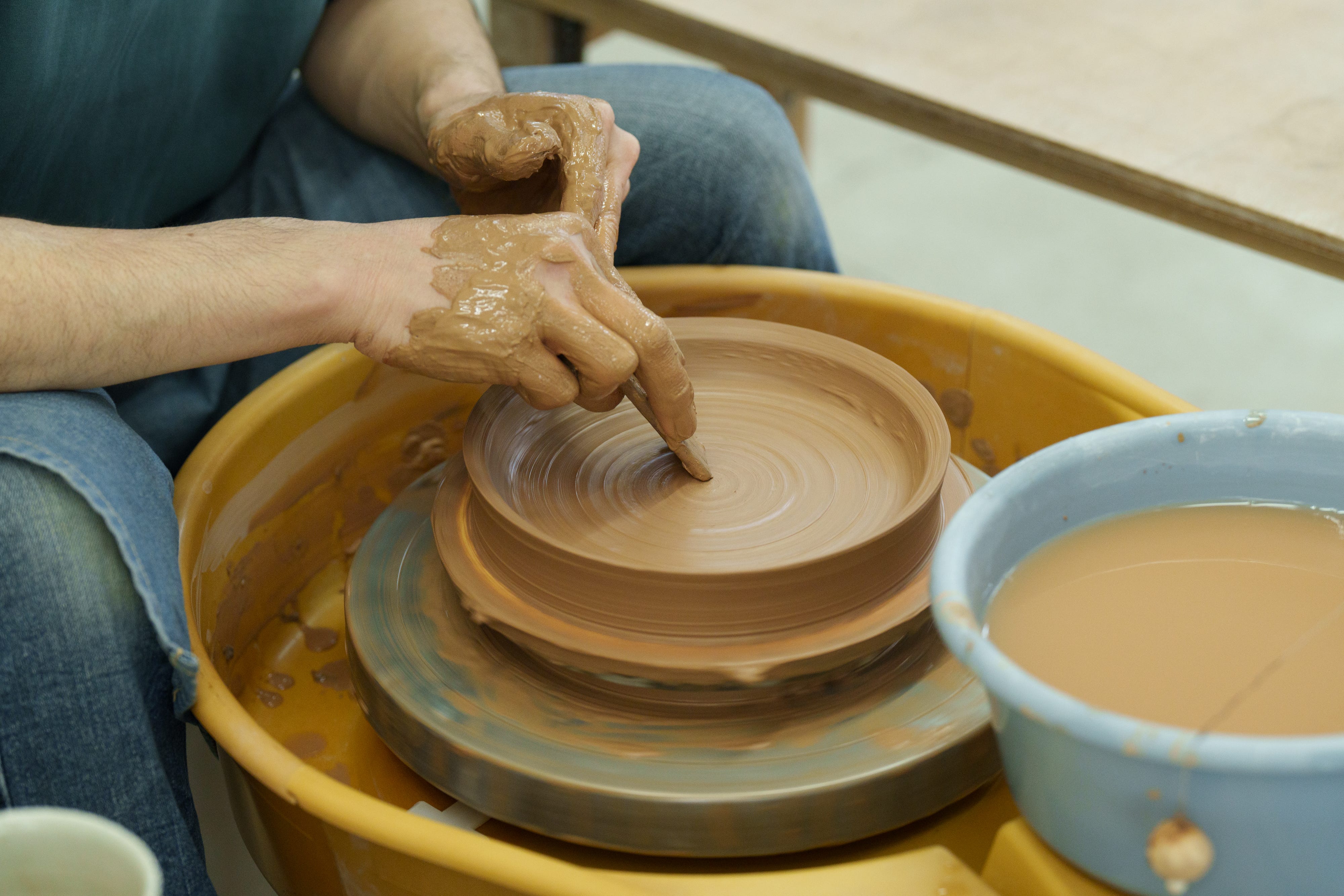 A graduate of Osaka University of Arts, Hitoshi studied ceramics at Toki City Ceramic Testing Center. He is a contemporary artist who works in the most traditional of ways and whose soul and hands are embossed in every piece coming out of his studio. He creates the tableware from dark clay, which he digs himself in a basin next to his home in Mino. After he hammers the hard clay, he powders it to create fine sand, which he then mixes with water. Each plate is thrown on the wheel, each is unique, and each is formed from the artisan’s hand. The plates are then decorated in the Shinogi technique, where a scalloped pattern is created by carving grooves on the rim of the plate. Shinogi is a pattern traditionally used at the highest point on Japanese swords, where the blades are curved on both sides. Each piece is then being deep into a bucket filled with white slip and is fired before a translucent glaze is applied for the second firing.