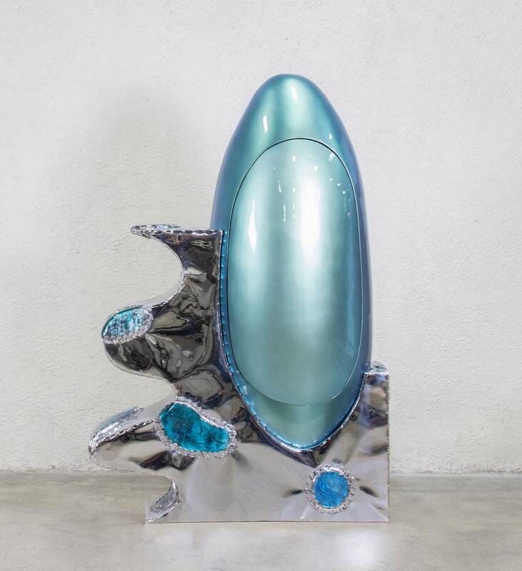 Misha Kahn opened his third solo exhibition at Friedman Benda last week and hosted my class in discussing the pieces, the process, the narrative, and what they mean. I was introduced to him at his first solo show four years ago. He was 27, created a space of chaos, full of tapestries, painted tiles, enormous chandeliers, furniture made in concrete and found materials, marking a new direction in the gallery towards presenting a new movement in contemporary design: surreal, colorful, irregular, emotional, poetic, object blurring the line between art and design.