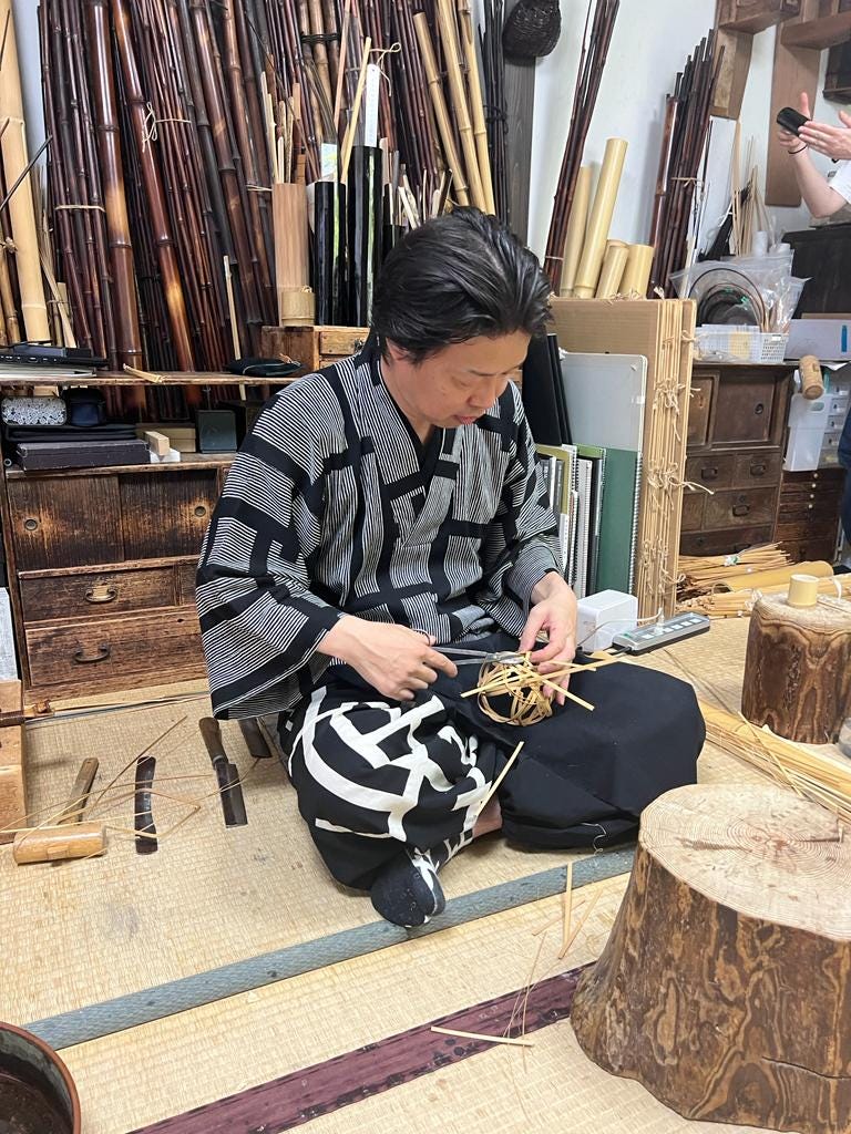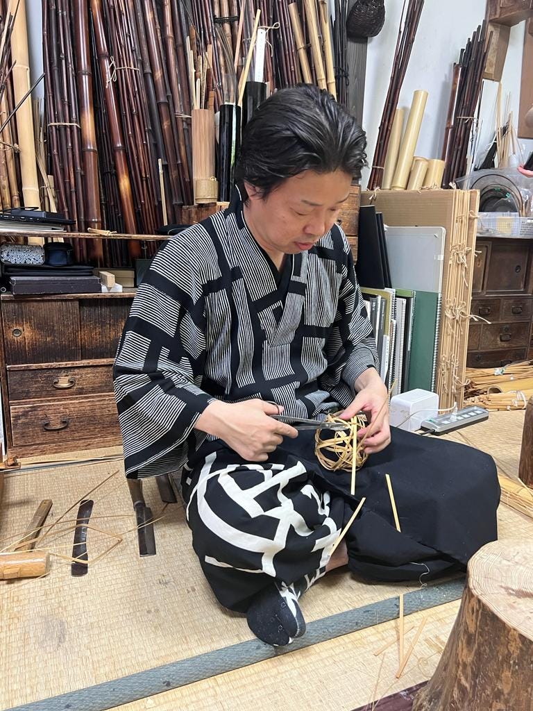 The fourth generation of a prolific bamboo weaving family, Chikuunsai IV has an impressive pedigree. He began weaving as a child. After graduating from Tokyo University of Arts, he went to Beppu to study basketmaking before returning to his family home near Osaka, where he continues to live today with his widowed mother, wife, and three teenagers—the next generation of bamboo artists to whom he is passing his masterful skills.