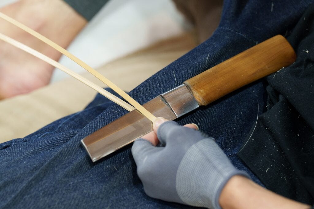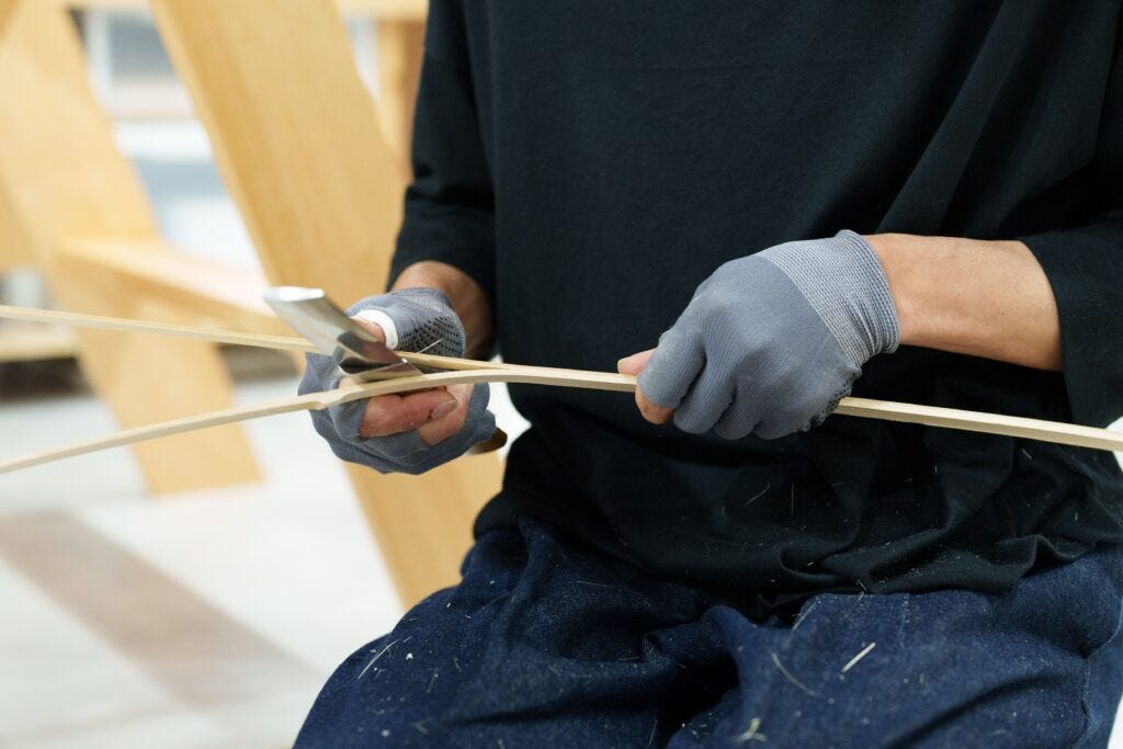 In Portland, Jirō began to distance himself from the traditional techniques he learned in Japan. He developed a distinct, sculptural language through an unconventional, labor-intensive way of cutting bamboo into wide strips as well as a unique approach to braiding and dying. As he was demonstrating for me the preparation of the bamboo strips in his studio, I noticed how meditative the process seems to be for him.