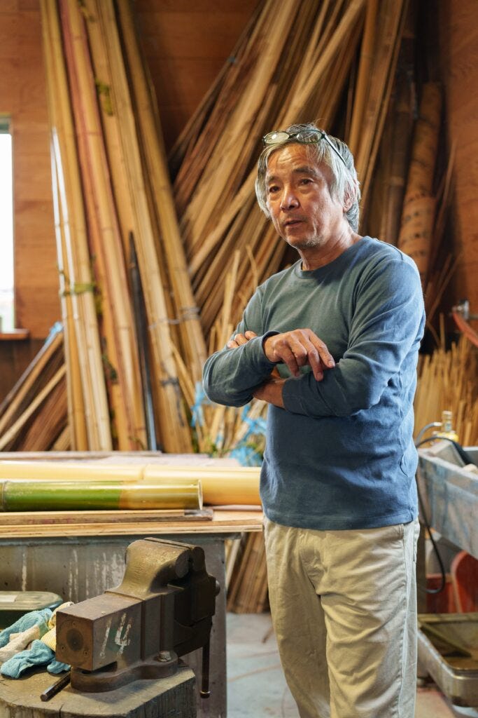 Award-winning Yonezawa Jirō studied bamboo basketmaking at the Beppu Vocational Arts Training Center; he graduated 42 years ago. A native of Kyūshū, he has been surrounded by bamboo his entire life, but he didn’t dedicate himself to the craft until he was 22 years old. Even so, his identity as an artist reflects his deep relationship with the region’s bamboo-filled landscape. He takes great pride in selectively harvesting his material to ensure the long-term health of the groves.