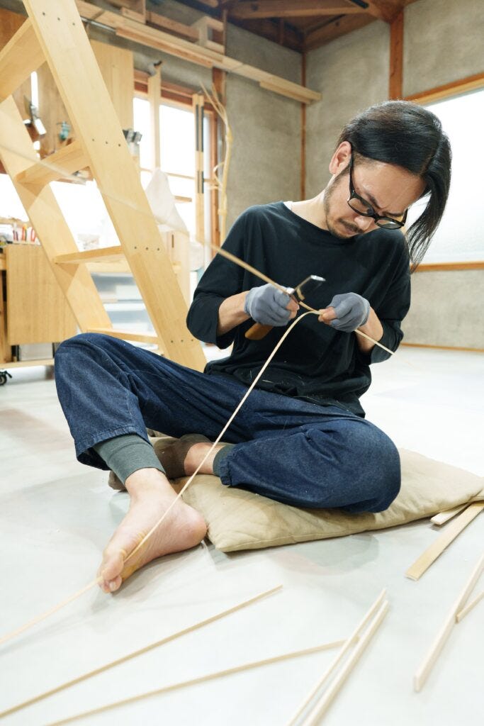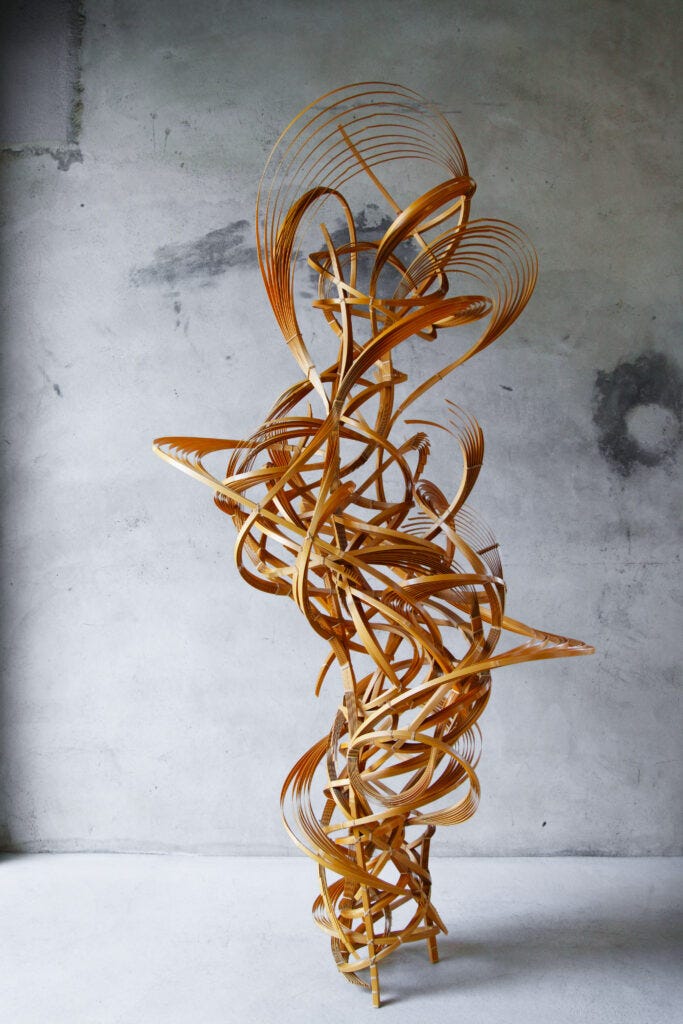After a year of learning basic technical skills, Yokoyama’s second year at school, he recalls, brought another revelation: that the more he tried to follow the rules and stay loyal to fundamental principles, the more he lost touch with craft’s true potential as well as his own expressive voice. He began to ask questions, seeking to connect with his inner creativity. By the time he finished his graduation project, he had established the seeds of a fresh and independent vision. When his work was eventually shown by Wahei Aoyama, founder of the Tokyo-based gallery A Lighthouse called Kanata, he began to attract a wide audience of admirers. Today, his innovative, free-standing sculptures—forms that shouldn’t be possible in the medium of bamboo—sell out before his exhibitions even open.