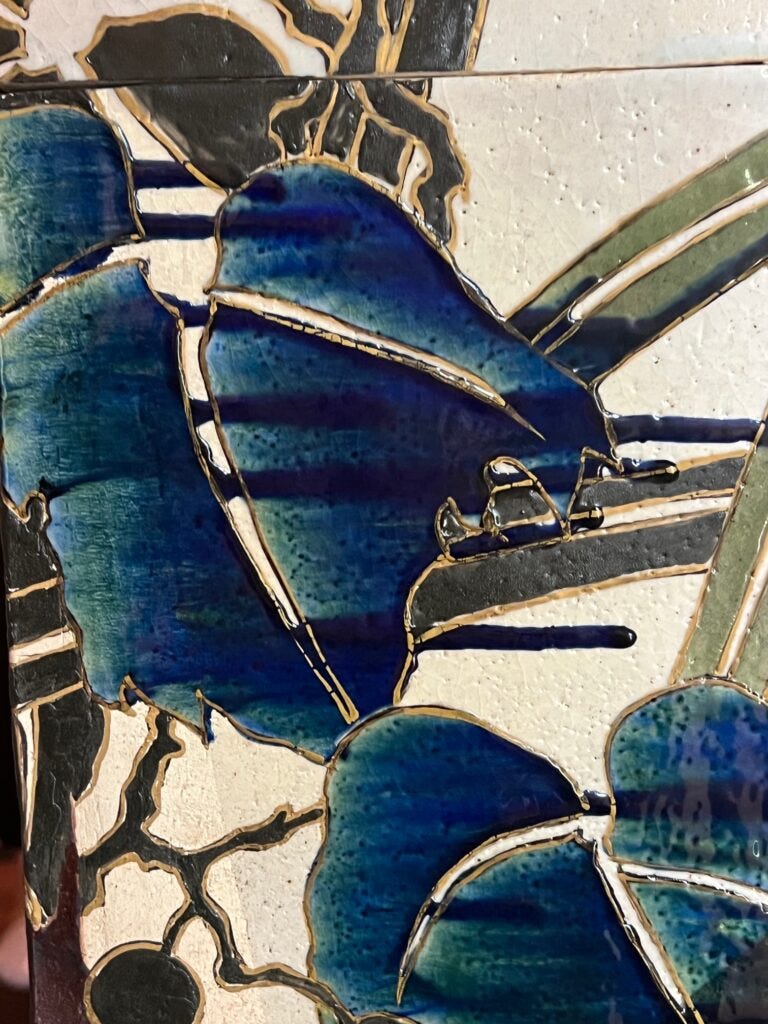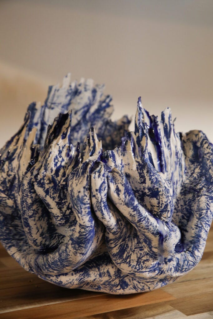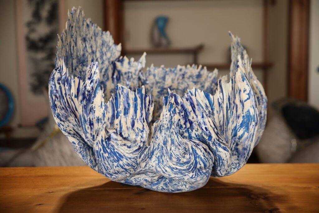 Her work is magical, not only because her blue-and-white flower forms capture that elusive moment when a bud becomes a flower but also because her carving technique captures the energy and passion she brings to her craft. Each of her works is different, the result of the labor intensive process she developed shaping slabs of clay covered in plastic. Each is fired and, after the blue zaffer is applied, fired again. With their enormous scale and rich texture, her pieces have the power to transform spaces.