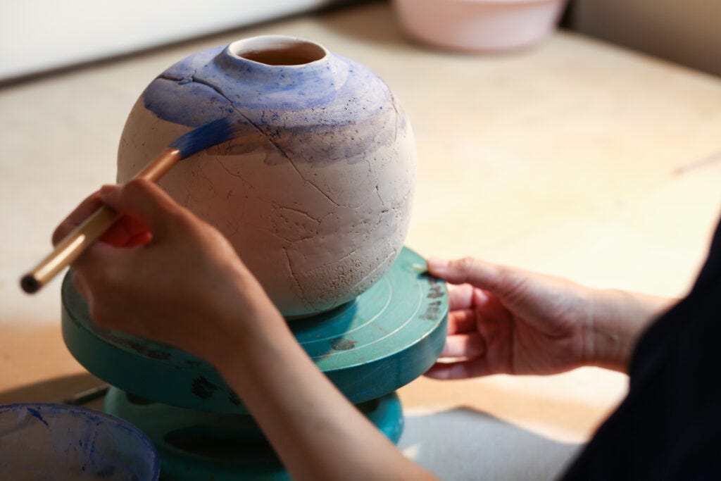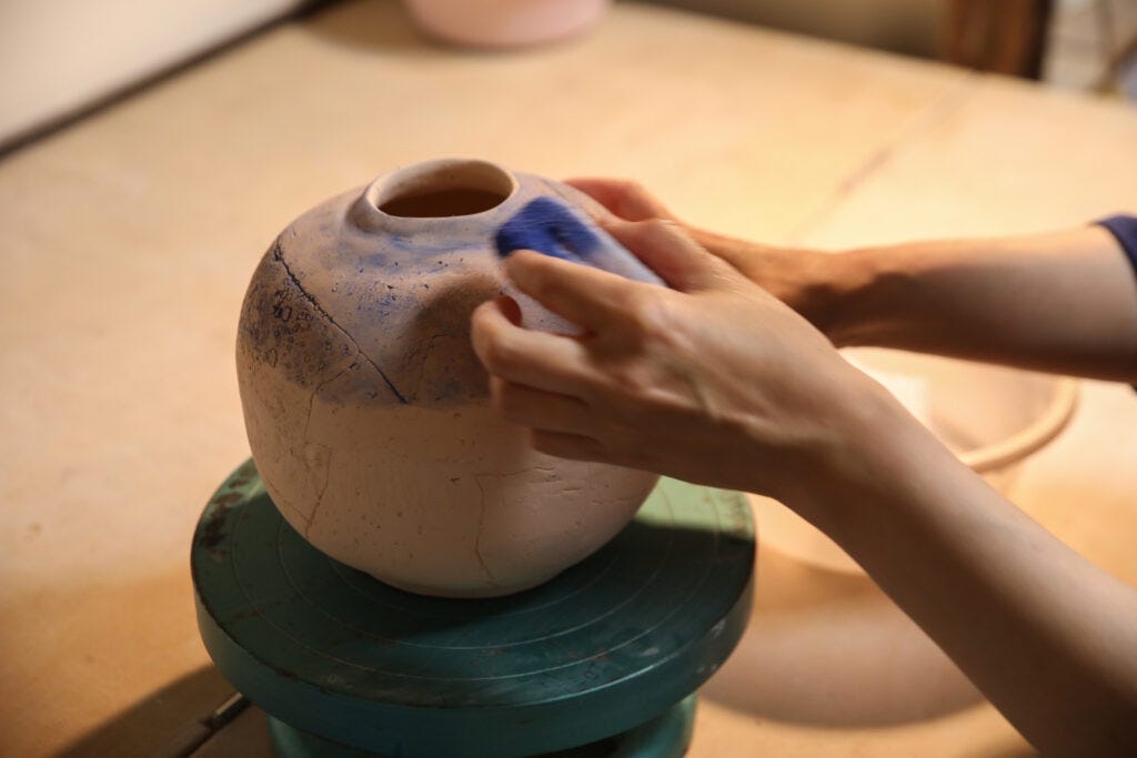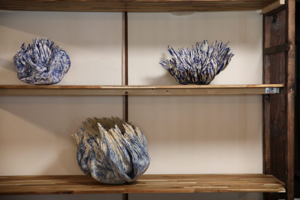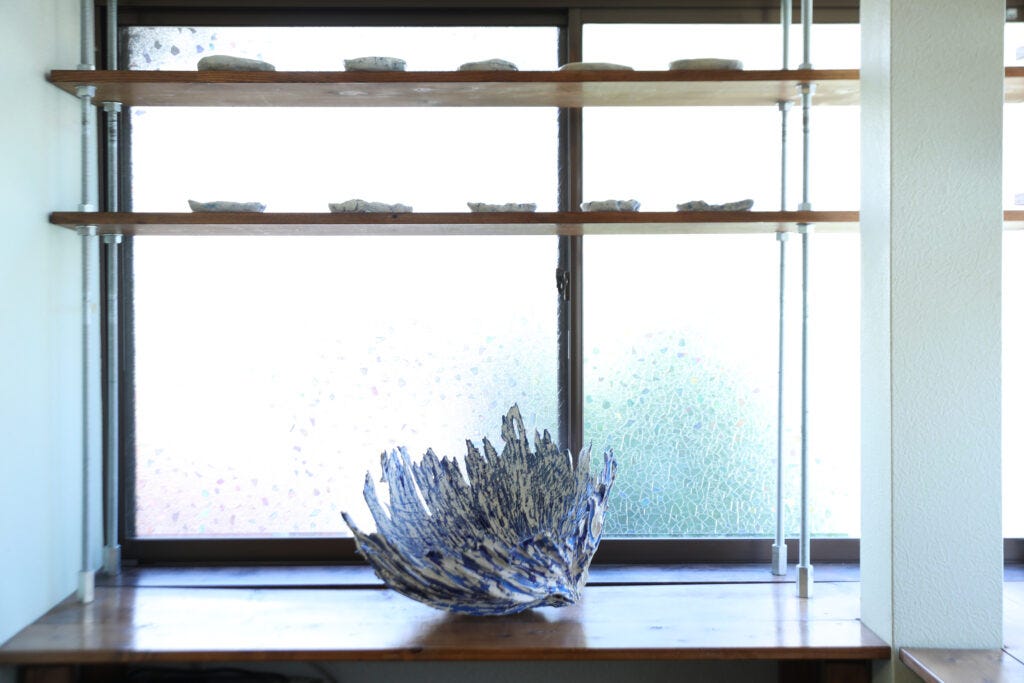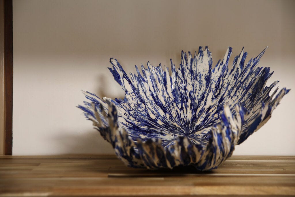 Hashimoto clearly recalls her first encounter with clay at 10. Growing up, she dreamed of making vessels for chic cafes. But after studying ceramics at the Kyoto Saga University of Arts, she began to see clay’s potential for artistic expression beyond the functional and the everyday. She realized that she had to find her own voice, to discover new ways of working with clay. Through persistent research, exploration, and vision, she began to create original ceramic art with her chosen materials: semi-porcelain (white earthenware) and zaffer, a cobalt oxide that allows her to achieve the deep blues she admires in nature.Hashimoto’s hometown, Kyoto, has a special place in her identity as an artist—she’s never lived anywhere else. Kyoto’s rich history inspires her. It is, she says, “the city where tradition and innovation coexist.” Local gallery Sokyo has been her main vehicle to international audiences.