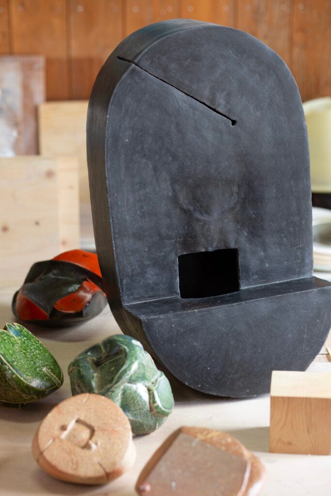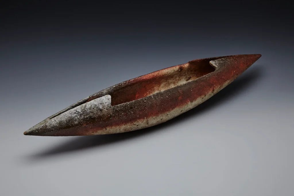Hayashi studied painting in the traditional Nihonga style. During WWII, however, he was forced to leave school and join the Naval Air Force. Afterward, when the economy was destroyed and people were falling into poverty, he went to work at his father’s ceramic studio. Having little interest in throwing vessels on the wheel and inspired by avant-garde art movements of Europe, he focused on developing his own spare and abstract vocabulary in stoneware. At 20, Hayashi cofounded Sōdeisha, an influential vanguard artist collective based in Kyoto that remained active for five decades. Its members sought to push the boundaries of clay as a medium for fine art and ultimately succeeded in giving potters in Japan a new professional identity. Sōdeisha principles—creating non-functional, biomorphic, slab-built sculptures in clay—are clearly present in Hayashi’s work to this day.