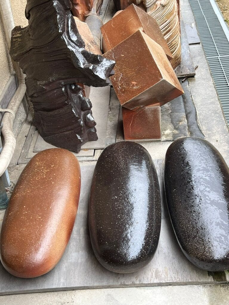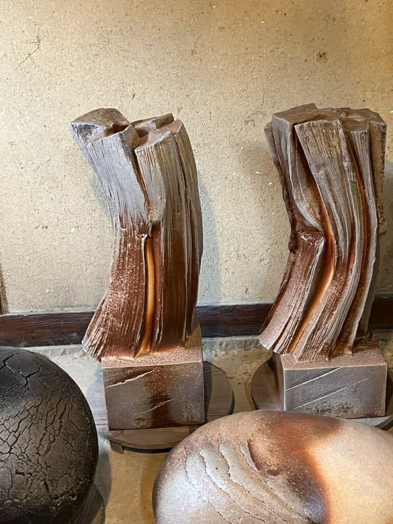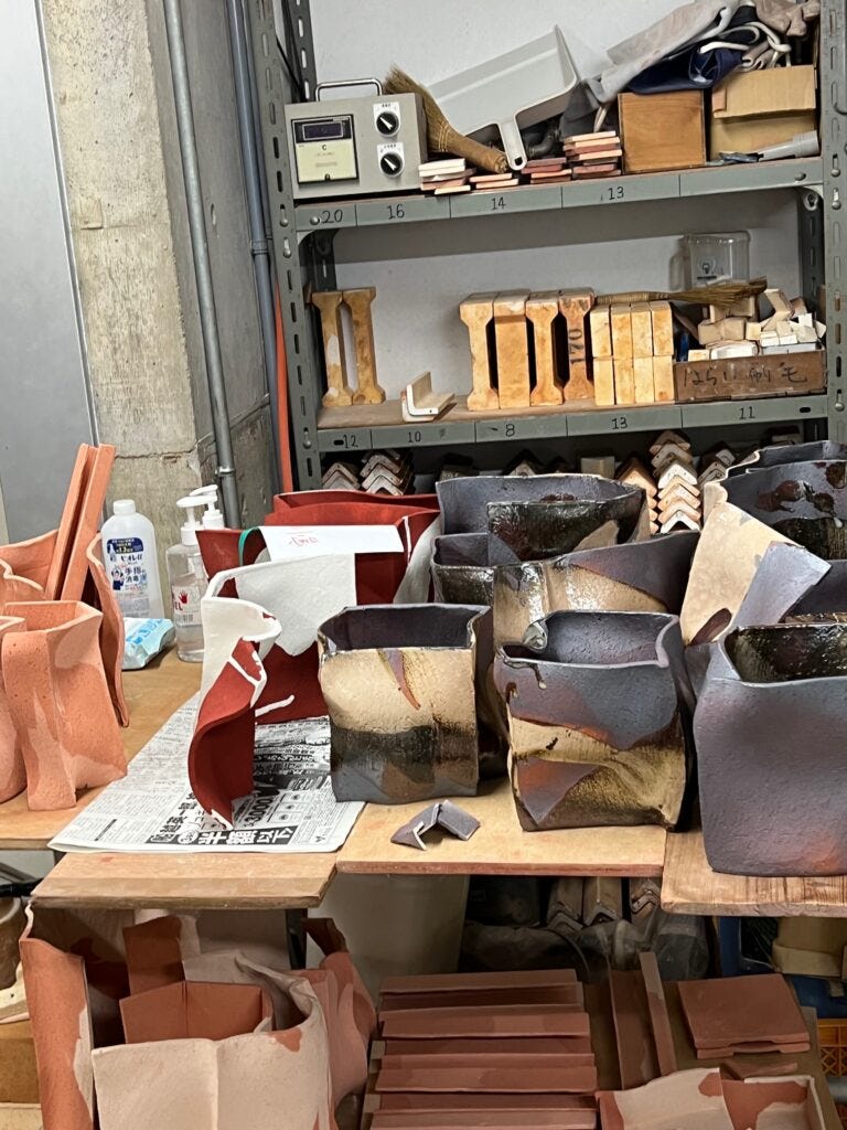 After high school, Kakurezaki pursued a career in graphic design in Osaka. But at age 26, he relocated to Imbe to become a ceramic artist and enrolled in a local technical school. Upon graduation, he landed an eight-year-long apprenticeship with Isezaki Jun. There he built his foundation in the traditions and techniques of ancient Bizen pottery while also developing his personal vision. This vision, he tells me, is not a rebellion, as he has never intended to revolutionize his field. Finding inspiration in the world around him and following his instincts, though, has given him the confidence to pursue new directions. While continuing to craft functional objects for everyday use in line with the local way, he has introduced a fresh approach that he hopes, in his words, “gives back to Bizen.”
