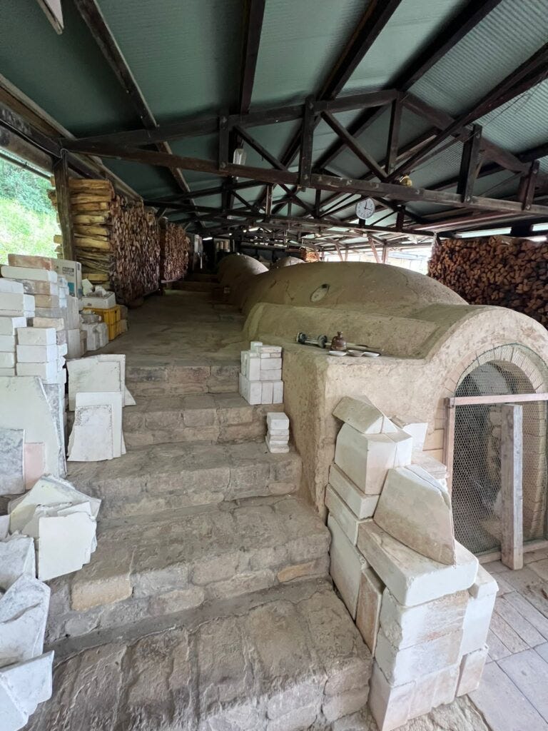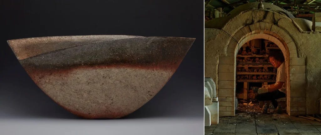 The complexities of producing Bizenware require practitioners to develop extensive experience and skill sets. Every firing, I learned, is planned months in advance down to the last detail. Kakurezaki draws the works he wants to create before forming the clay. Once a year, he uses the enormous red pine-fueled anagama kiln in the back of his studio to fire around 100 pieces at time, each strategically placed in various areas of the chambers to achieve the desired effect. At age 73, he never fails to realize his vision.