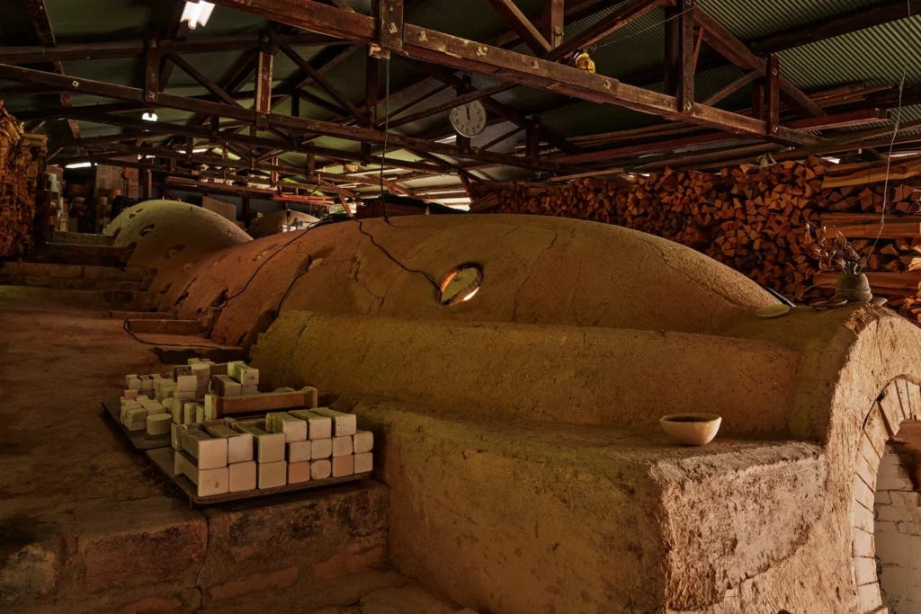 Bizen pottery, produced exclusively in Imbe, has a distinctive appearance and legacy. Featuring an unglazed reddish-brown tone, the vessels are typically shaped on wheels and then slowly wood-fired in enormous stone kilns, called anagama. The interior of these special kilns are constructed in a series of chambers, which hold the pottery during its two-week-long firing process as wood ash settles on the clay and forms a natural, warm-hued glaze. The pottery is then cooled over another two weeks. The finish of each piece is determined by their position within the kiln, and master potters can predict the results by the path of the flames.
