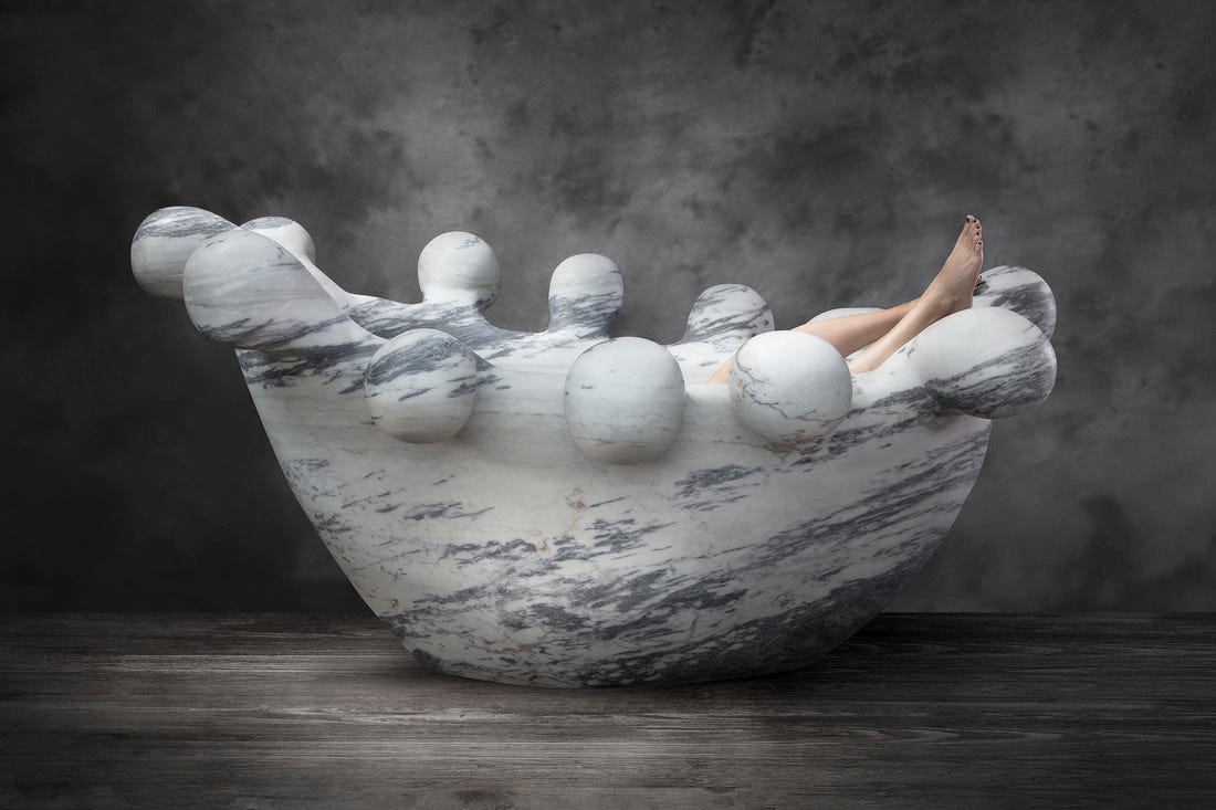 “Bathy Bates” bath tub in hand-carved Pele de Tigre marble. Designed and made by The Haas Brothers, presented by R & Company