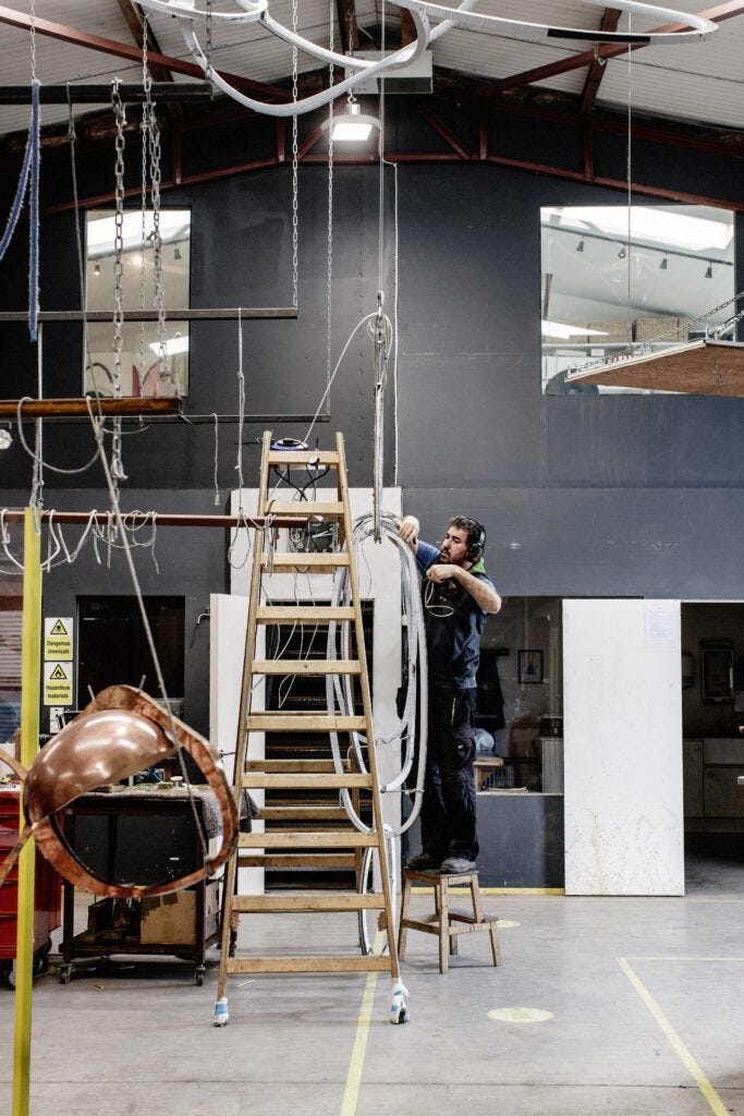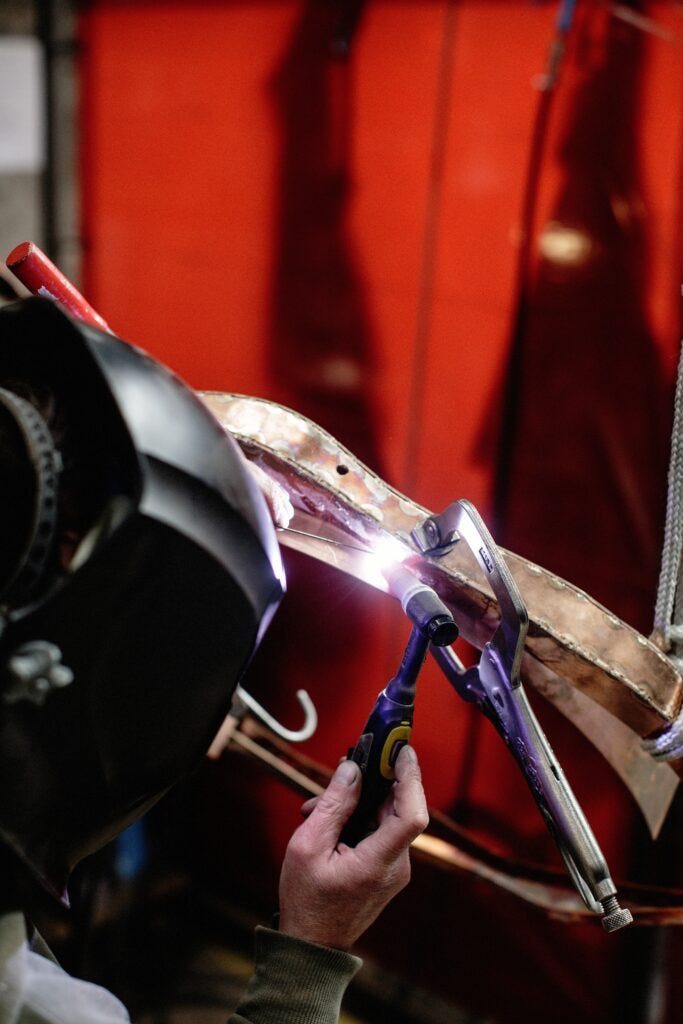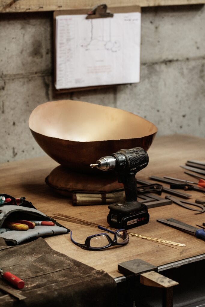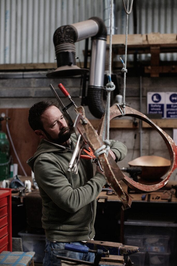 In her studio, situated outside of Dublin and surrounded by the agricultural fields where much of Ireland’s vegetables are produced, Barru leads a productive workshop, emplying six dedicated and skilled craftsmen who craft everything in-house, pieces which are labor intensive and bespoke. The fundamental process of her work is welding, as all the pieces start from bronze sheets—which are then cut, shaped by hand hammering, and welded into forms. They are then polished and finished with chemical patination. The colors, shades, and variations of her patina are nearly endless, and she spends hours experimenting with patina when deciding on the ultimate shade. The result are sculptures, whcih are fully resolved, carrying a sleek and somewhat minimalist sensibility, where forms always triumph/