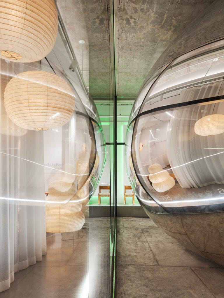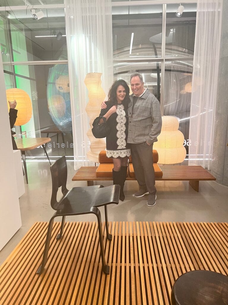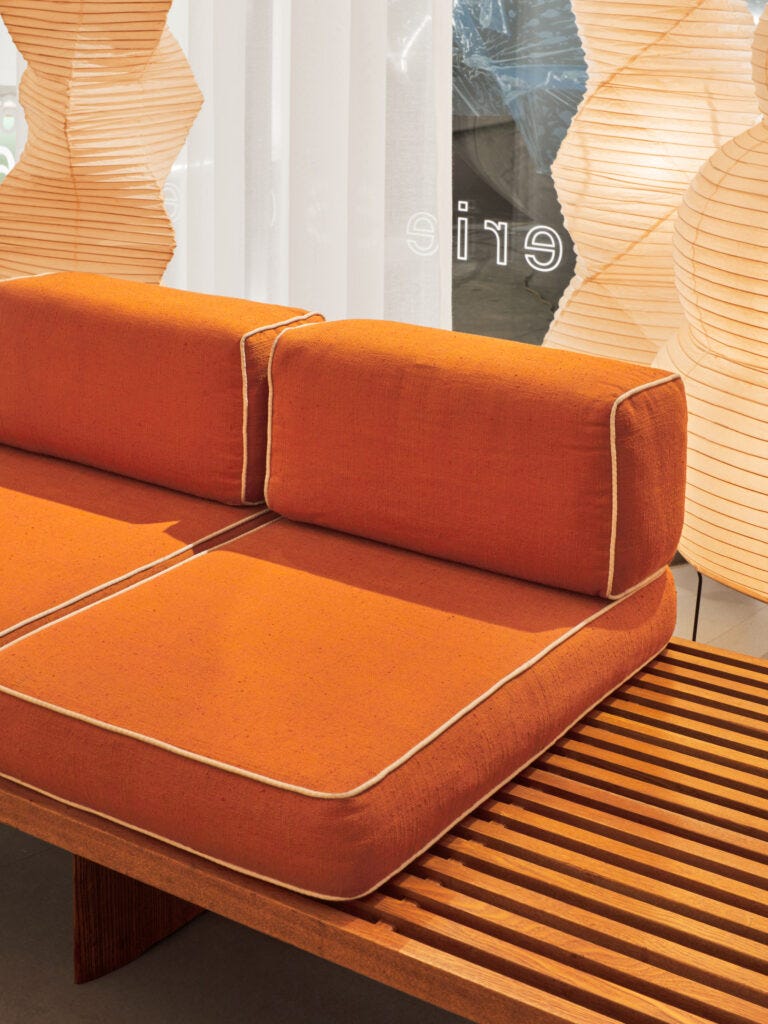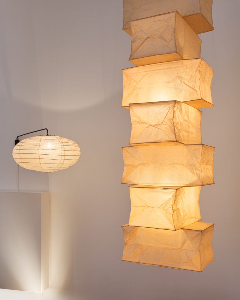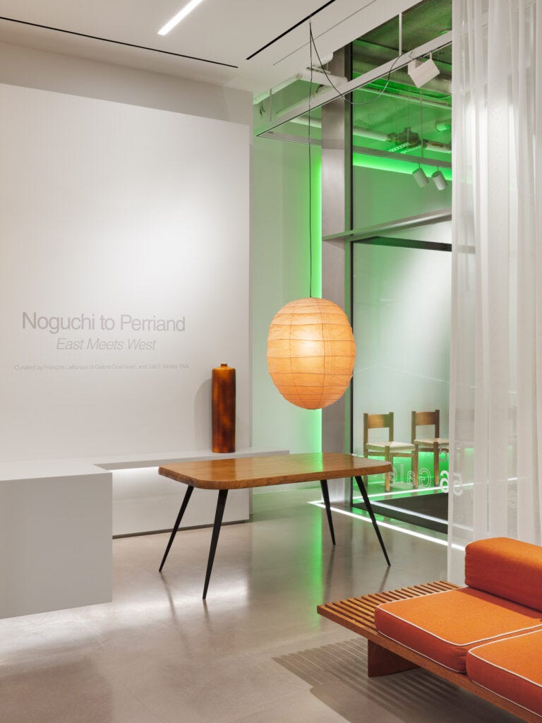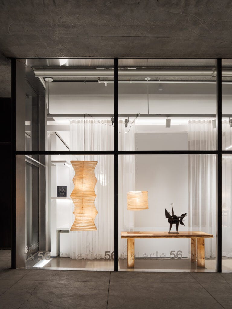 The paths of these two would cross when Perriand’s furniture and Noguchi’s Akari were both represented by Galerie Steph Simon, the key Parisian platform on boulevard Saint-Germain. The successful juxtaposition of Perriand’s simple furniture in wood founded on Japanese principles and Noguchi’s Akari, as seen in many photographs of the exhibitions held at the gallery, attracted such celebrities as Cesar, Brigitte Bardot, Gérard Philippe, and Vadim. Now, the two are coming together again at Galerie56, and the space could not look better: the Akari 21N floor lamp and Akari 30P ceiling lamp, along with Perriand’s famed Shadow chair—which she first created for an exhibition in Japan in 1956.