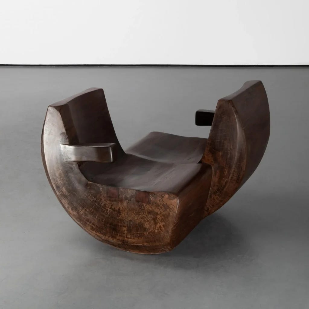 A self-taught architect from the state of Bahia, Caldas launched his career in Rio, earning a reputation as the best architectural model maker in the area. In the late 1940s, he cofounded Fábrica Moveis Artísticos Z, a furniture company dedicated to producing modernist designs in plywood at accessible prices. In the 1950s, he moved back to Bahia and, driven by a passion for forest preservation and environmental stewardship, began to sculpt charismatic, solid-wood furniture from fallen native trees. He used indigenous craft techniques to honor the natural character of the exquisite woods. Exemplifying what Caldas called his “Forest Furniture,”Namoradeira is a double rocking chair crafted from a single massive log. The piece is Caldas’ most emblematic design.
