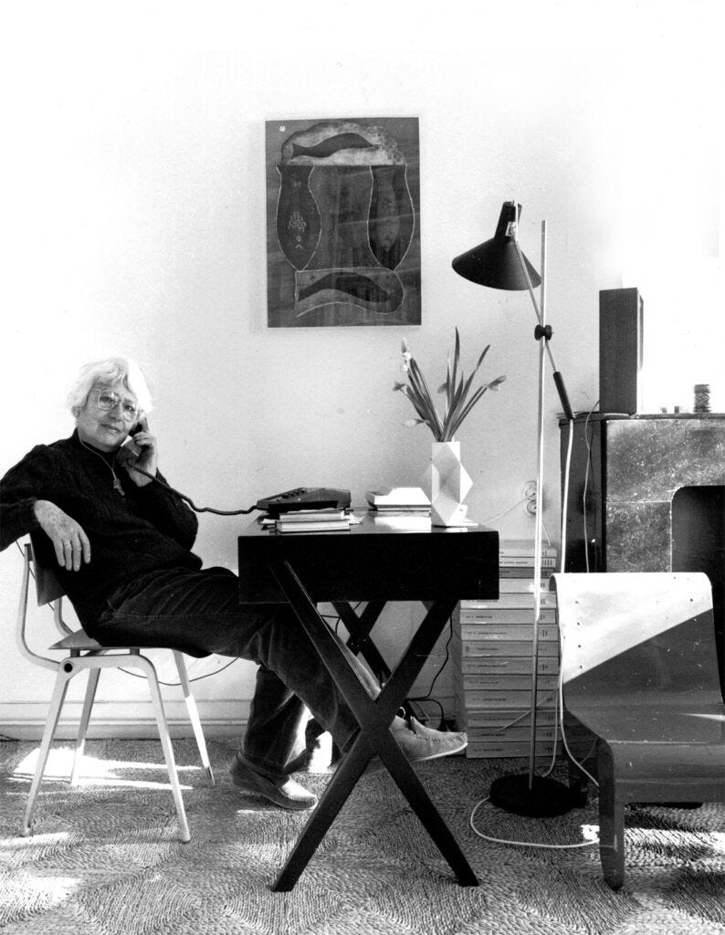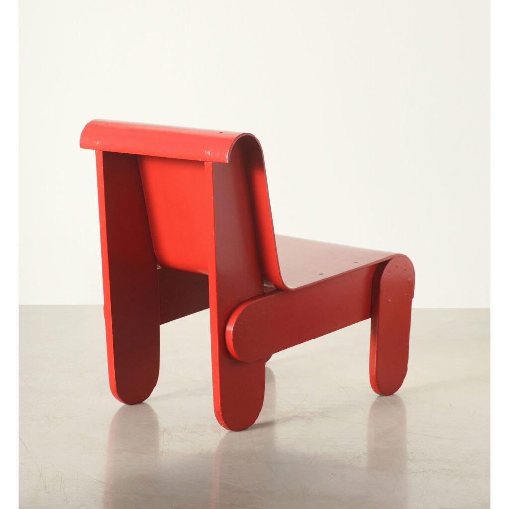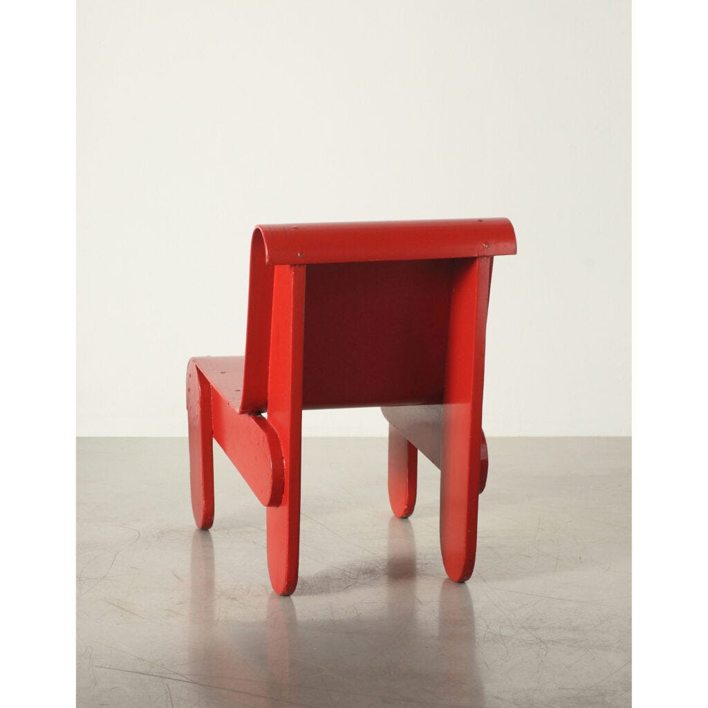 In the 1930s, Rietveld made this little rounded chair for Eva Besnyö, who is seen with it in a vintage photo dated 1939 (see below). Only a handful of this model in plywood were produced by the Dutch architect, one other chair is known to exist today. The photo of Besnyö from 1985 shows again the chair that remained with her daughter after Besnyo died in 2003 at 93; and it has never been on the market before. The chair was only shown briefly at the Centraal Museum in Utrecht in the 1990’s, and was included in a publication entitled ‘The complete works of Gerrit Th. Rietveld.’ Jurgen Creman, a Rietveld specialist restorer has examined the chair and found that its original color was orange before it arrived to Galerie VIVID. This is what I call the power of the provenance of one little red chair.