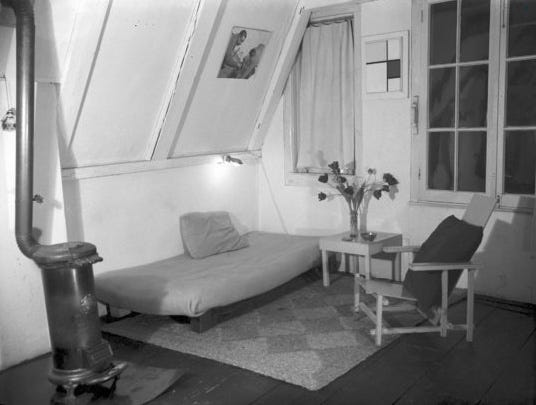 Besnyő (1910–2003) was a Jewish Dutch-Hungarian photographer who was among the pioneer of the New Photography Movement in the interwar years. She created a successful career in Berlin, where she also met John Fernhout, the son of the Dutch painter Charley Toorop, but with the rise of the Nazis, the two moved to Amsterdam where she began photographing the new emerging modernist architecture, and this is when she met Gerrit Thomas Rietveld, the famed Dutch furniture designer and architect. It was following his departure from De Stijl group and becoming associated with the Dutch functionalist style, known as the Nieuwe Bouwen, that they two had met and became friends. Her taste for the modernist aesthetics of De Stijl can be seen in another period photo of 1933, showing white chair by Rietveld along with a painting by Piet Mondrian in the living room of her home in Amsterdam.
