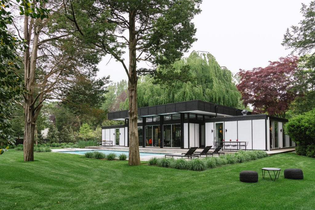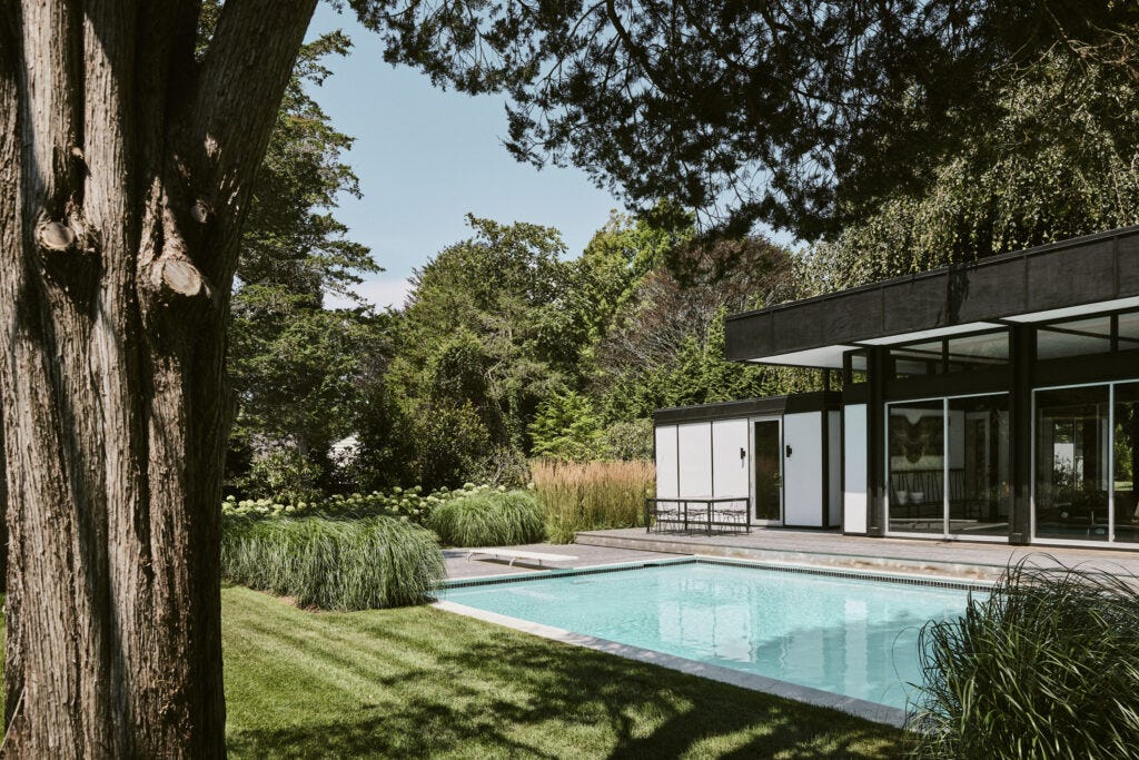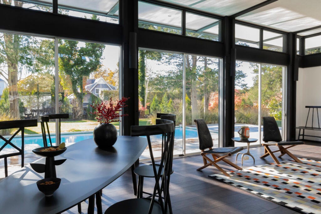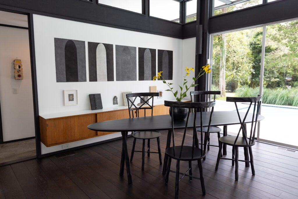 This glass house was Perry’s starting point; it was like love at first sight—an embodiment of her memory and identity. It resembled the glass house in Chicago in which she grew up, and which no longer survived. That house was designed in 1962 by Austrian-American architect and modernist Paul Lester Wiener, who had famously collaborated with Spanish architect Jose Luis Sert for Havana and Bogota. In New York City, he made his name with his master plan for the beloved Washington Square. He created this house in an orthodox International Style, modeled after Mies van der Rohe’s black-painted-steel-and-glass National Gallery of Art Berlin, the glass and steel temple of art, designed at the same time. This dramatic glass villa is pure, bold, and simple, with dramatic scale anmd breathtaking atrium, commissioned by prolific art collector Robert Scull. With its floating roof, this glass house perfectly fit his taste for Minimalism and Pop Art. Today it is the backdrop of Perry’s collections and exhibitions. With a typology of open plan and monumental transparency it could not be a bette fit for showcasing modern and contemporary design.