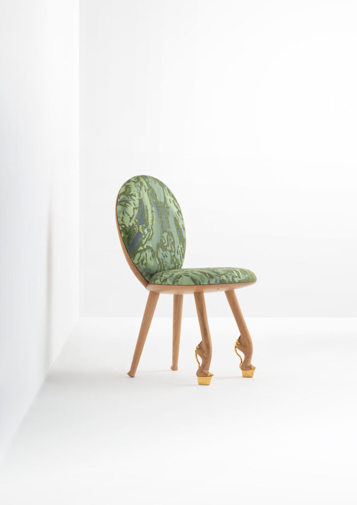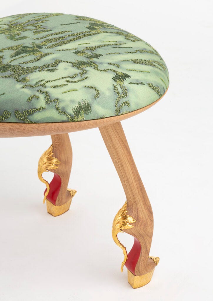 The first series of limited edition chairs includes pieces inspired by muses of the past—women from mythology and film. Each is represented by a chair which tells her story. Dita von Teese, the model known for taking audiences on fantastical journeys with ornate sets and dazzling haute couture performance costumes, is represented with a chair which captures her burlesque costume with an embroidered and laser engraved upholstery. Queen Nefertari, the wife of Egyptian Pharaoh Ramses II, is represented in a chair of embroidered and laser engraved upholstery seat, capturing her famed headdress. Madame Pompadour is dressed in gilded metal heels that look just like Rococo’s crescent in the same green as her dress in her most iconic portrait by Francois Coucher.