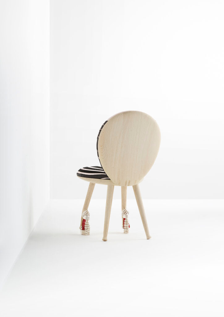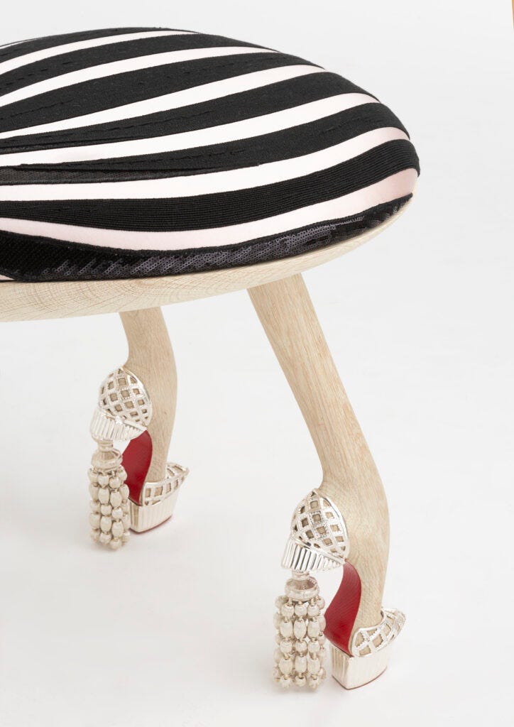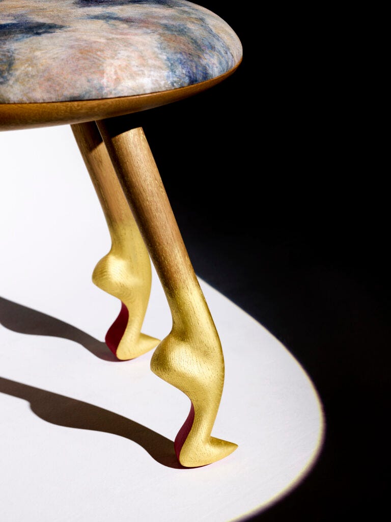 The second series, entitled Simply Nude, is about women of the present, those, like me, who love wearing nude shoes, as it is a nod to Louboutin’s renowned Nudes shoe collections. The shoe designer realized that there are various shades of skin and not one nude fits all. This series of five female-inspired silhouettes offered in a variety of wood colors are meant to reflect feminine strength and unique beauty. These chairs are produced in an open edition.