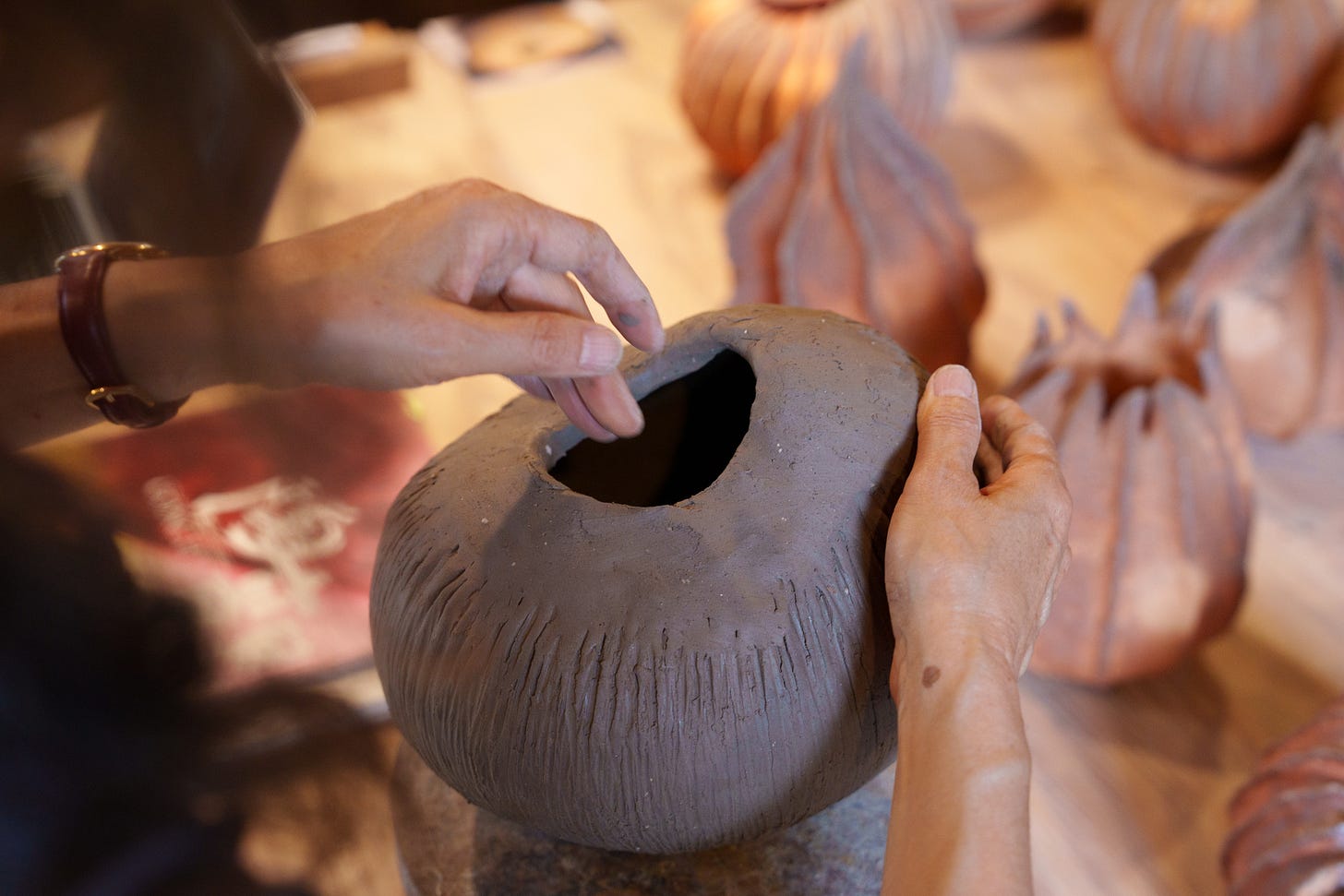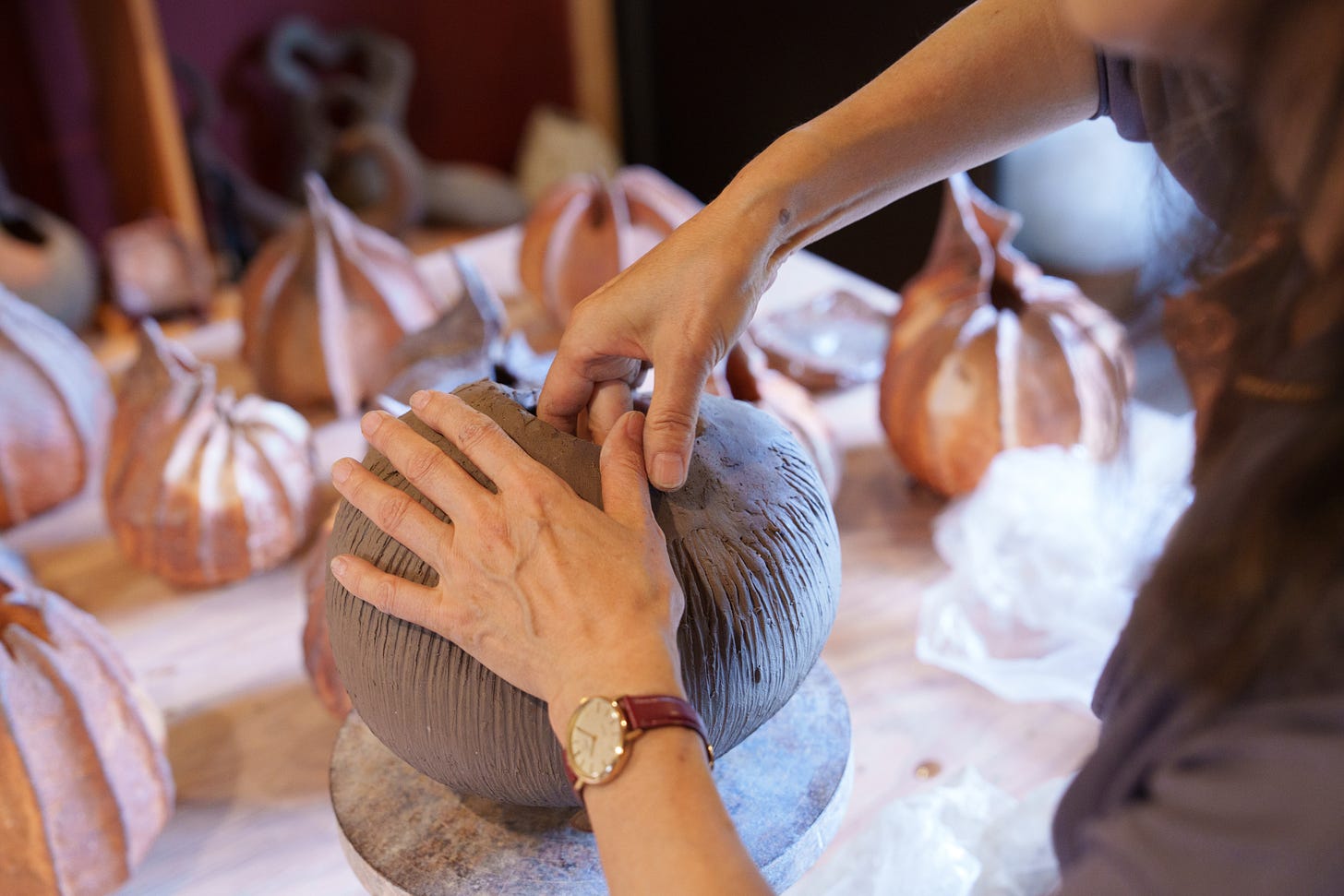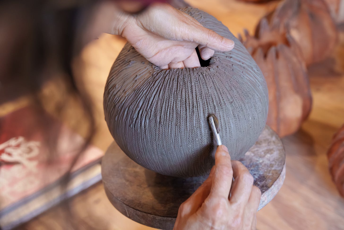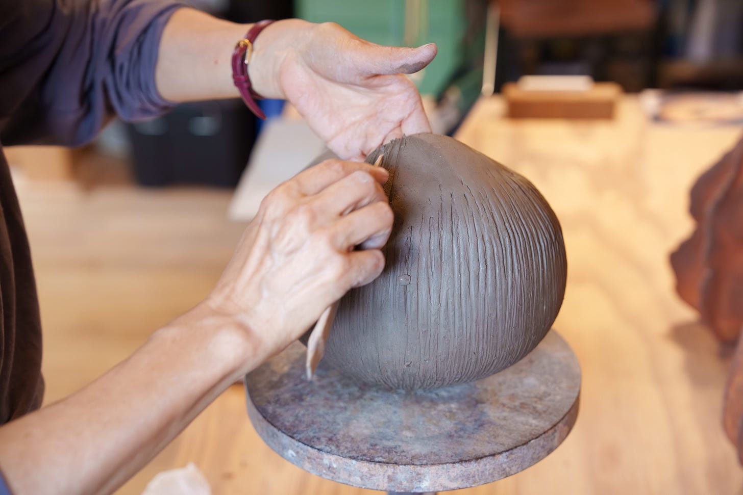 I loved watching her as she demonstrated her personal technique and interacted with the clay. She hand-builds her sculptures in the coiling method, creating her distinctive organic forms, which are energetic and look as if they are melting. Each piece is then textured using a tracing wheel sewing tool which leaves the linear textures that look as if textile is wrapped around the vessel. The work is then fired in an anagama kiln which is heated by burning wood. The effects of the firing bring out the essence of her work, she says. Allowing the ash the freedom to fall naturally on the surfaces of the vessels, without interruption, is what causes the accidental marks on her pieces—her signature. They look like enormous lights spots, shining on the textured surface, honoring the concept of the imperfection, and in their own way, mimicking nature. Takeshita-Keane has certainly found her own tools, and her own voice, carrying the Japanese heritage into the 21st century.