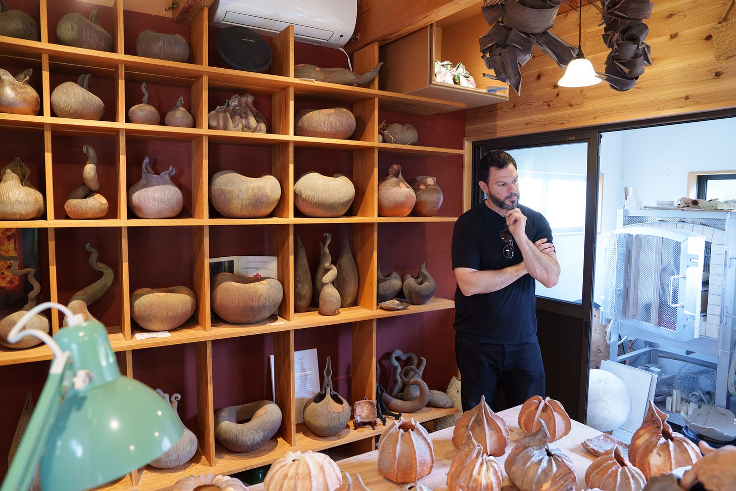 When I first saw her series of vessels at the Parisian Galerie Mingei representing her art, I knew that I wanted to meet her and to learn more about her mysterious, somewhat enigmatic body of work. Her sculptures seem to fall between the contemporary and the historical, between the rustic and the refined, the simple and the complex. They are curled up and down in distorted organic forms, like the vibrant autumn leaves in Kyoto’s legendary foliage. Takeshita-Keane, like many of her peers, view the vessel form as her point of departure for her non-functional sculptures, and they look like totems of spiritual significance, like symbols, signs … something that I could not ‘read’ at first.
