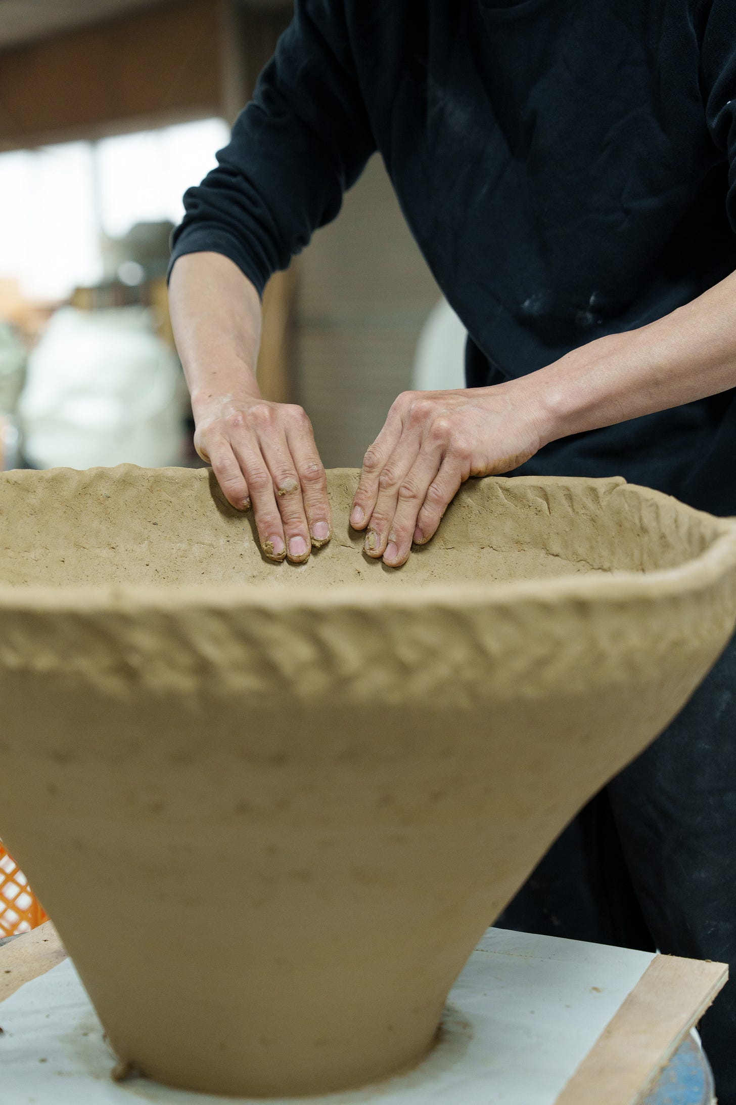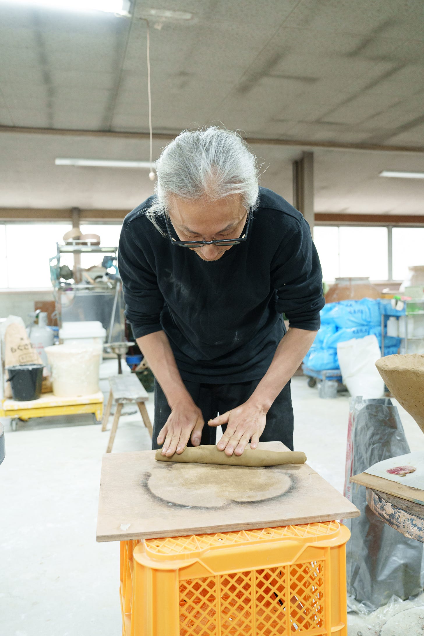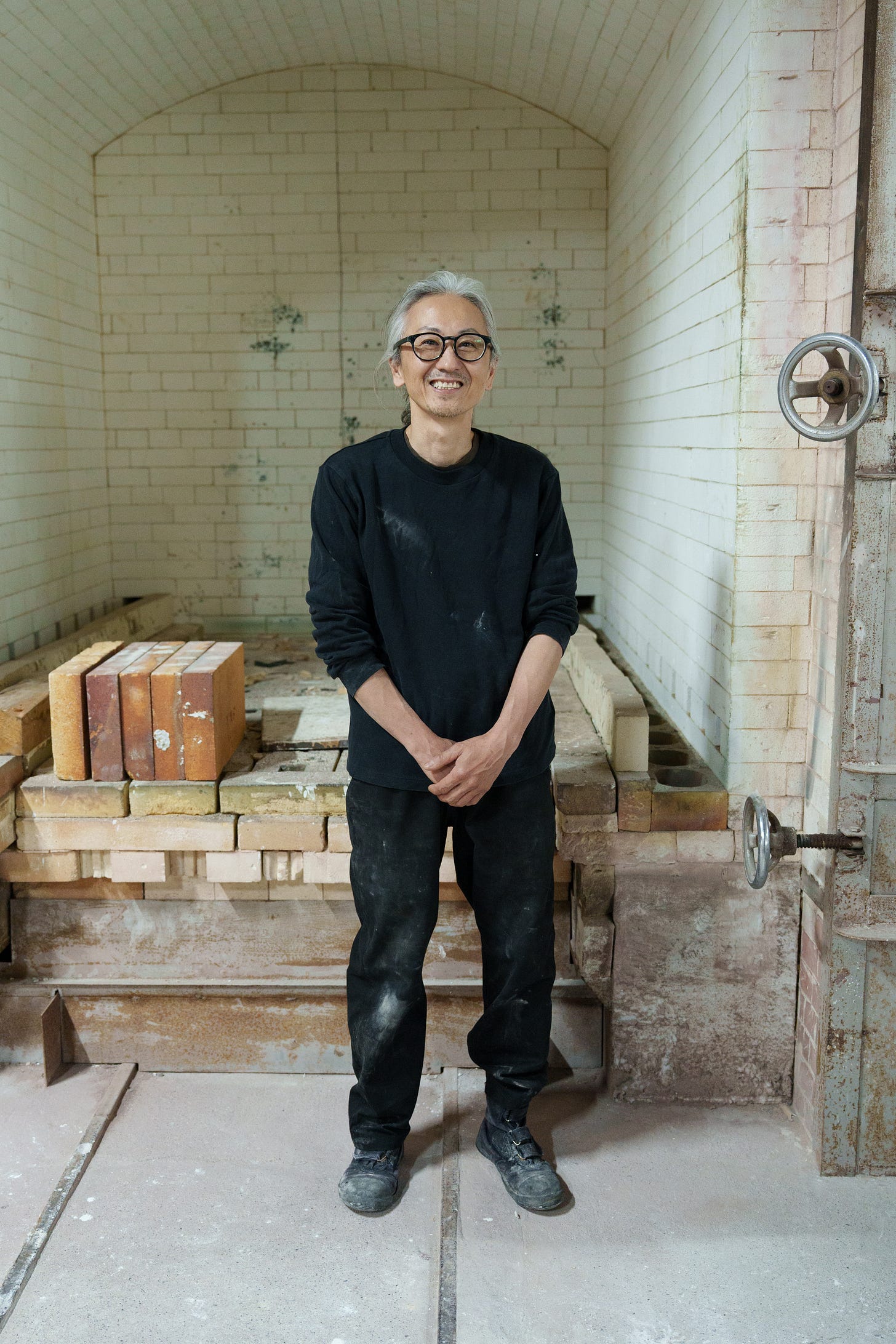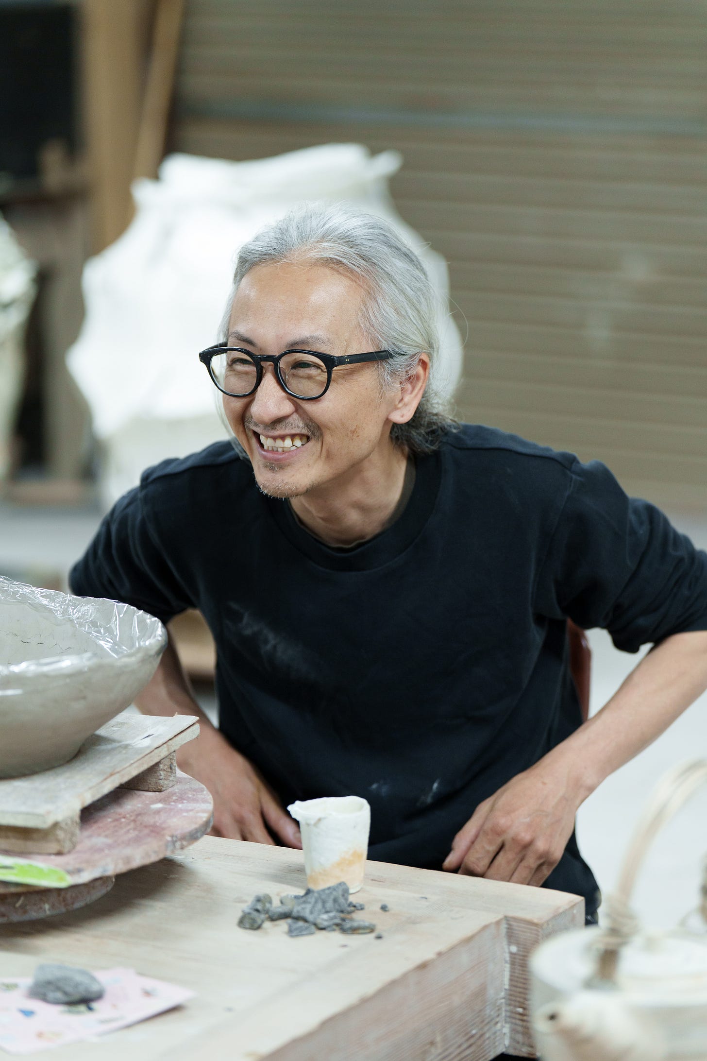 Yuji Ueda was born and raised in Shigaraki, one of Japan’s historic cradles of pottery, known for its local stoneware and climbing kilns, classified as one of Japan’s six ancient centers for pottery. His parents owned a tea farm, and growing up between tea and clay, the two premier local industries, shaped Ueda’s desire to become a ceramic artist. The region is known for the production of distinctive clay figurines in the form of a comical raccoon dog, used in Japan as lucky charms, and attracting tourists to the area. As we drove toward Ueda’s studio, we passed by thousands of them on display in storefronts, in warehouses, and gardens, along the narrow roads; Udea’s work could not have been more different from the ostentatious folklore figurines of his birthplace.