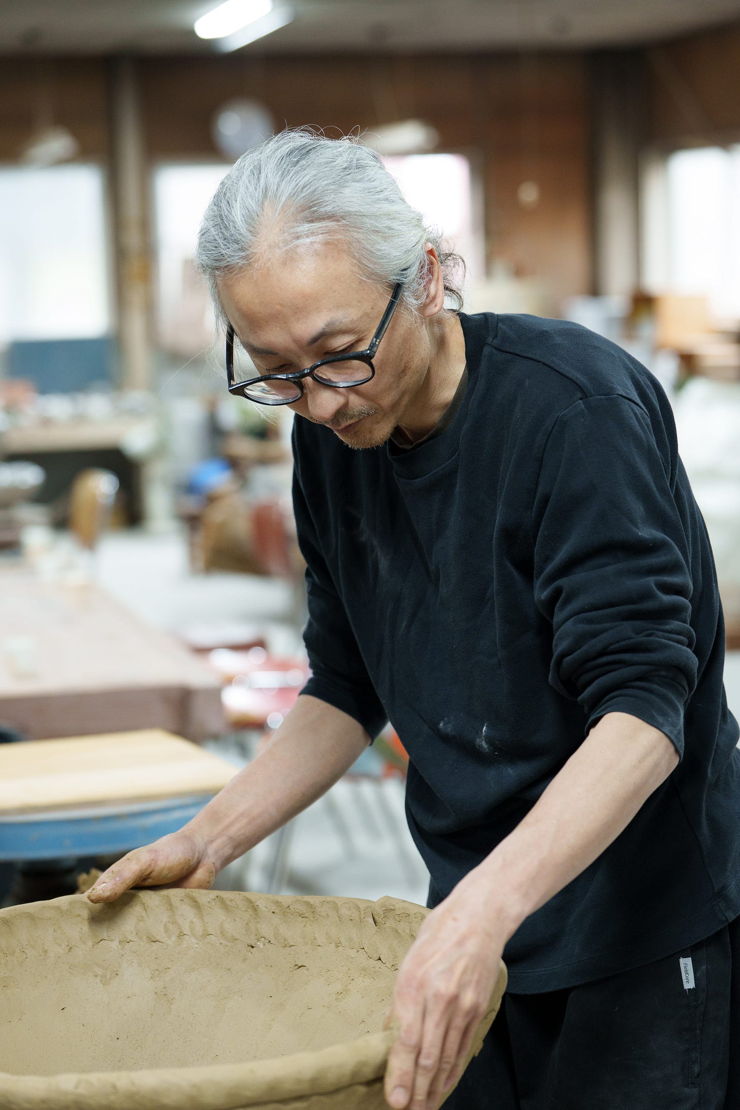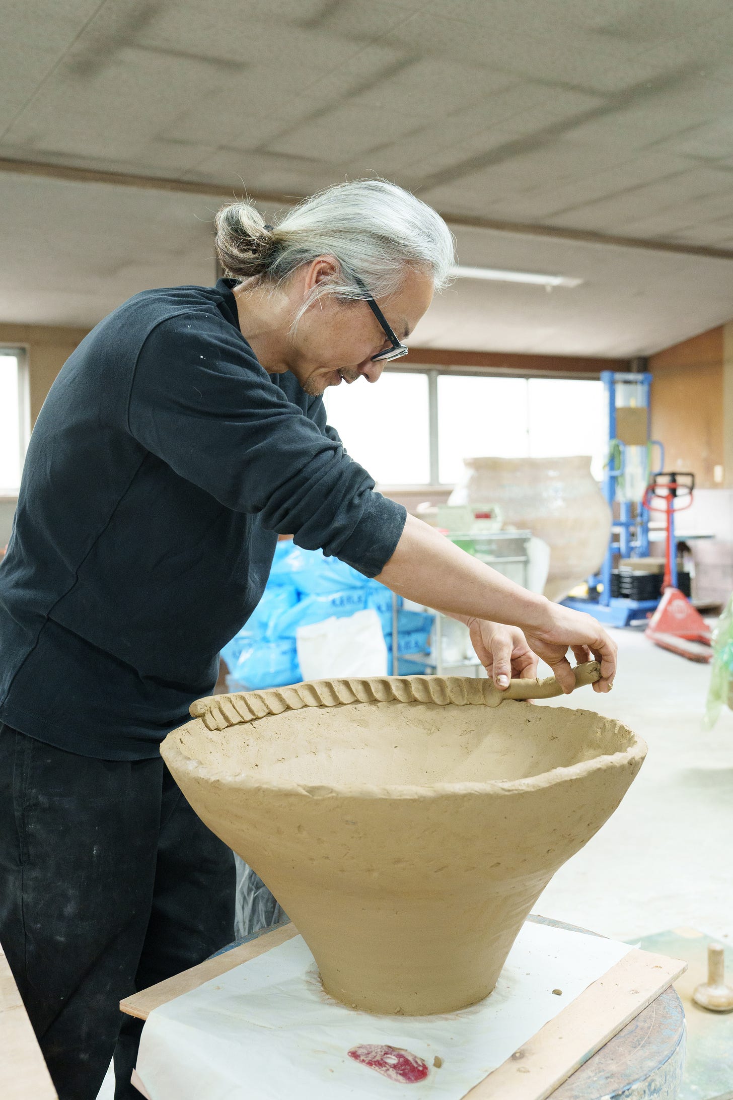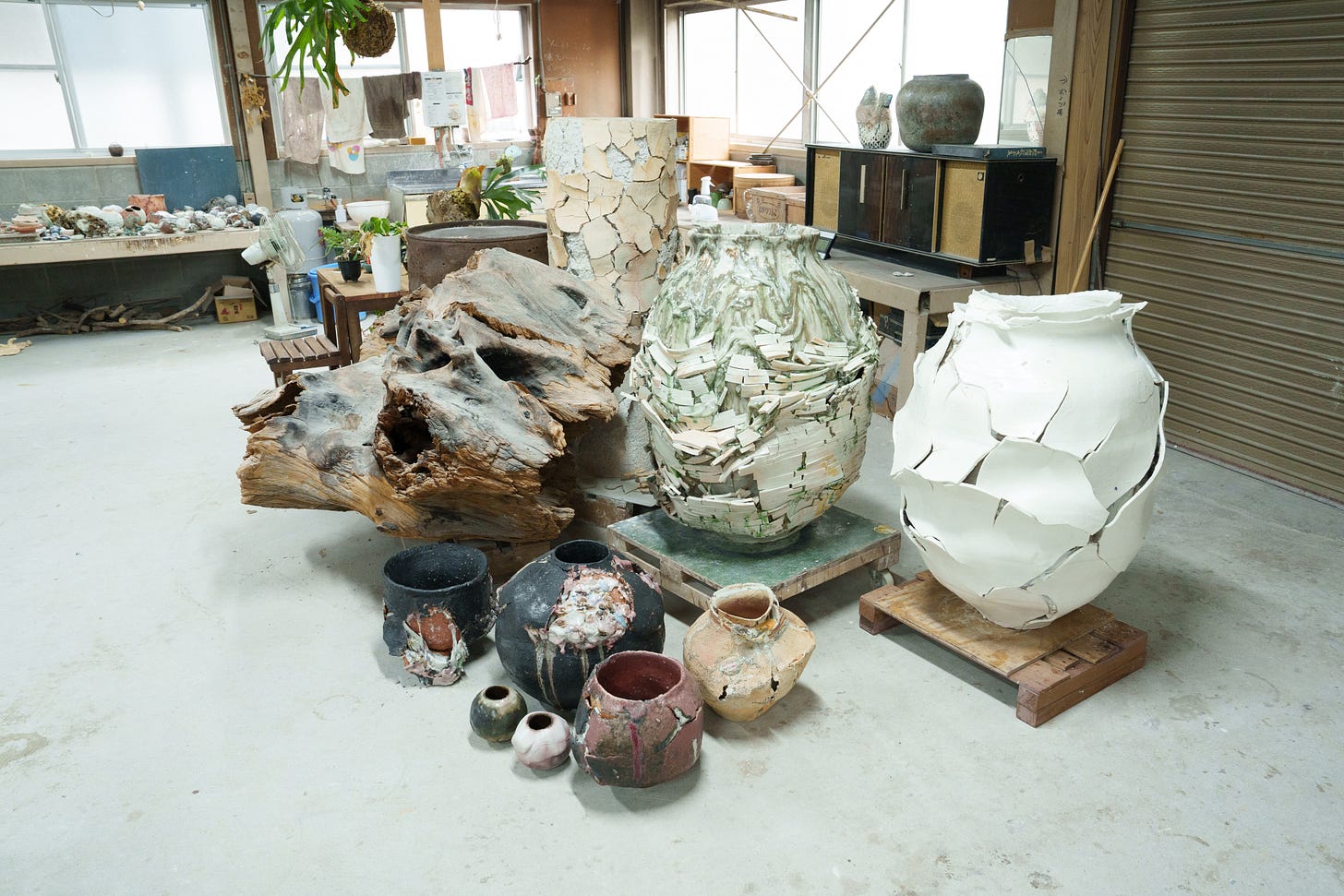 In fact, his abstract contemporary art in clay exemplifies the loose affiliation between traditional folk Japanese ceramics and contemporary kogei, the topic of this series of articles, where the new generation of Japanese craftspeople and artists use craft mediums – bamboo, clay, lacquer, fiber, wood – to create contemporary art, both functional and non-functional. As you enter the expansive studio situated in a former factory, which he shares with his ceramicist wife, you immediately feel the energy and creative mood. He did not study ceramics in school, but upon graduating with a degree in chemistry, he was trained as an apprentice with legendary Shigaraki ceramicist Kamiyama Yasuhisa, who became known internationally for his mastery of wood firing and heavily textured pieces. Yasuhisa’s vision can be found in Ueda’s oeuvre.