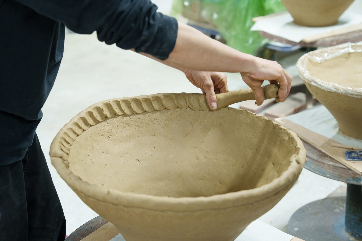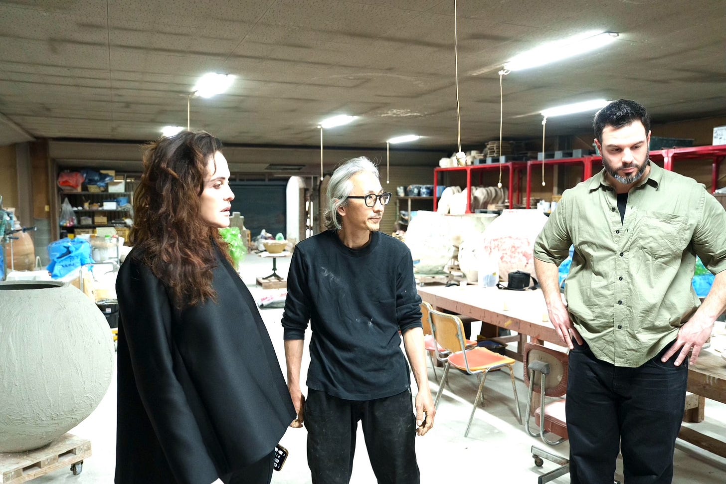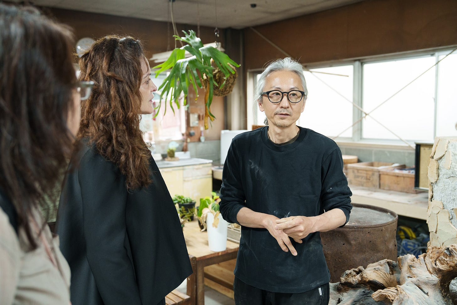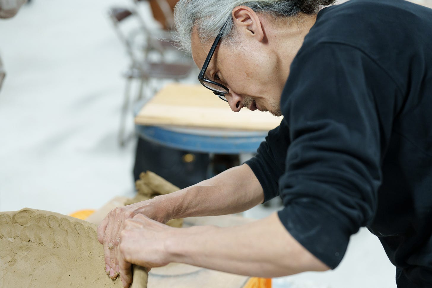 In fact, his abstract contemporary art in clay exemplifies the loose affiliation between traditional folk Japanese ceramics and contemporary kogei, the topic of this series of articles, where the new generation of Japanese craftspeople and artists use craft mediums – bamboo, clay, lacquer, fiber, wood – to create contemporary art, both functional and non-functional. As you enter the expansive studio situated in a former factory, which he shares with his ceramicist wife, you immediately feel the energy and creative mood. He did not study ceramics in school, but upon graduating with a degree in chemistry, he was trained as an apprentice with legendary Shigaraki ceramicist Kamiyama Yasuhisa, who became known internationally for his mastery of wood firing and heavily textured pieces. Yasuhisa’s vision can be found in Ueda’s oeuvre.