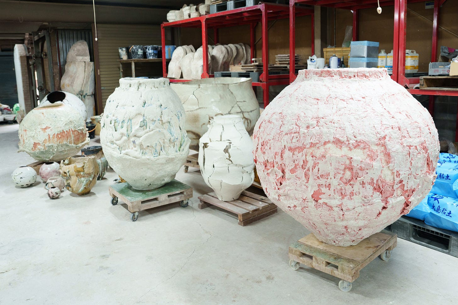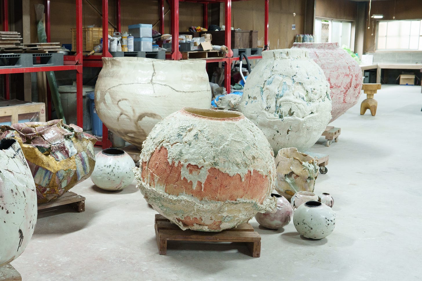 Ueda has transformed the functional vessel—his key form—into a non-functional fine art sculpture. He uses the method of coiling as he hand-builds his forms of thick coil of local red clay. But the vessel serves only as the canvas which he then ‘dresses up’ with special skin—his signature—turning the simple form into a complex artistic expression. Experimentations with glazes and firing techniques have led him to invent that rough, somewhat brutalist skin rendered in multiple layers of textures and colors, which bring a vibrant and energetic spirit to the otherwise plain vessel. ‘I value embracing the inherent texture of clay, as well as cracks, peeling, and distortions that occur by chance, and elevating them to elements of beauty,’ he told me. But ultimately, he seeks to ‘express the relationship between people and nature, and the vitality inherent in the material itself,’ which is the core narrative of his work.