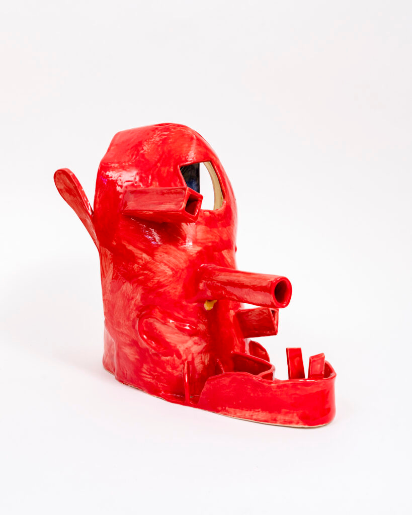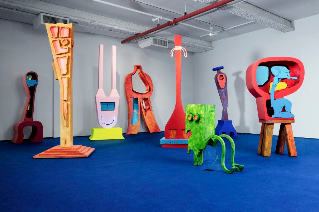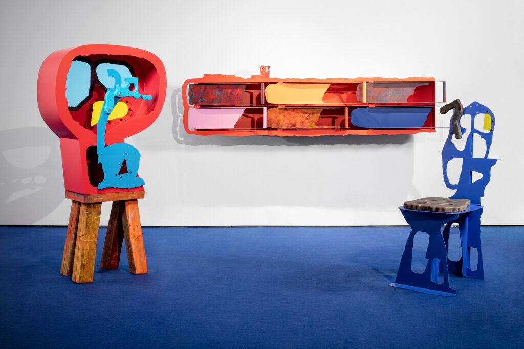 I particularly loved the series of cabinets—colorful creatures crafted in metal, wood, and clay. Each is different, each has its own distinct personality, each was crafted somewhat spontaneously, and as a group, they look musical, and alive, like aliens from another planet wandering about this new world, created by the artist. Some are energized by neon lights; others by shiny plexiglass features. The viewer walks among them, in this unfamiliar world, as if stepping into a children’s science fiction film, set in the 22nd century. The aesthetic phenomena and the extreme colors bring a spectacular energy to the space and to the experience, calling to mind the stories of the creation of the world.