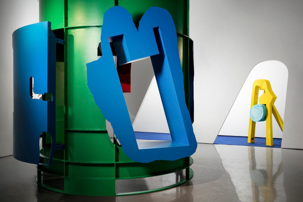 The centerpiece of this show is an enormous, 22-foot-tall ‘Tower for an Hour,’ a metal functional sculpture in green, blue, and red, commissioned for the back garden of a New York City townhouse, and fits in the space as if it were site-specific. It is called a ‘folly,’ constructed traditionally to decorate 18th-century English gardens, meant for reflection, rest, and play in the Romantic world. Ionescu’s training as an architect is evidenced in his large-scale garden structure.