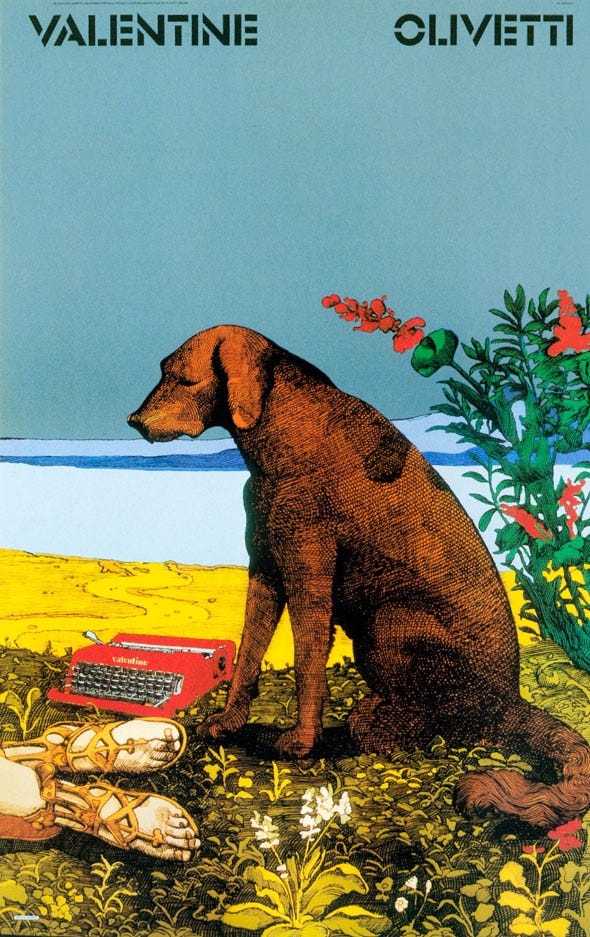 One of the objects presented in the new Sottsass exhibition at Met Breuer, a small, red, jeweled object of an enormous impact, that was considered by the late designer as a mark of the turning point in his career, and I am talking about the Valentine portable typewriter. An icon of sixties design, it is remembered from the ad by American graphic designer Milton Glaser who used a detail of Piero di Cosimo’s painting ‘Satyr Mourning over Nymph,’ inserting the Valentine into a r\Renaissance landscape next to a dog, suggesting the two as man’s best friend. It also remembered from the the famed photo of Richard Burton and Elizabeth Taylor arriving at Heathrow Airport in 1970, it captures much of Sottsass’ vision and innovation. It is colorful, sexy, and as glamour as the movie stars carrying it, as the stylish poets that the designed envisioned when creating the typewriter. Immediately after Sottsass designed it in 1969 with British designer Perry King for Italian firm Olivetti, it had become a global immediate sensation. And while it is a part of types of consumer goods long passed from the world — ashtrays, dressing tables, makeup cases, brooches — it is still as intriguing as it was when first introduced. The Valentine was to the 70s what the iPhone was to the 2000s, and it was a symbol of Pop Culture and of the Postmodernist movement. It manifests the notion that design should not focus only on functionalism, but that it should rather contain other emotional values and sensual qualities. Originally came in a variety of colors, it was red which has become the most memorable, the most iconic, despite the fact that the Valentine had never appealed to the mass market because of its unaffordable tag price.