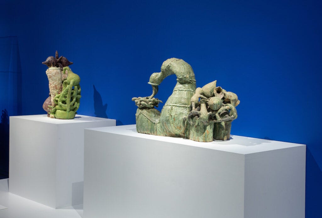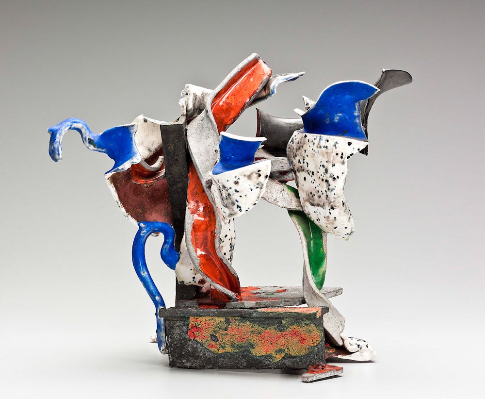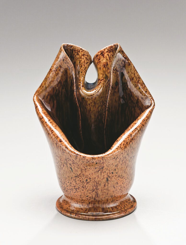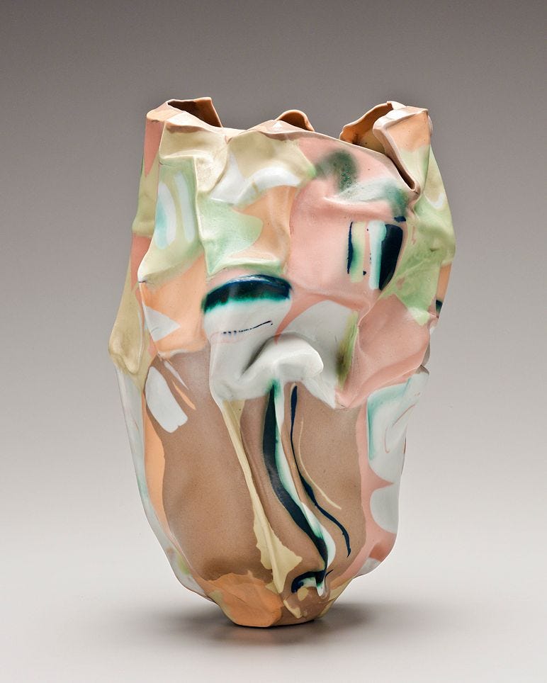 The earliest examples in the show are by George Ohr (1857-1918), the American ceramicist who created expressive, abstract vessels that were ahead of their time. Little known during his lifetime, Ohr studied ceramics at Newcomb College Art Pottery in New Orleans, and was based in the South, moving between New Orleans, Louisiana, and Biloxi, Mississippi. It was not until the 60s that his genius was discovered, and today his pieces are shown in art museums, such as MoMA, as an example of early and abstract modern art.