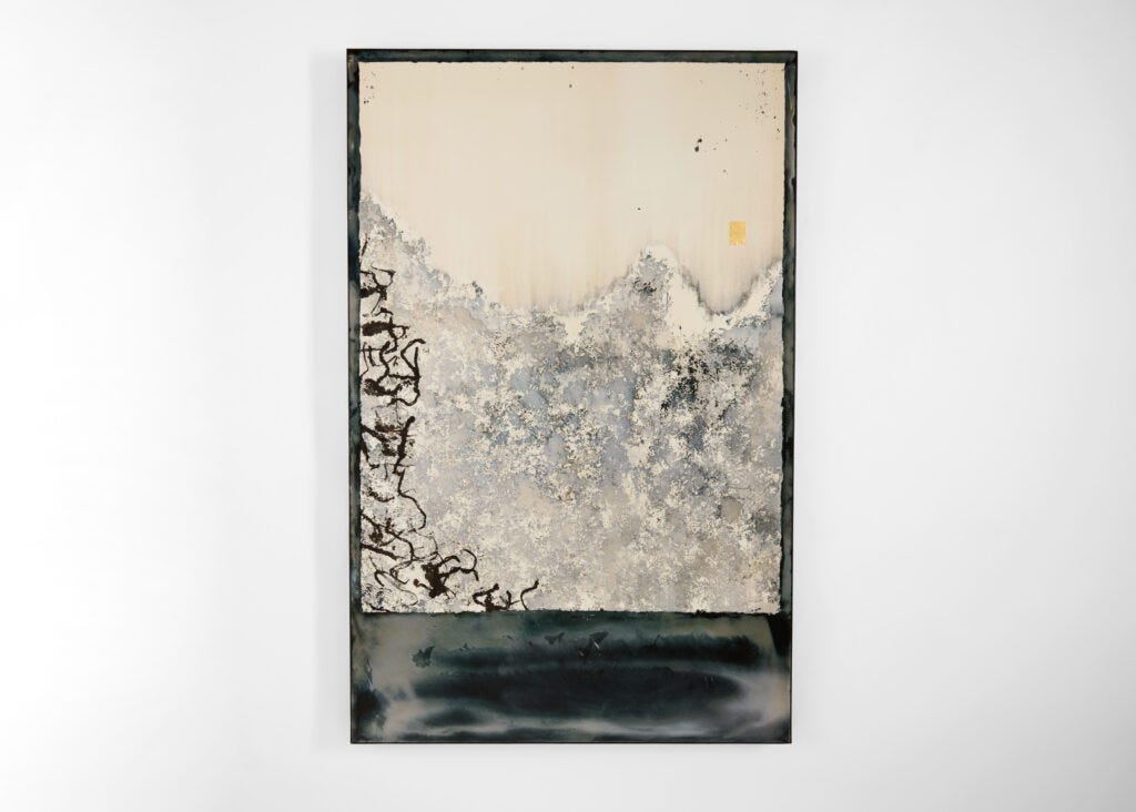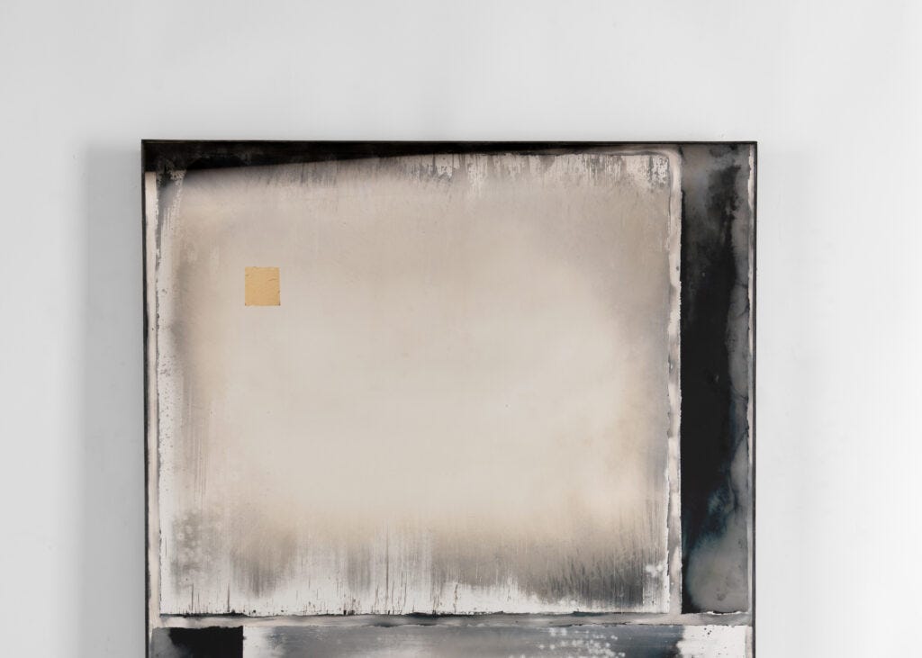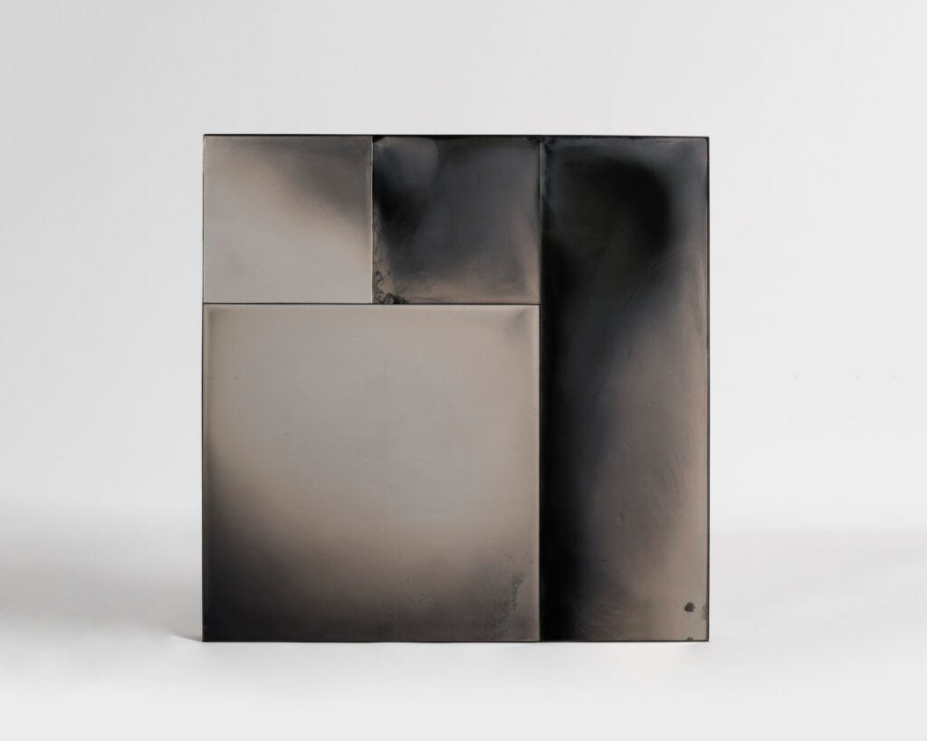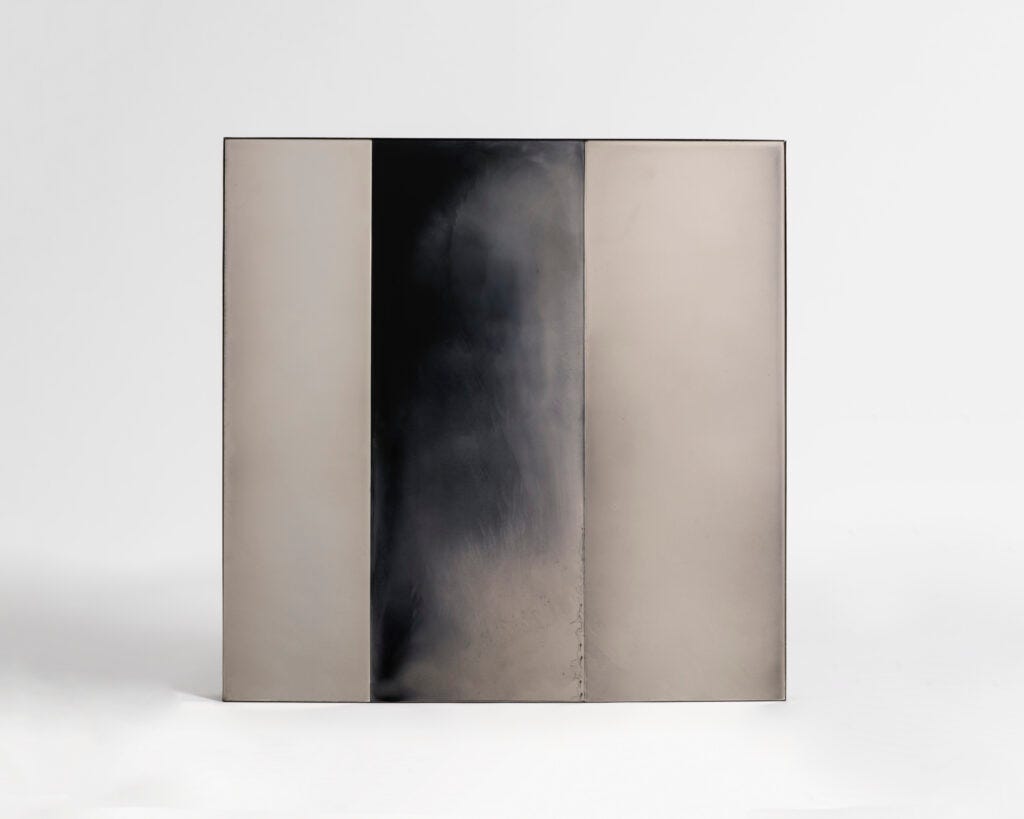 With his innovative personal technique, bringing glass and silver together and creating effects of smoky, mysterious surfaces with layers and layers of lights and shades—mystifying pieces that act as both mirrors and painting at once, López has demonstrated his proclivity for the unexpected. Think about glass surfaces that look like an Abstract Expressionist painting, or like a Japanese screen, with geometrical modular or city skyscapes seen through smoky, misty, somewhat gloomy landscapes which are then embellished with small patches of gold leaves. The patina makes them look as if they were aged naturally. Through these works, López seeks to create an experience that is both personal and confrontational at the same time by evoking various contradictions: positive and negative, dark and light, solid and transparent; all resulting in extraordinary surfaces that engage the viewer through reflection. He calls them “shadow drawings,” for their compositions that stand between art and design.
