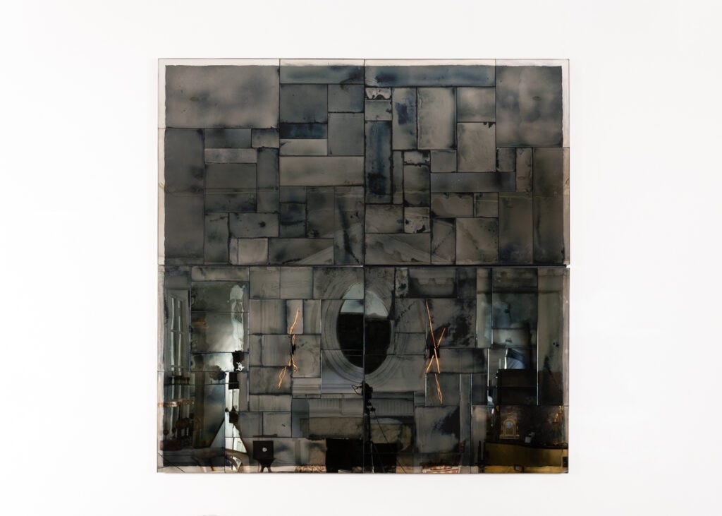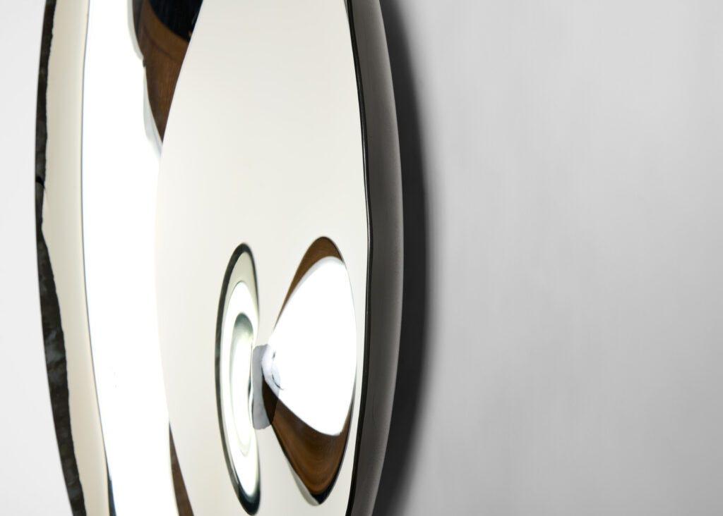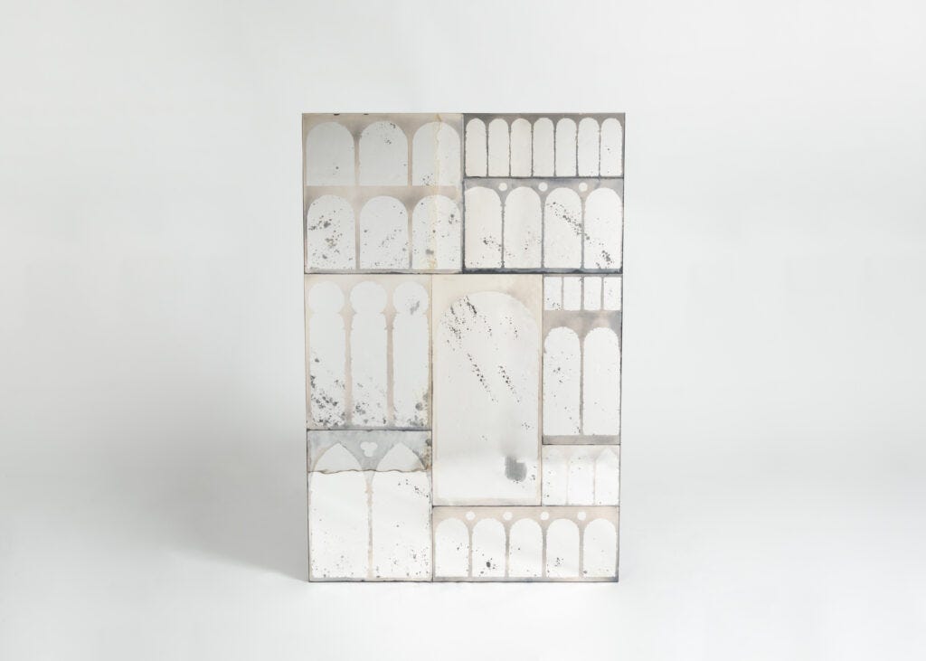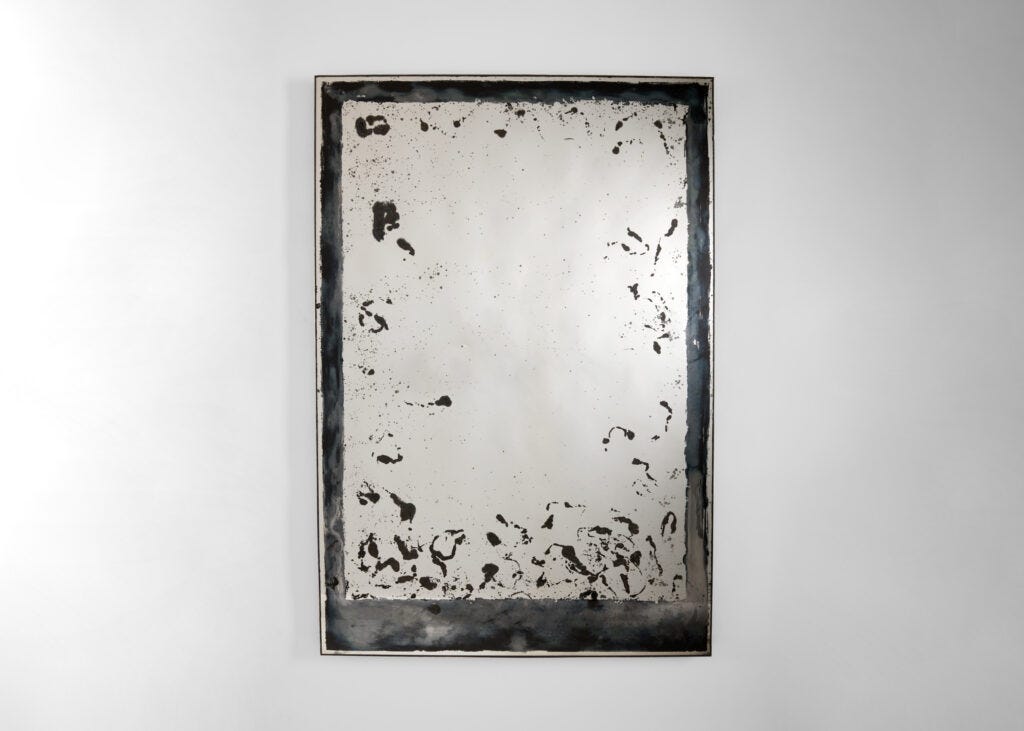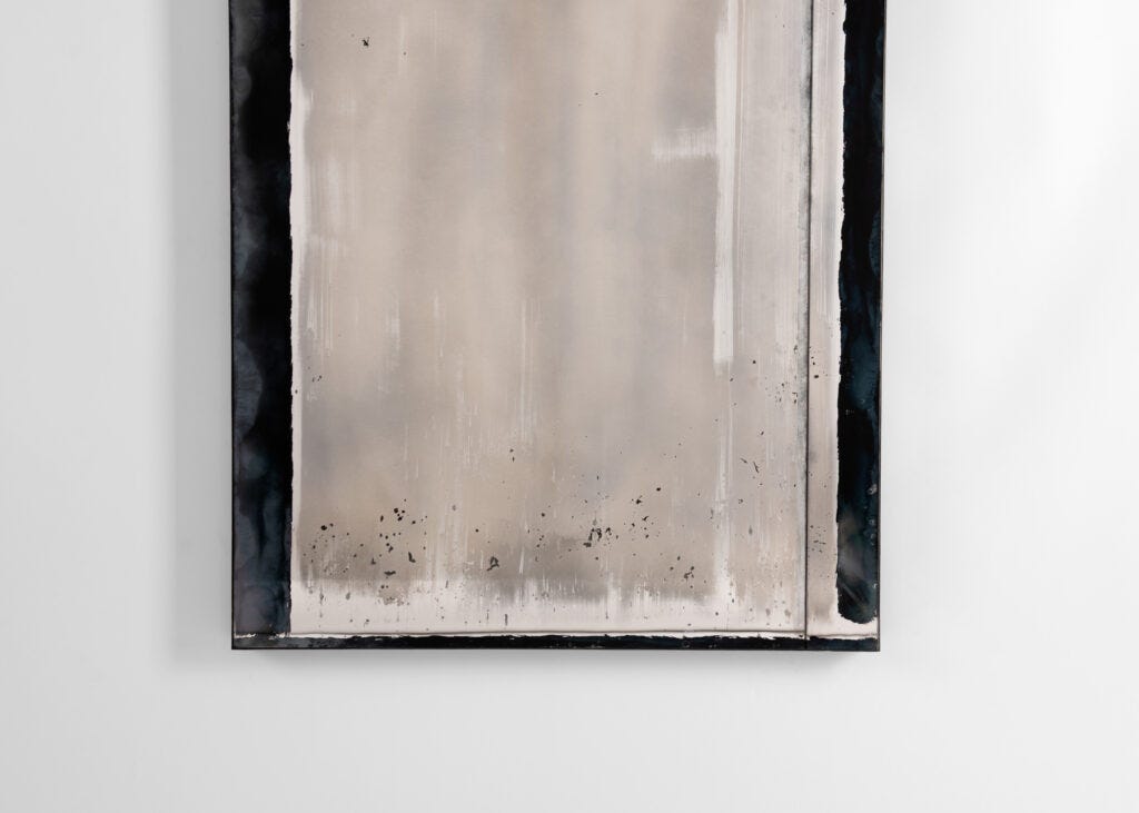 I have a special love for verre églomisé, the art technique of applying enamel and metal leaves onto the reverse face of glass, transforming an ordinary glass sheet into sculptural artwork. While the technique dates back to the pre-Roman era, it was particularly popular during the 18th century. When I started my studies in the history of decorative arts, I came across many examples in the collection of the Met, where the upper parts of mirrors in early American furnishings were regularly embellished with painted scenes from everyday life in the most naïve, folk-art manner. The art of verre églomisé is still alive today, practiced by a handful of artists who have given the ancient technique a new face. Today, I visited a new exhibition called Kiko López: Smoke and Mirrors at Maison Gerard—a solo show of the glass artist who has reinvented the technique in his own way, merging verre églomisé style with the art of the mirrors. The exhibition presents a series of mesmerizing mirrors embellished with abstract patterns, completely absent of the narrative that was so central to the art style in its early stages.