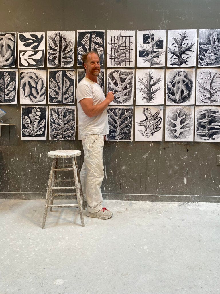 Antonson’s inspiration from his travels have continuously expanded his vocabulary, sometimes in unexpected ways. In a recent trip to Puglia, for example, he was inspired by a massive fig tree and started drawing individual leaves, continuing when he returned to the studio. The fig leaves, with their flat, broad form and thick veins do have a unique form which has attracted artists for centuries. Antonson has worked this into his vocabulary. The same goes with cardboard, which he recently discovered as a foundation for objects because it is both light and can be easily covered in plaster.